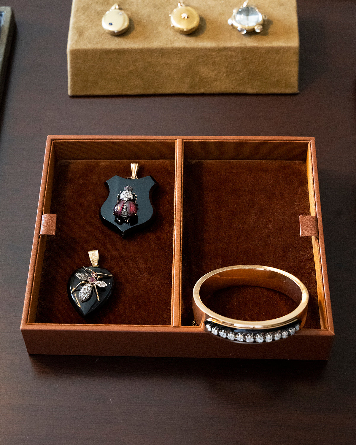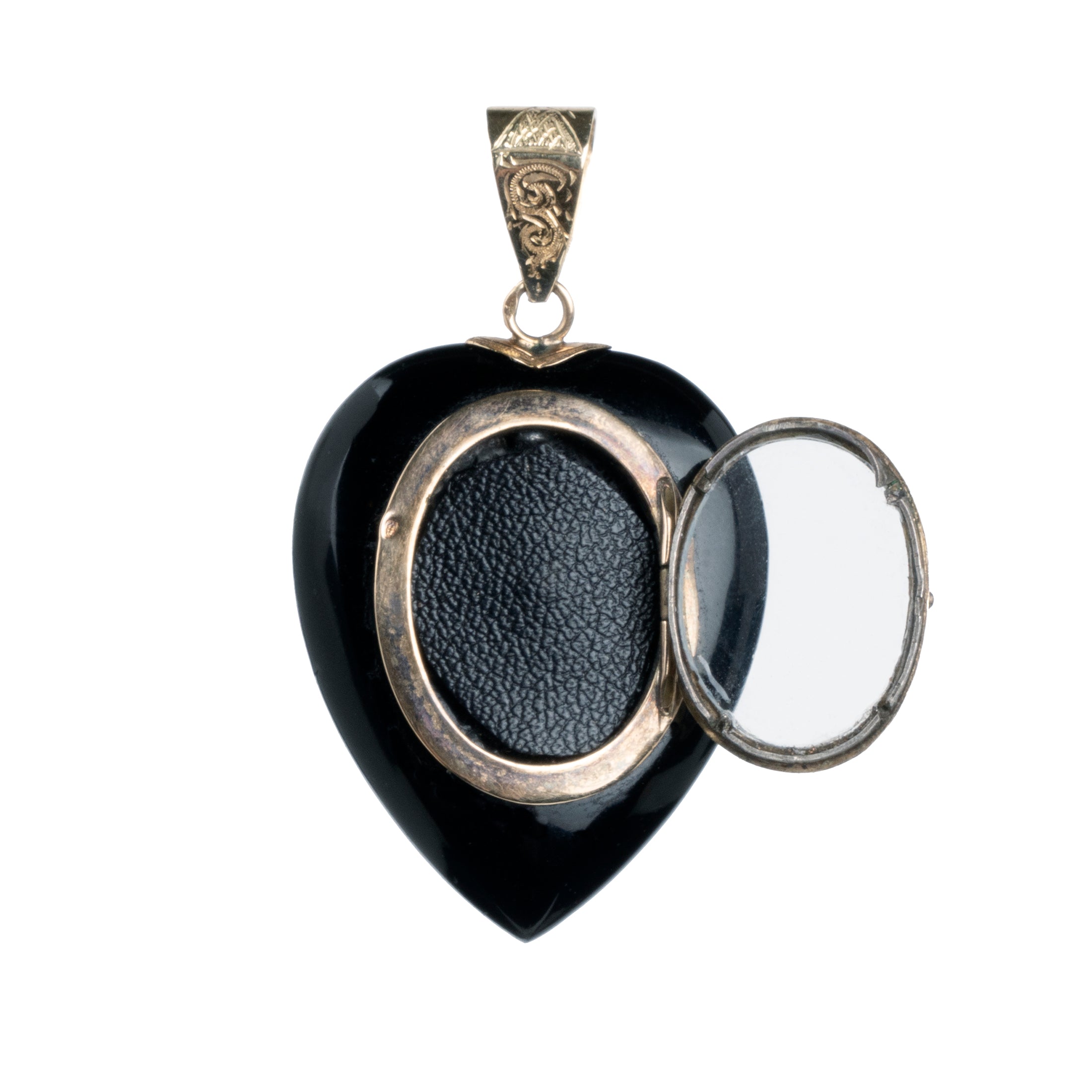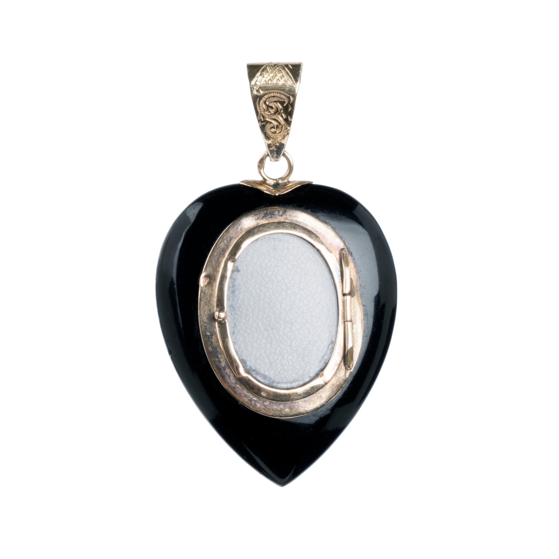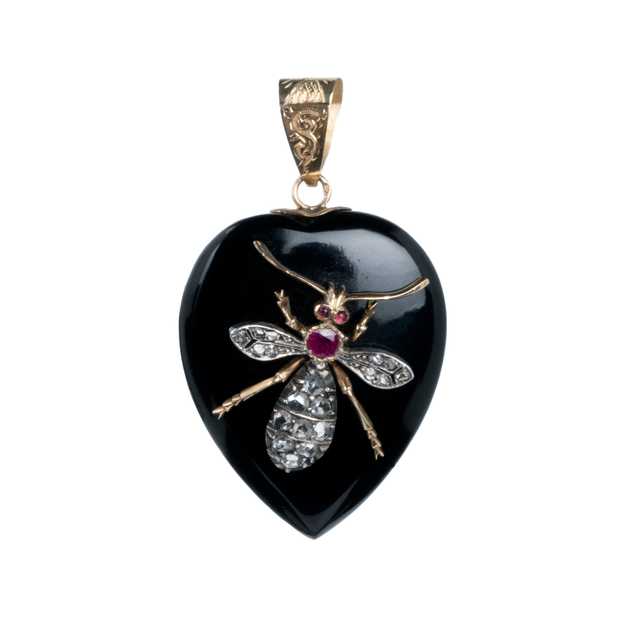 An unusual locket in the form of a heart with a bee depicted in diamonds and rubies. The carved single piece of black onyx has a glass door on the reverse that opens to reveal a compartment. 14 karat gold details. Dutch in origin. Circa 1890.