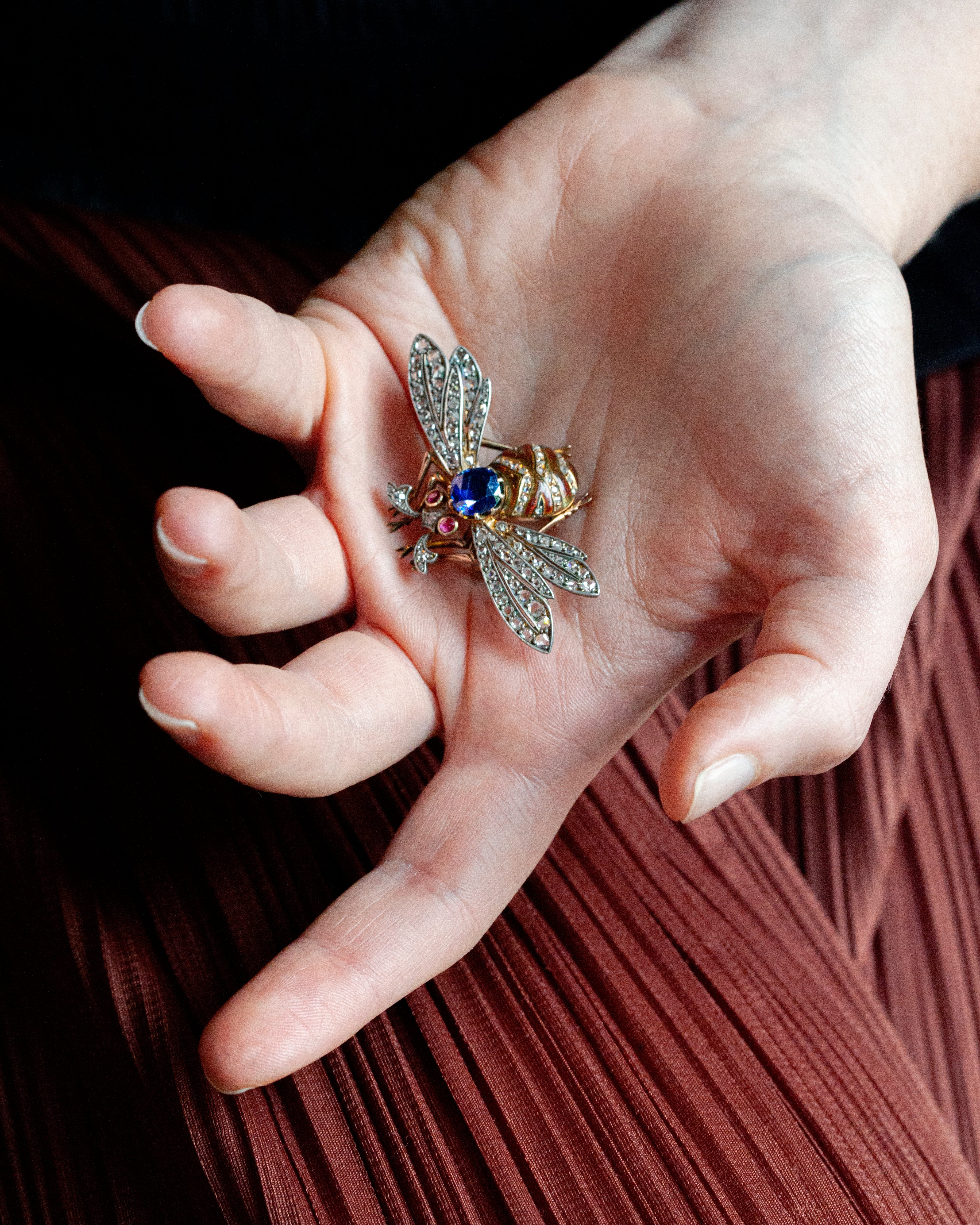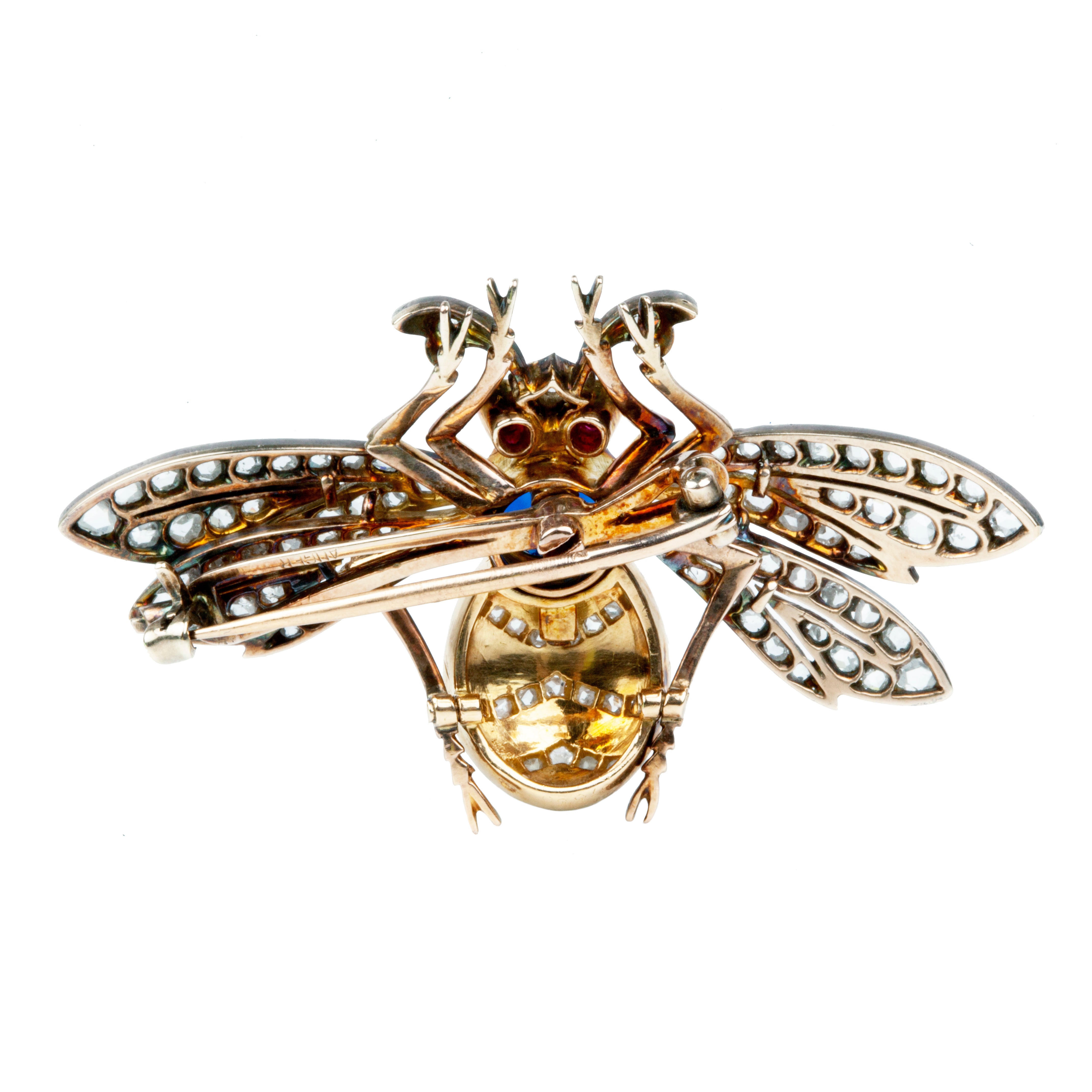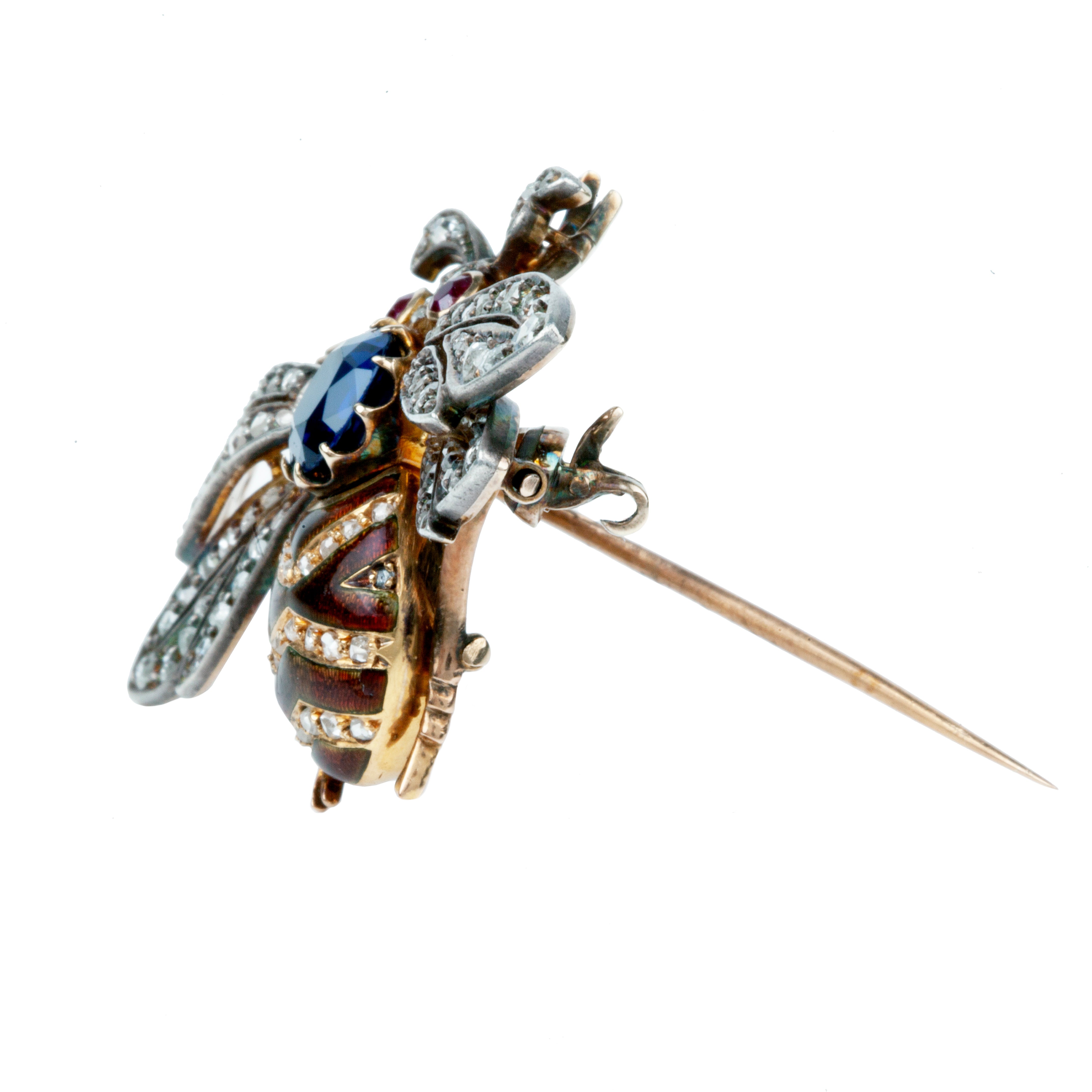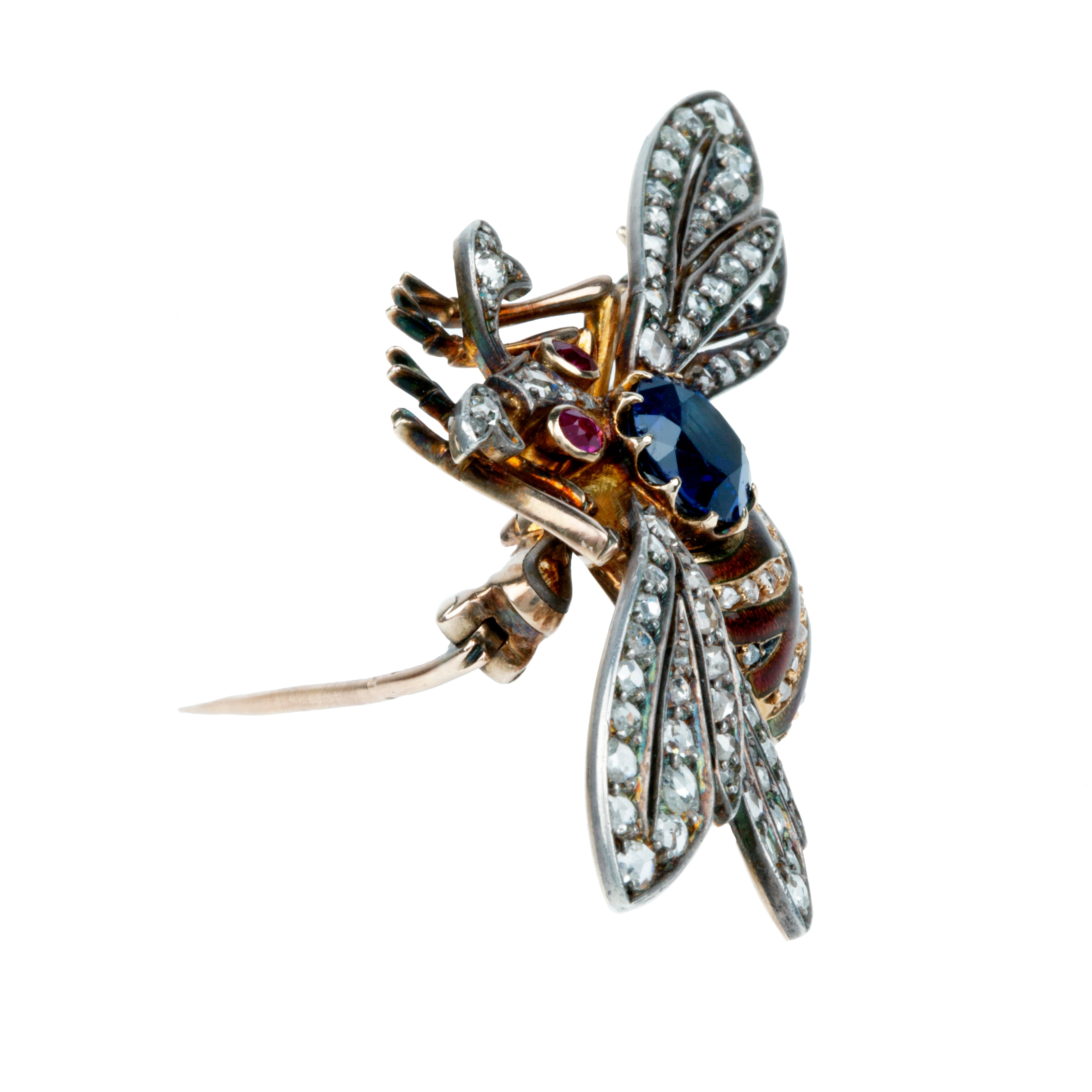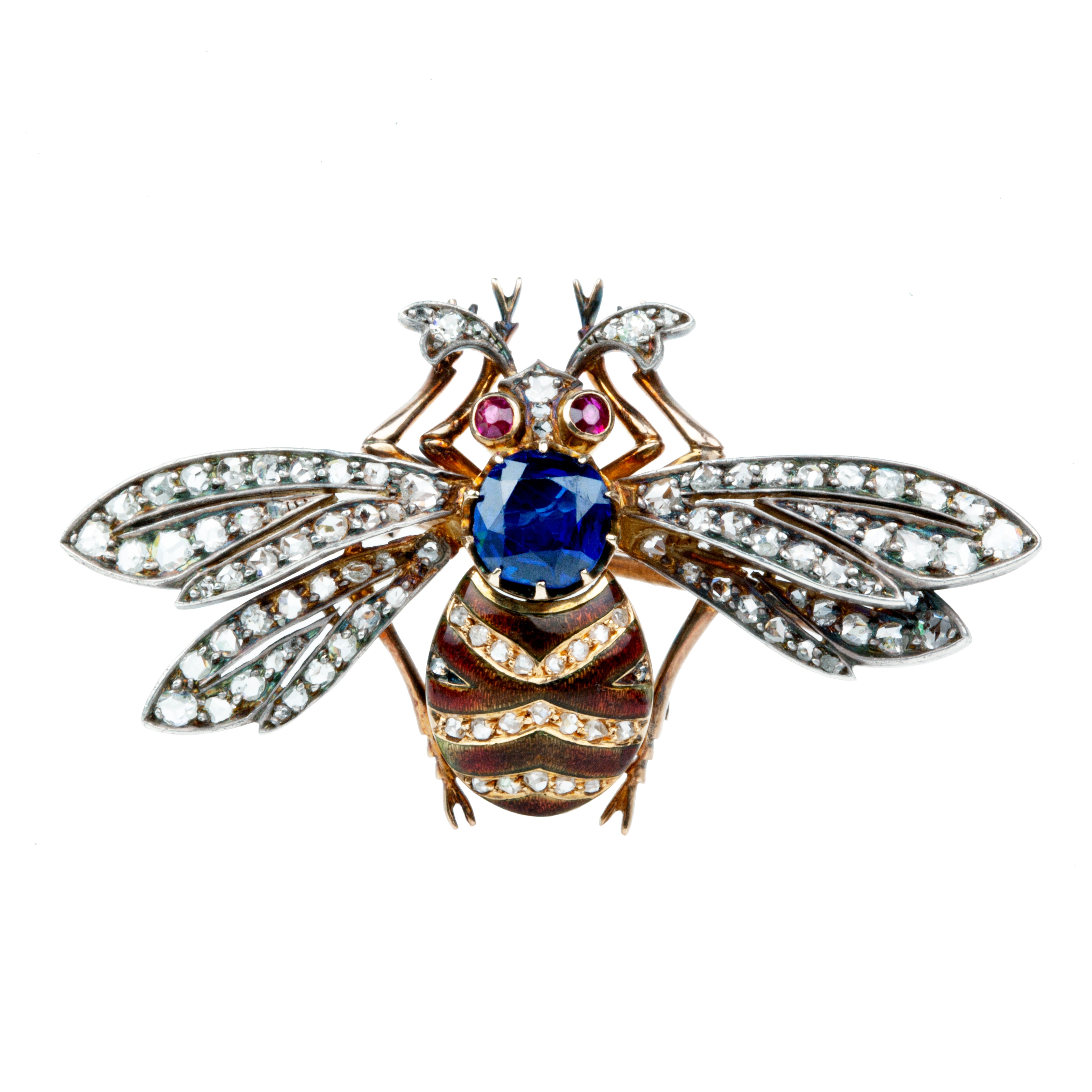 Antique sapphire and diamond bee brooch, in 18k gold. Approximately 2 carat central natural blue sapphire, with rose cut diamond and ruby eyes. Pierced platinum-topped wings and realistic enamel details. Continental European in origin. Circa 1900.