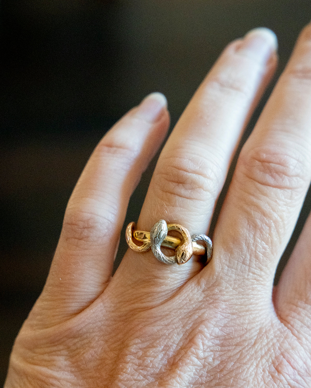 Antique twin snake ring, in platinum and gold. This unusual example has two open mouthed snakes entwined around a rose gold band. A rare example of early platinum jewelry. Circa 1890.