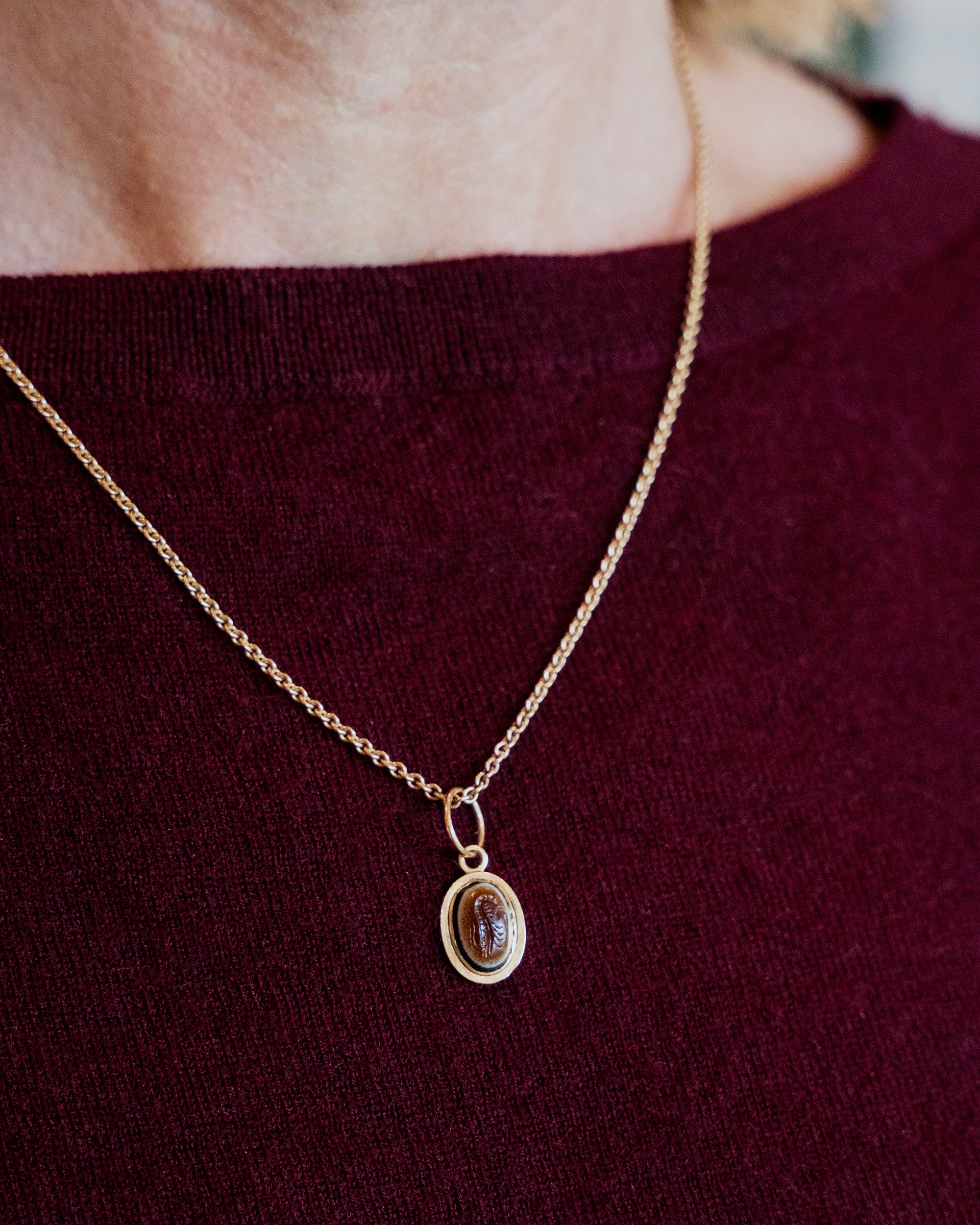 The pendant measures 0.90 inches in drop length. The intaglio measures 0.50 inches by 0.45 inches. Antique gold chains are sold separately and are available in-store. Please call or email the shop to inquire.