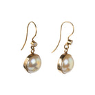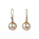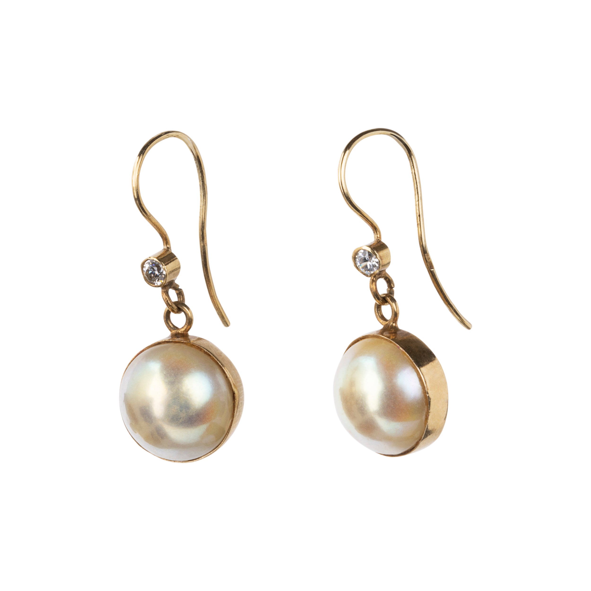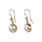 Pearls and diamonds are set in 14k gold. The pearls hang from bezel set brilliant cut diamonds.