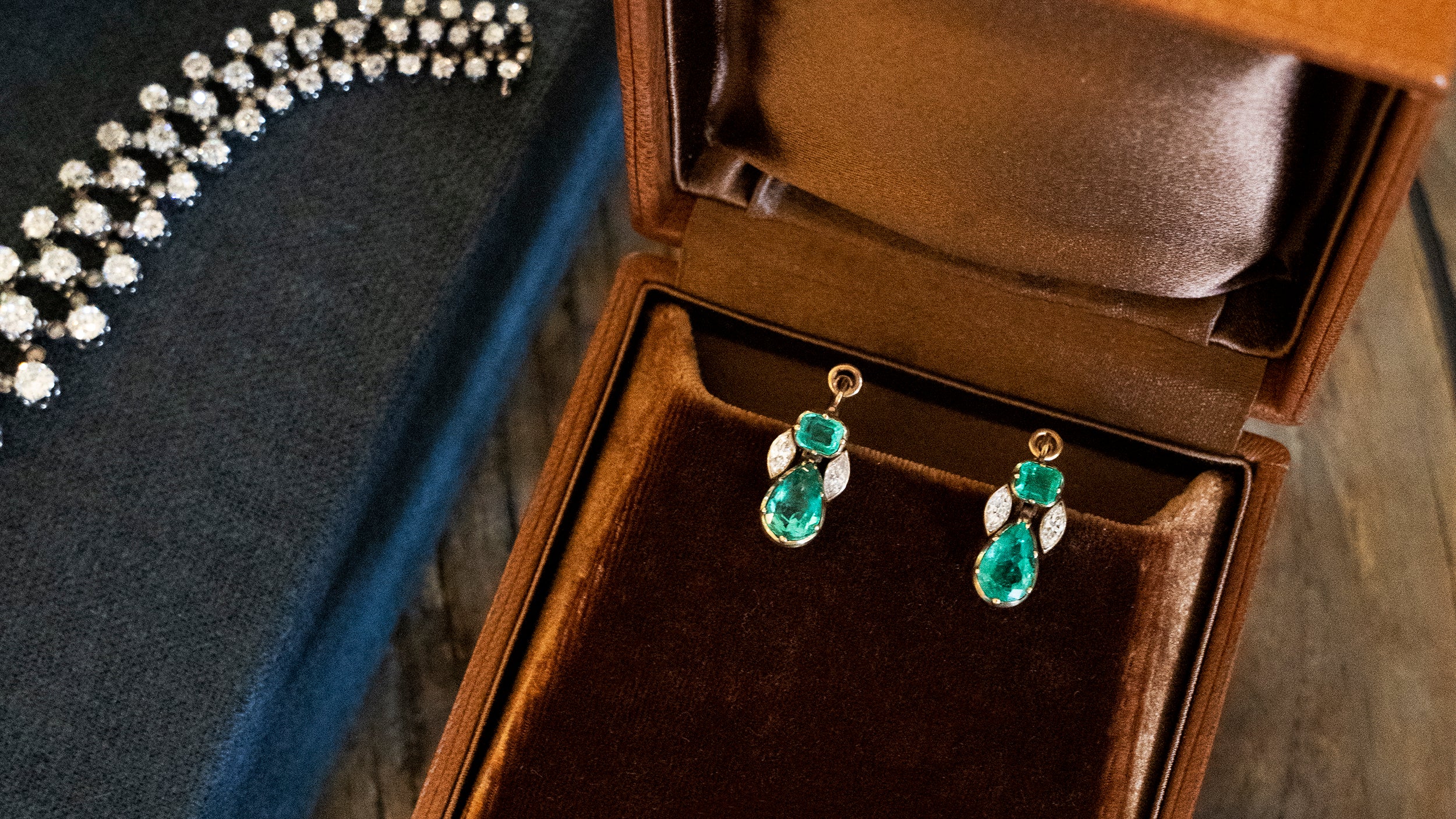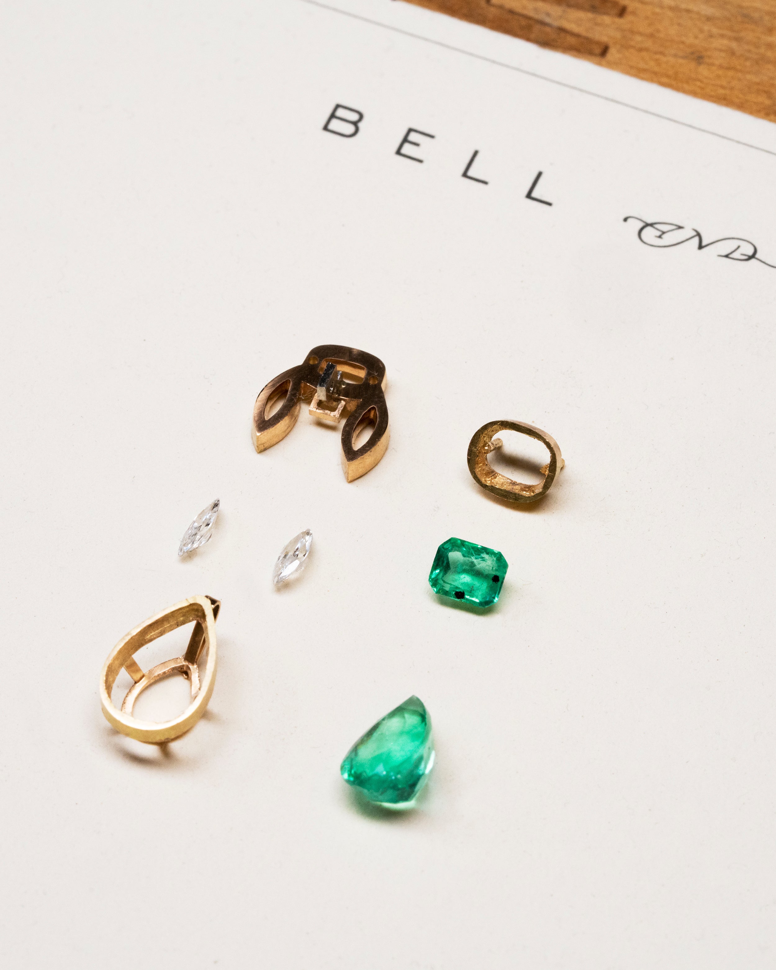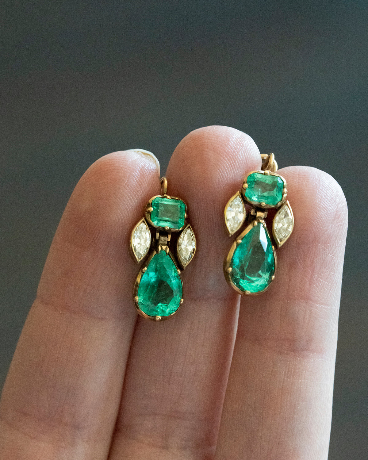 Bell & Bird emerald and diamond earrings in 18k old gold. The earrings feature two GIA certified pear-shaped emeralds, 1.79 carats and 1.99 carats, of Colombian origin, untreated with heat. Paired with four marquise diamonds.