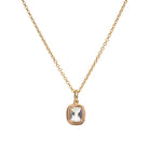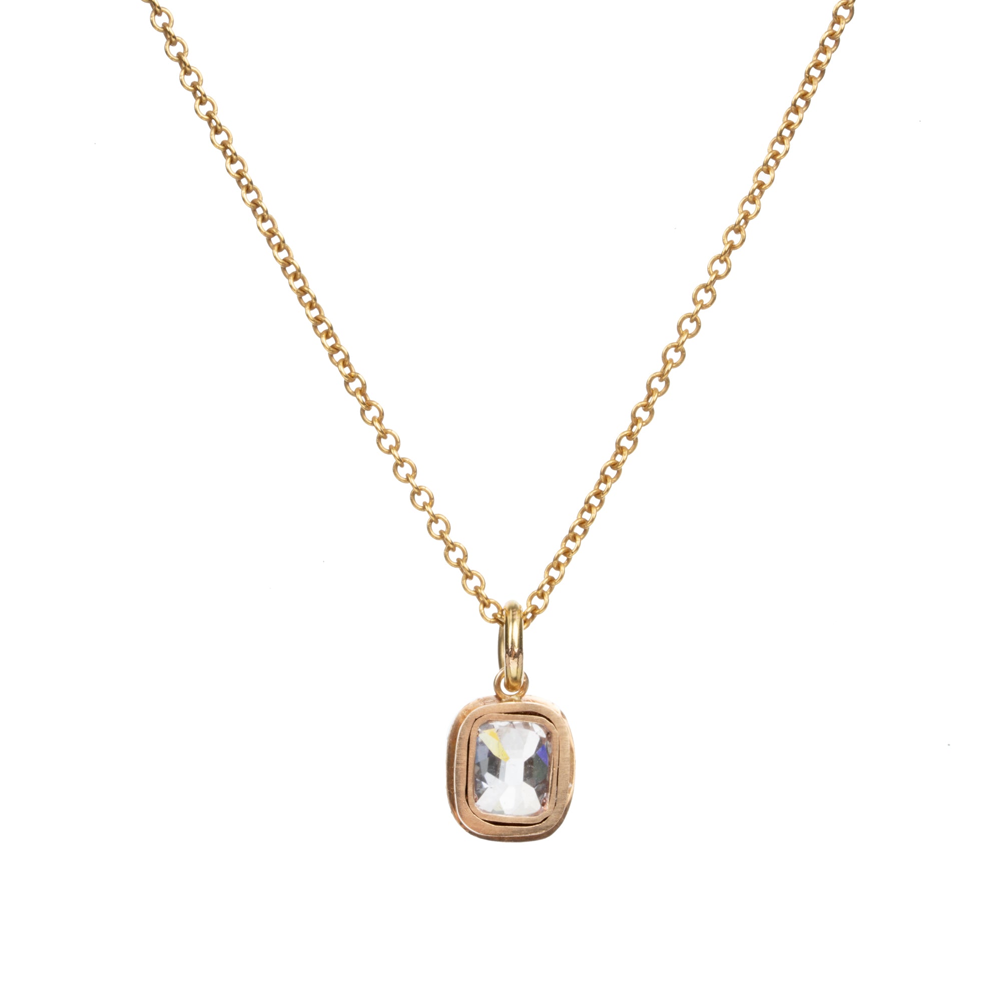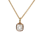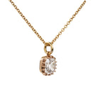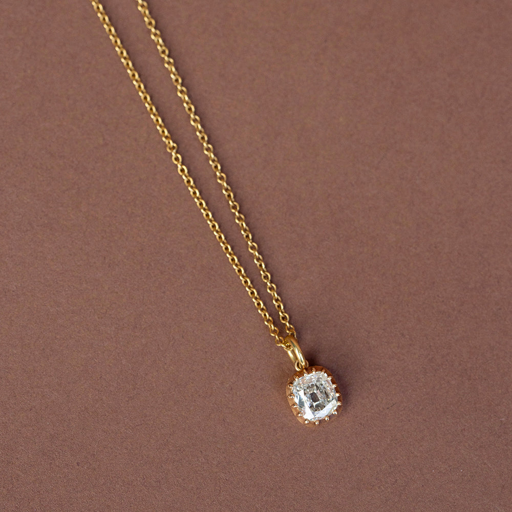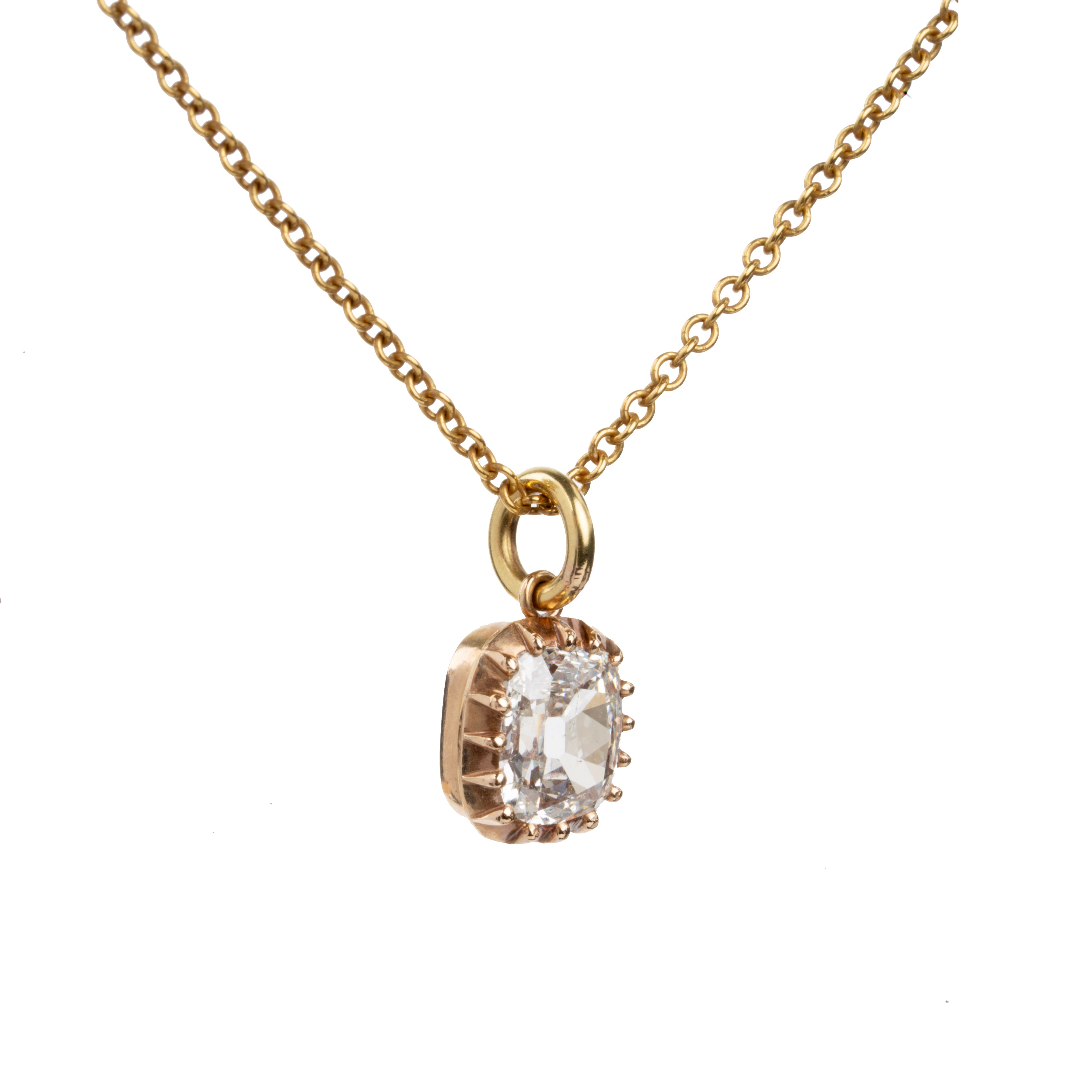 This necklace features an antique old mine cut diamond of 0.70 carats, I color, and SI2 clarity. The diamond is set in our pie-crust setting in 18k old gold. Suspended from an 18-inch 14k gold cable link chain.
