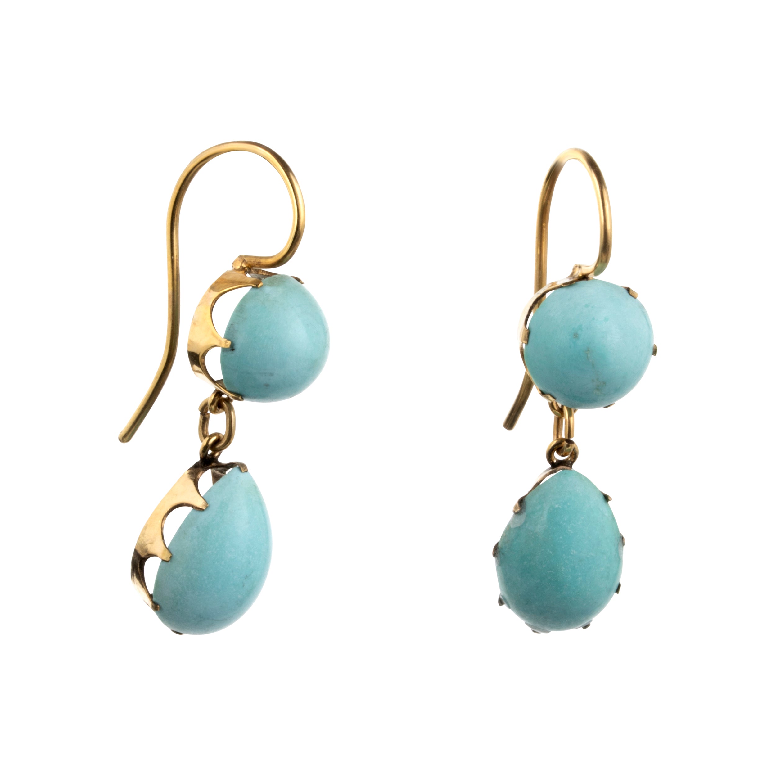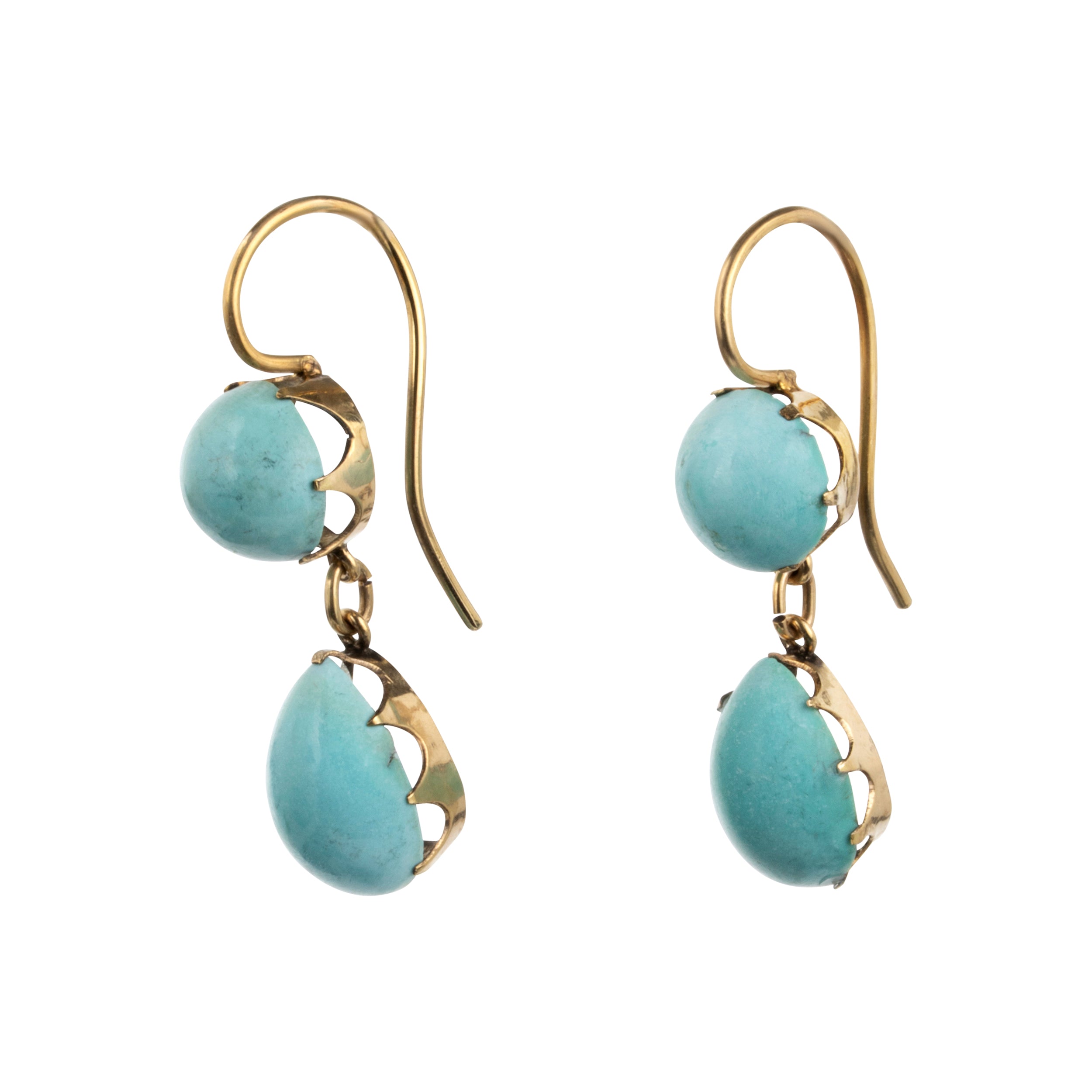 Persian turquoise round and pear-shaped cabochon drop earrings, in 18k gold.