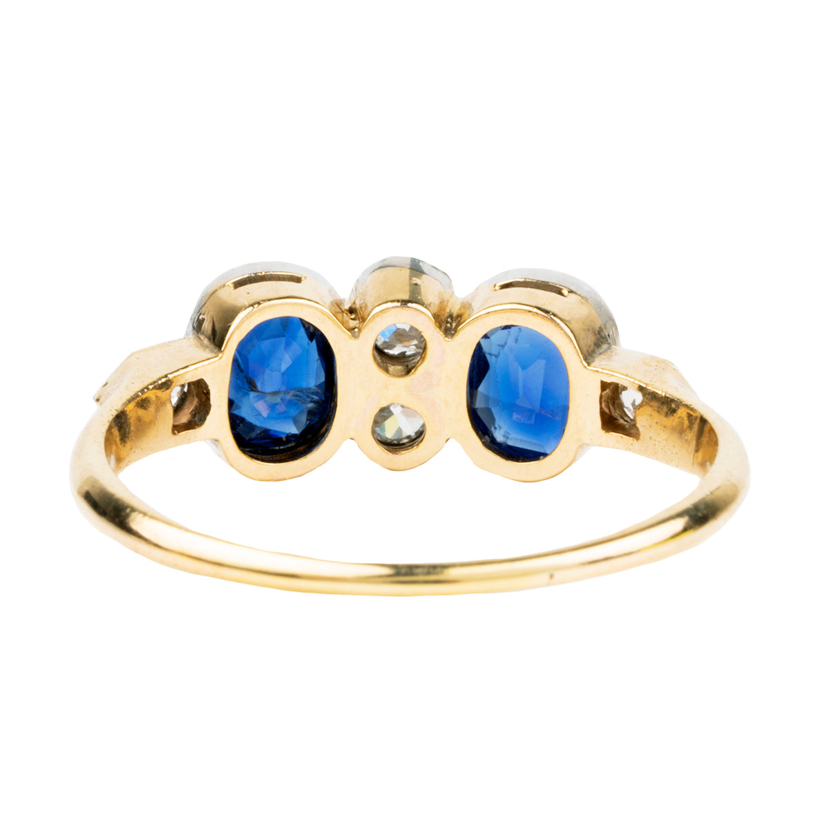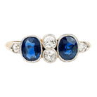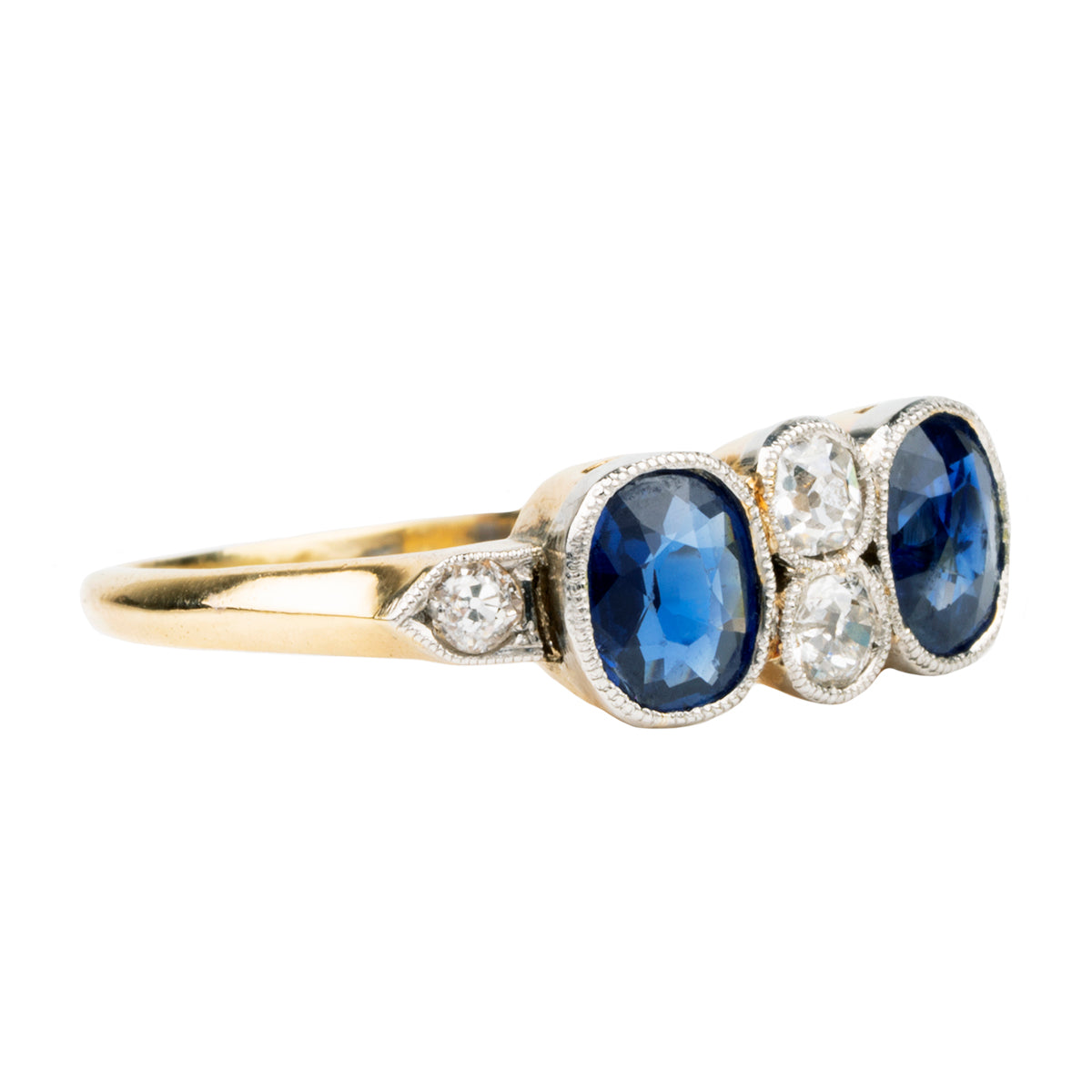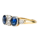 Edwardian sapphire and diamond ring, in platinum, topped 14k gold setting. Sapphires are approximately 1.25 carats in total weight. English in origin. Circa 1910.