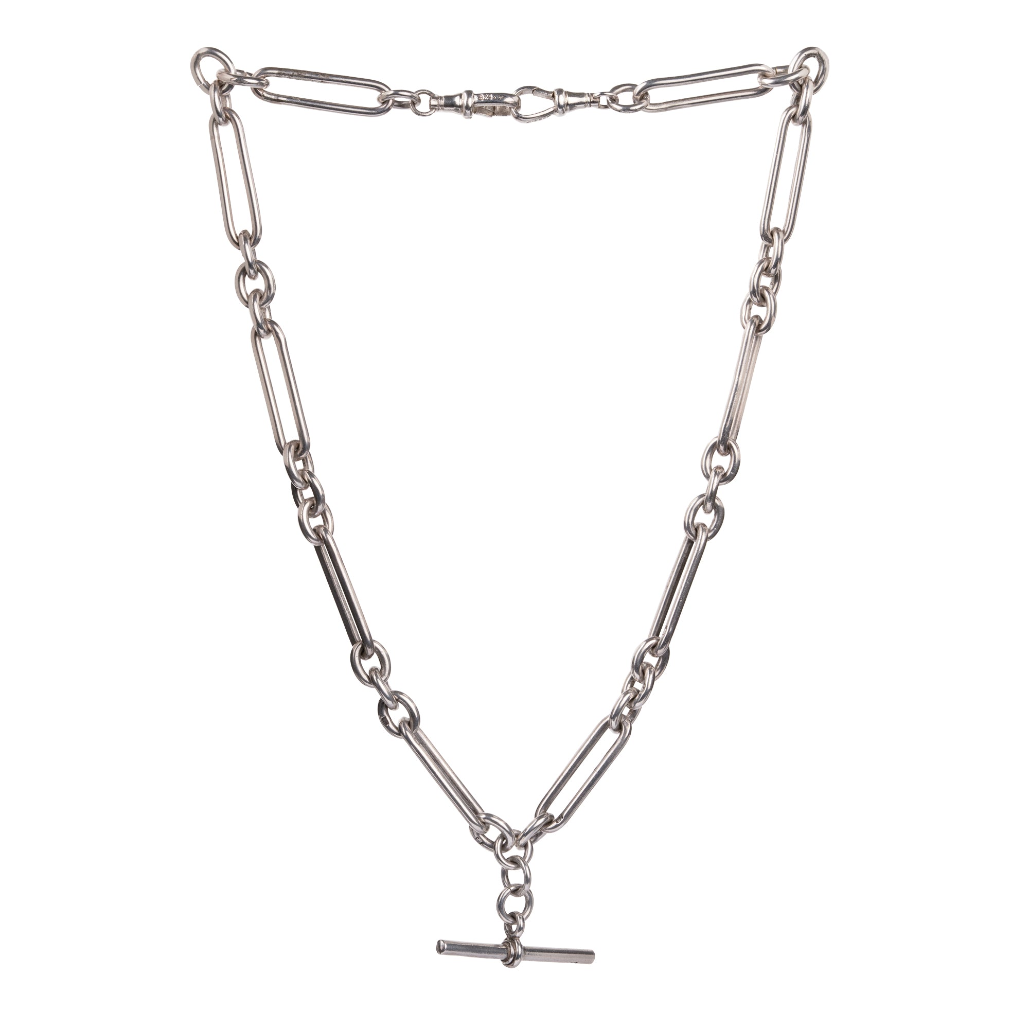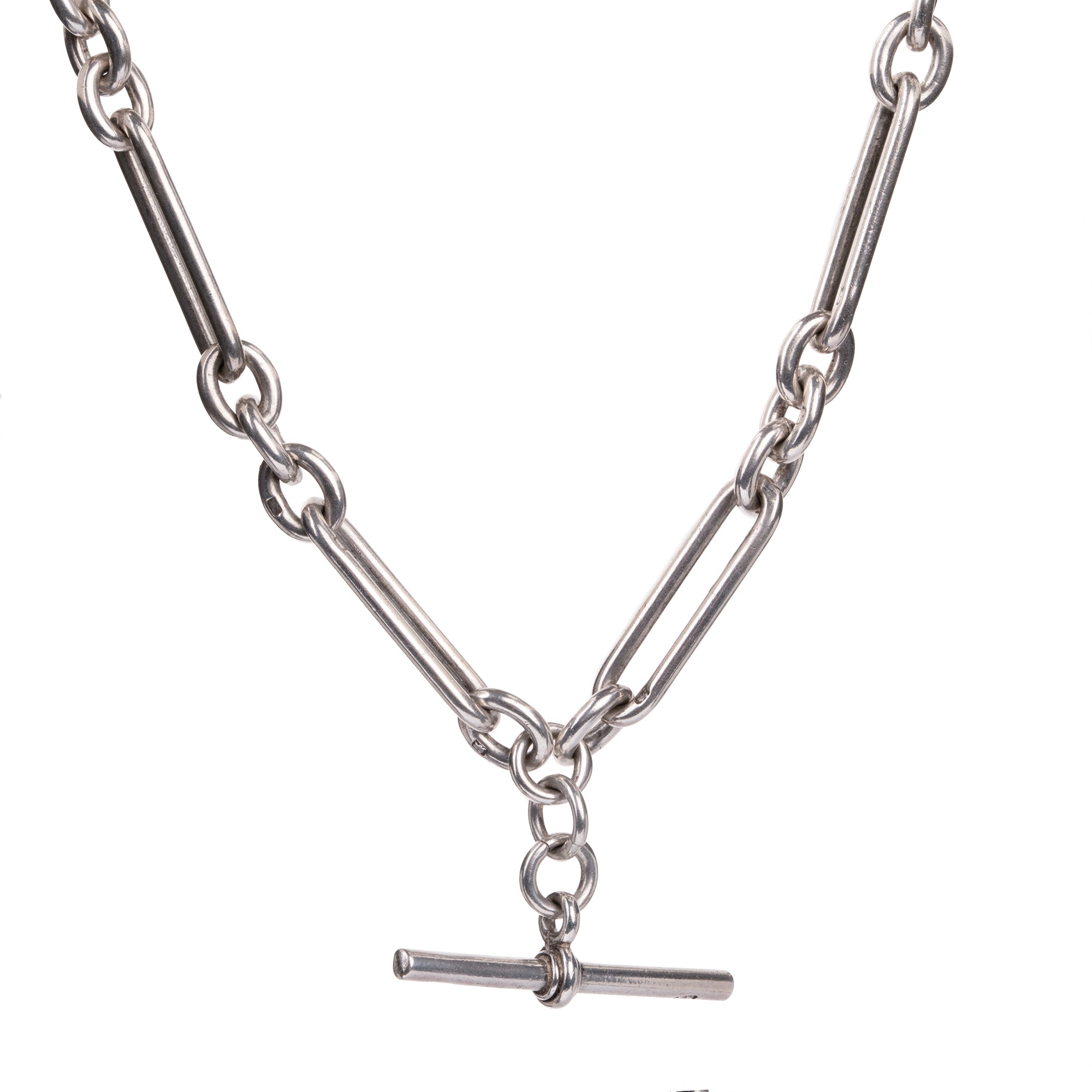Elongated links in this Albert chain necklace with toggle and the original swivel clasp. Nice heavy links are individually hallmarked. Perfect for everyday wear. Once part of a man's watch chain.