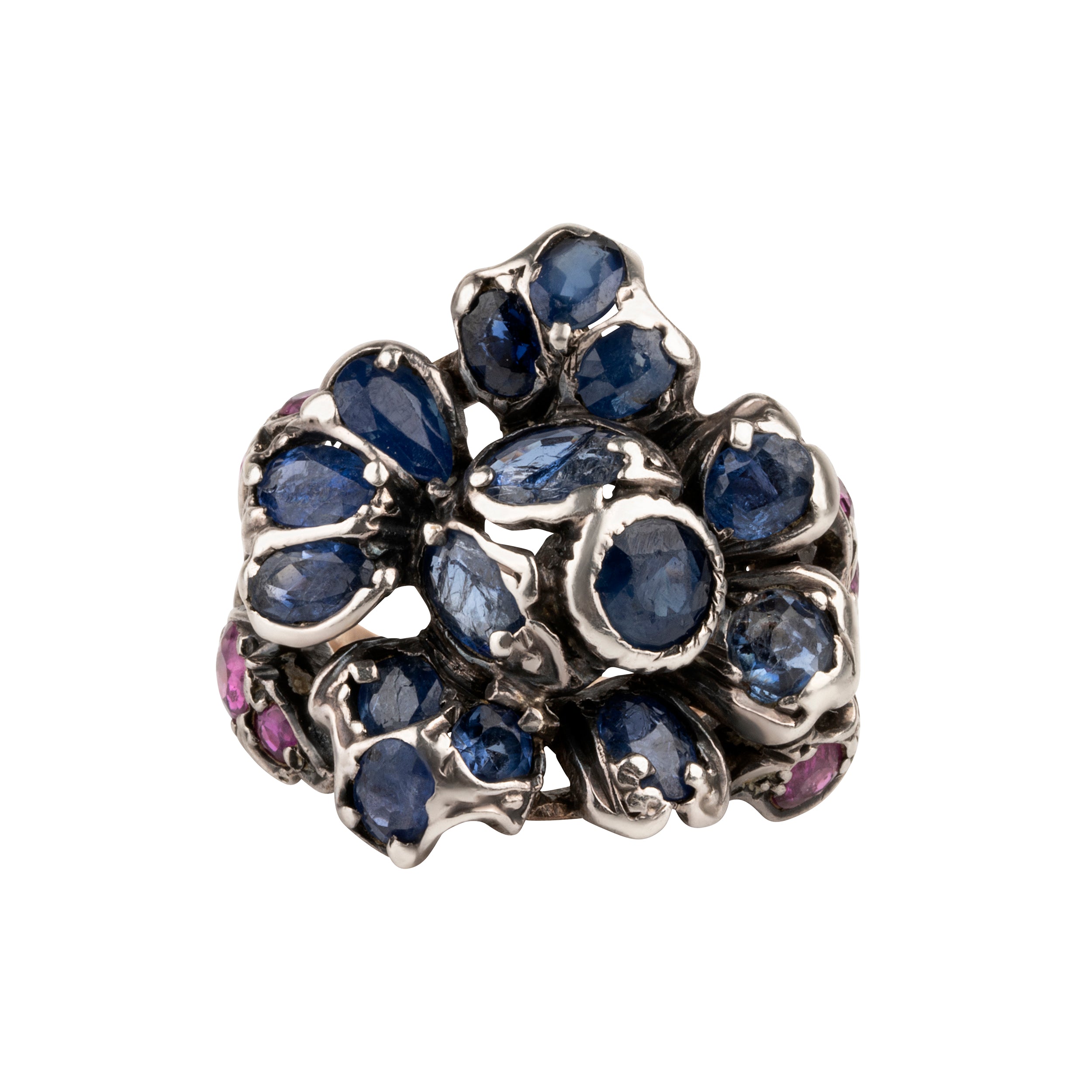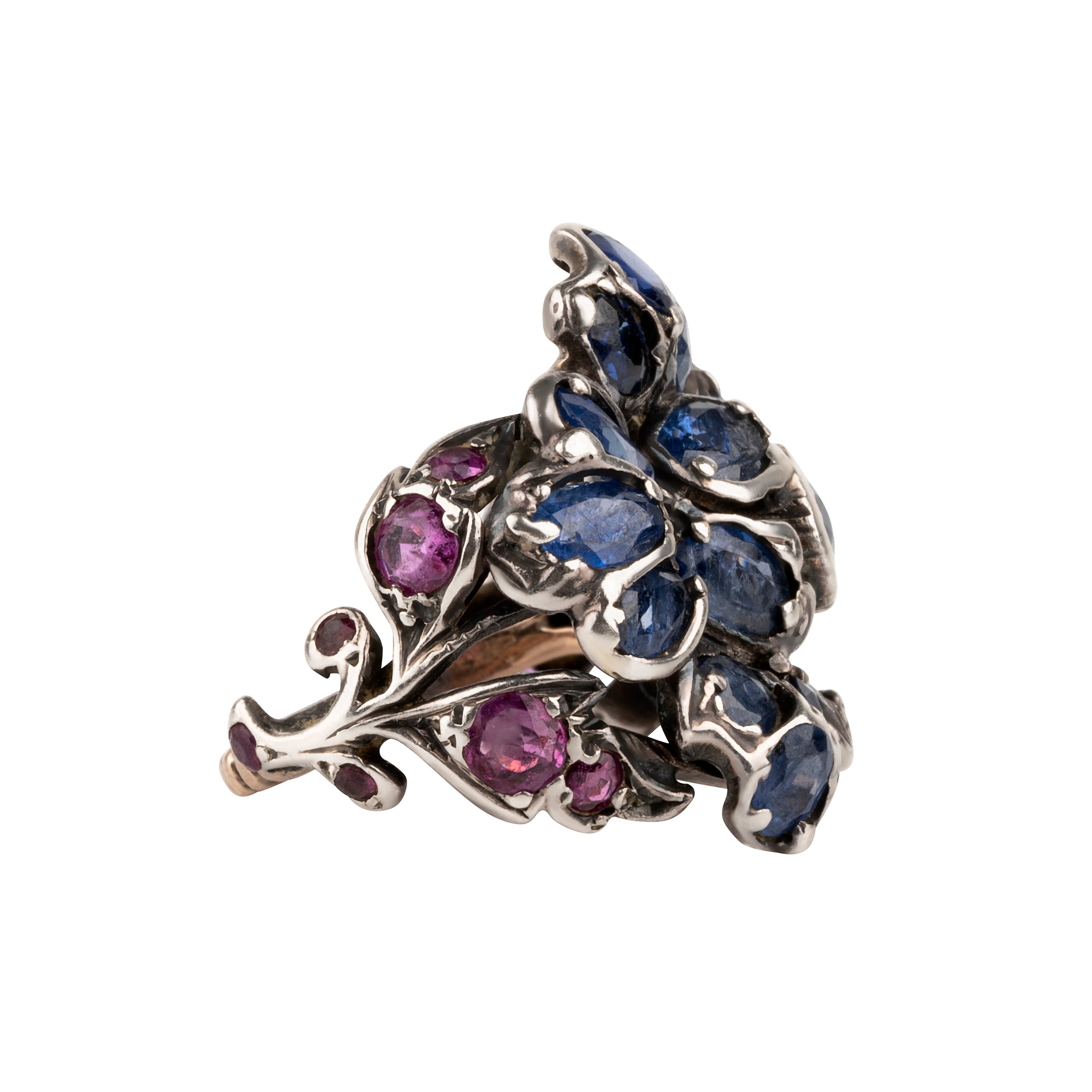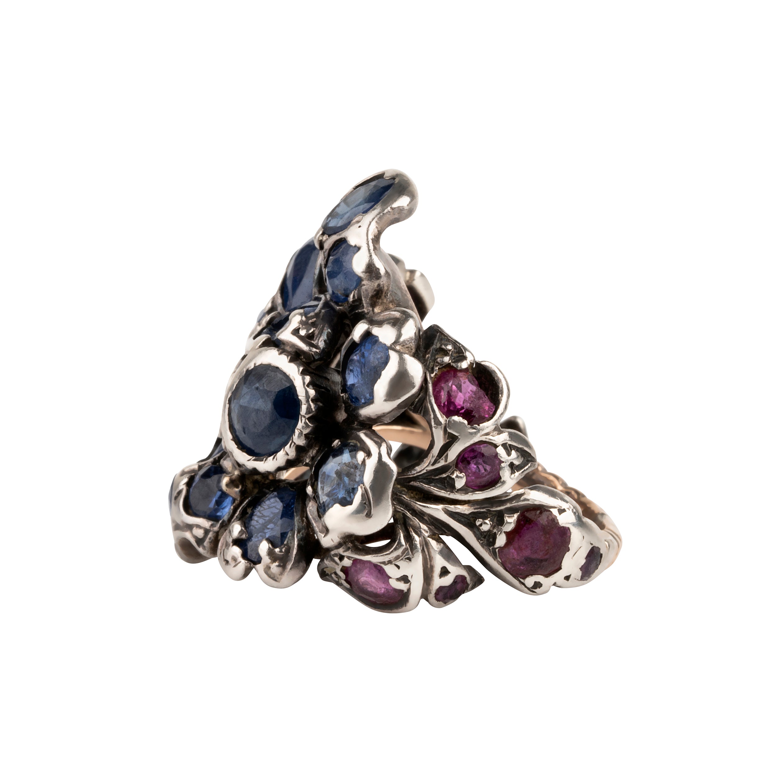 This design is inspired by a labor-intensive setting technique common in 18th and 19th century rings. The silver-on-gold technique is true to the rings that inspired this design and are rarely seen in modern jewelry.