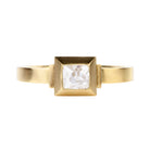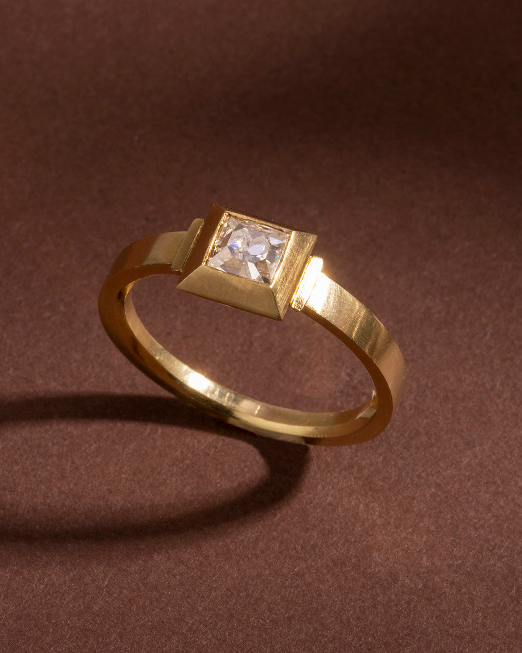 A very simple solitaire setting inspired by renaissance table cut diamond rings we have handled. The bezel setting allows the diamond to sit quite low to the finger. This ring features a rudimentarily cut 0.56 carat square cut diamond still revealing its natural octahedron-shaped crystalline structure. Made in our custom 18k yellow gold with a subtle soft finished polish.