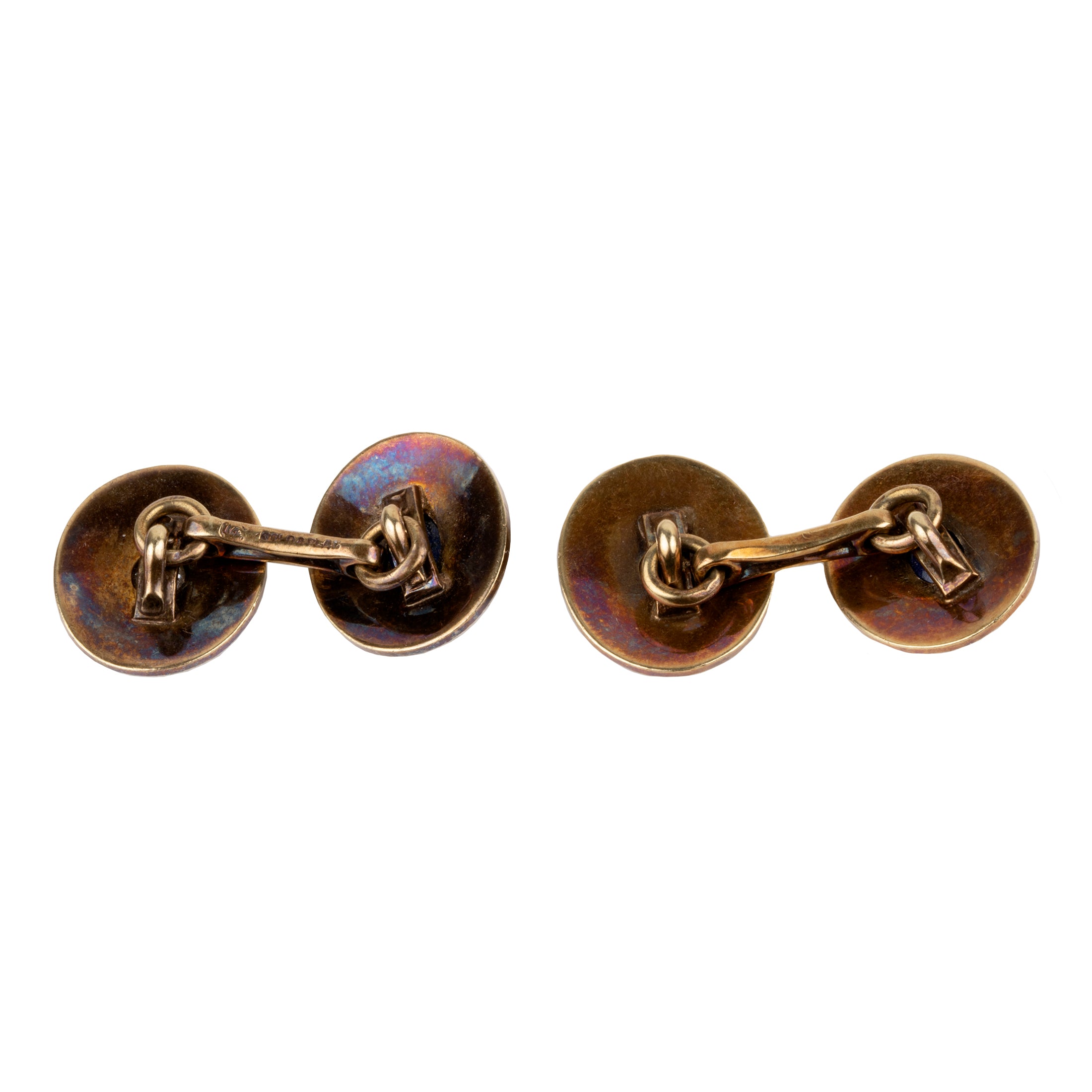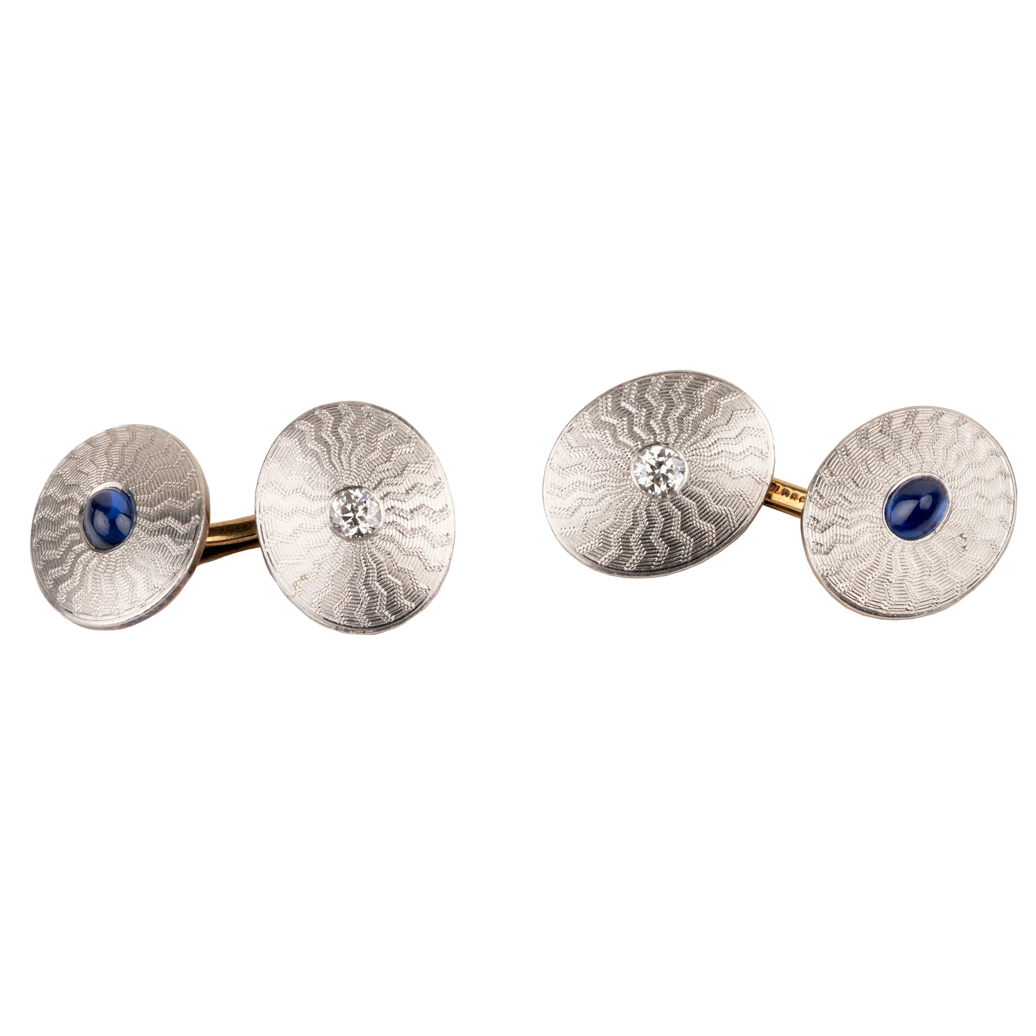 Turn of the century diamond and sapphire cufflinks, in platinum and 14kt gold. Two natural sapphire cabochons and two antique single cut diamonds with an engraved swirl pattern. American in origin. Circa 1920.