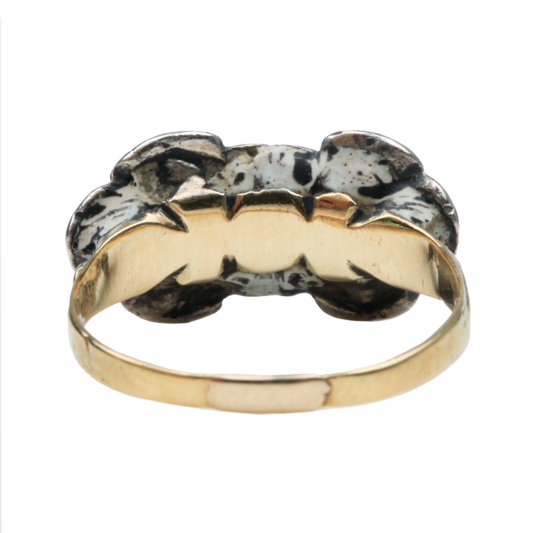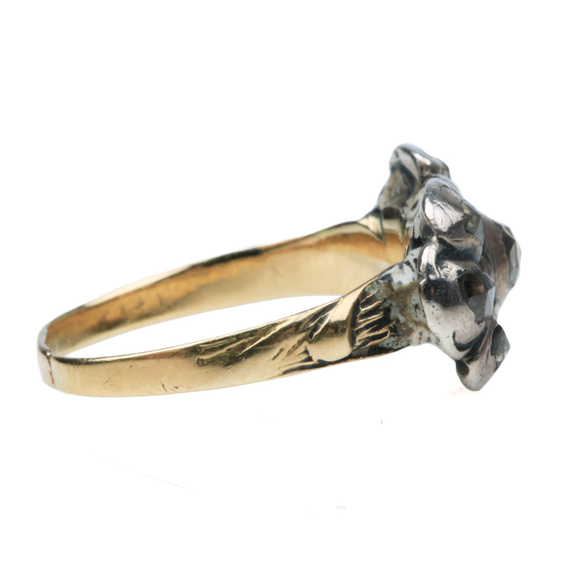 17th Century 7 stone diamond ring. Rose cut diamonds set in silver on gold setting, with enamel details on the back. Diamond are set in typical closed back settings. The ring has been previously resized. Continental in origin.