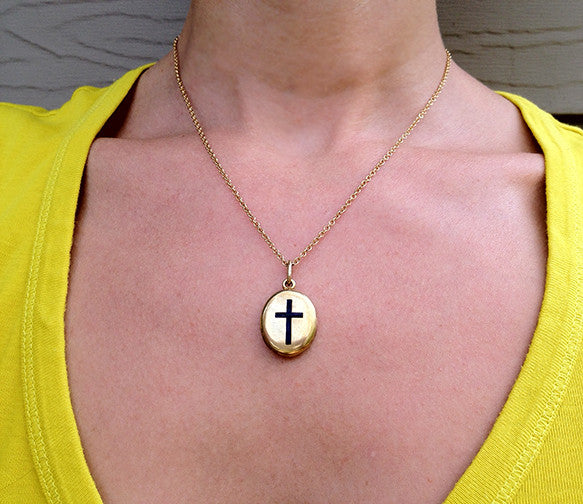Simple Victorian era cross locket circa 1864. Locket & chain in 18k Gold. Engraving reads April 2 1864