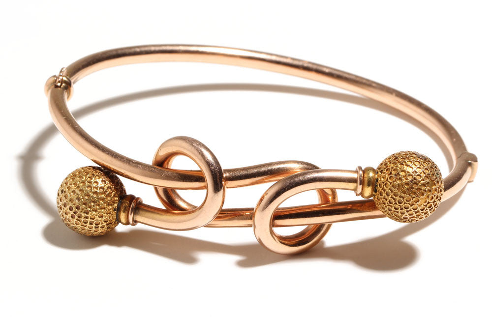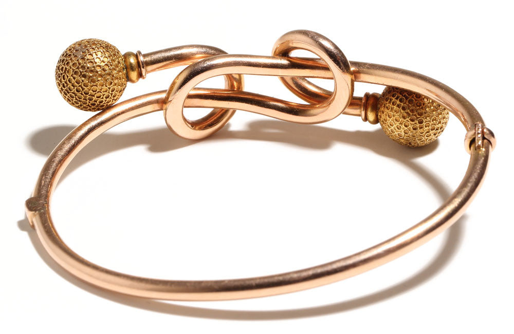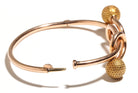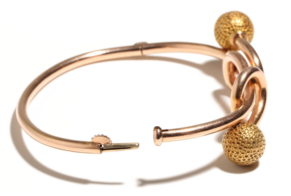 Crafted in an Etruscan revival motif in 9k rose gold. Ball ends in a brassier yellow gold.