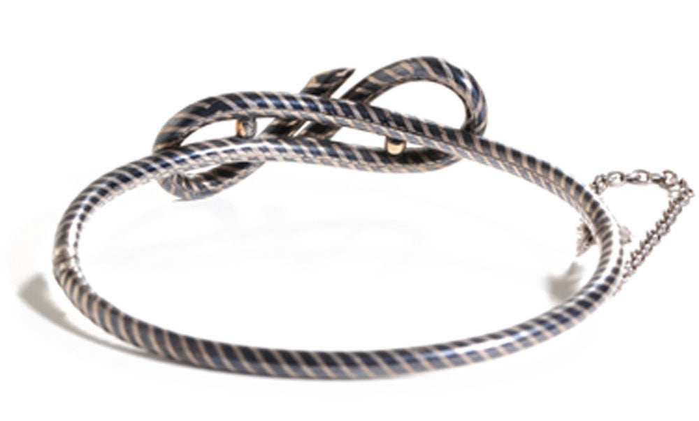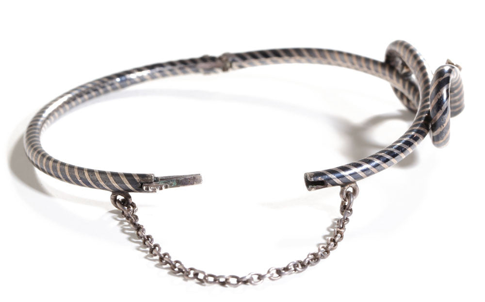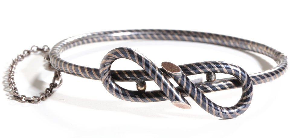 Neillo is a process similar to enameling where a black alloy is inlayed into the silver. The style is typically French or Russian in origin. More commonly seen in pocket watches and chains. A bangle bracelet is a rare find.
