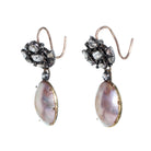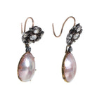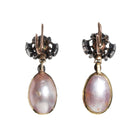 18th century rose colored blister pearl and diamond earrings from Denmark. 4 natural saltwater blister pearls set together to look like 2 whole pearls. The pearls are set in gold with 16 rose cut diamonds set in silver. Presented in original fitted box. GIA certified as natural salt water. Circa 1780. Danish hallmarks.