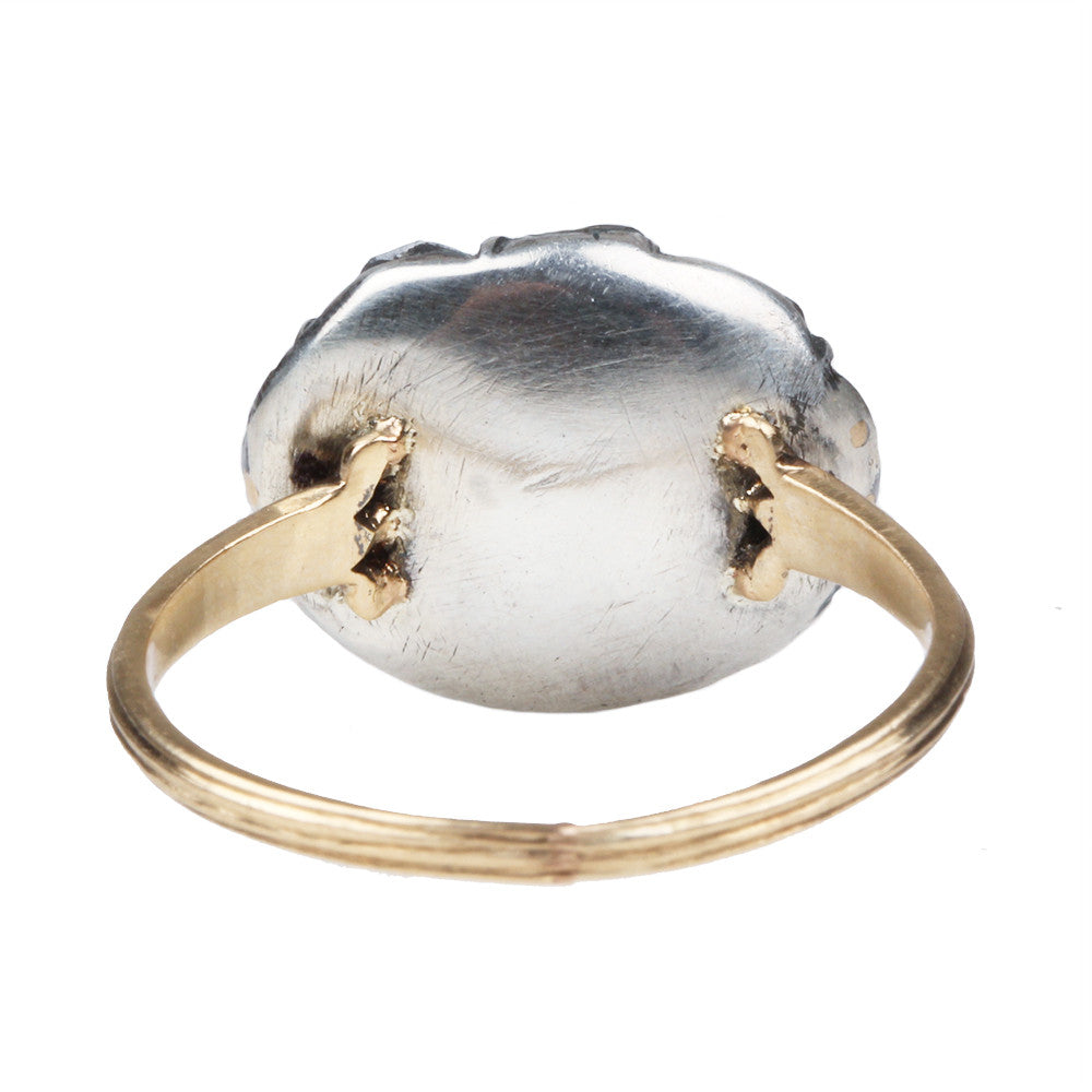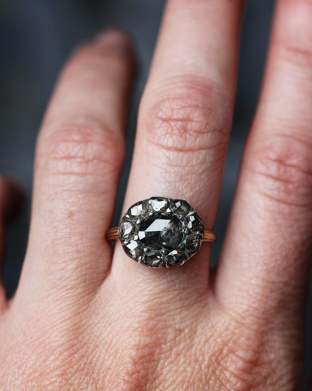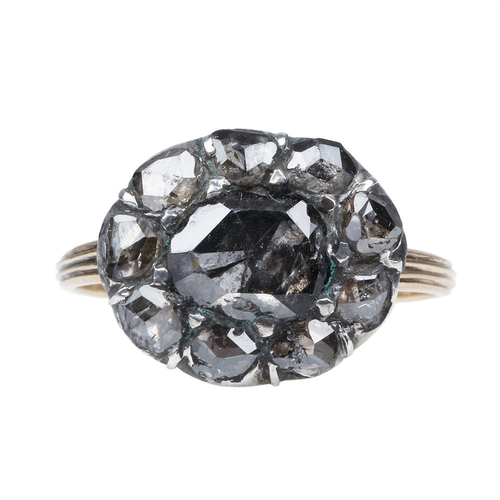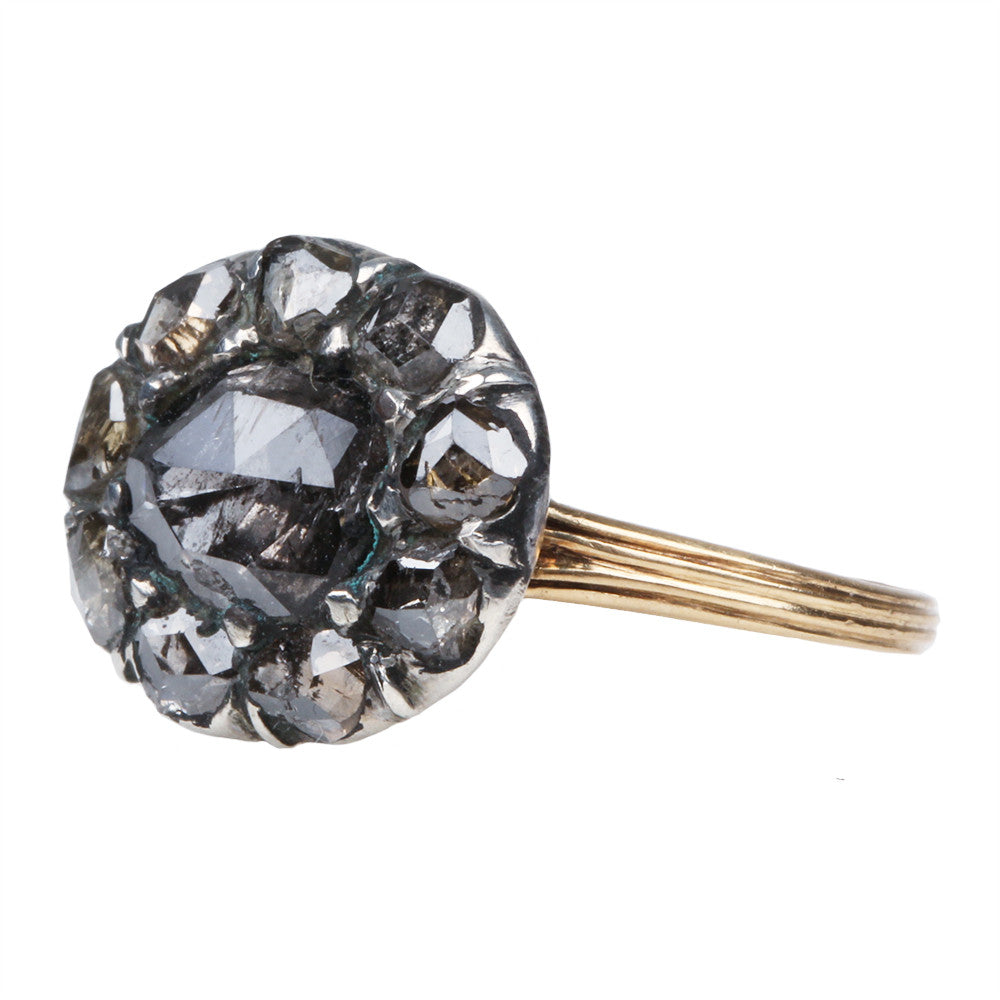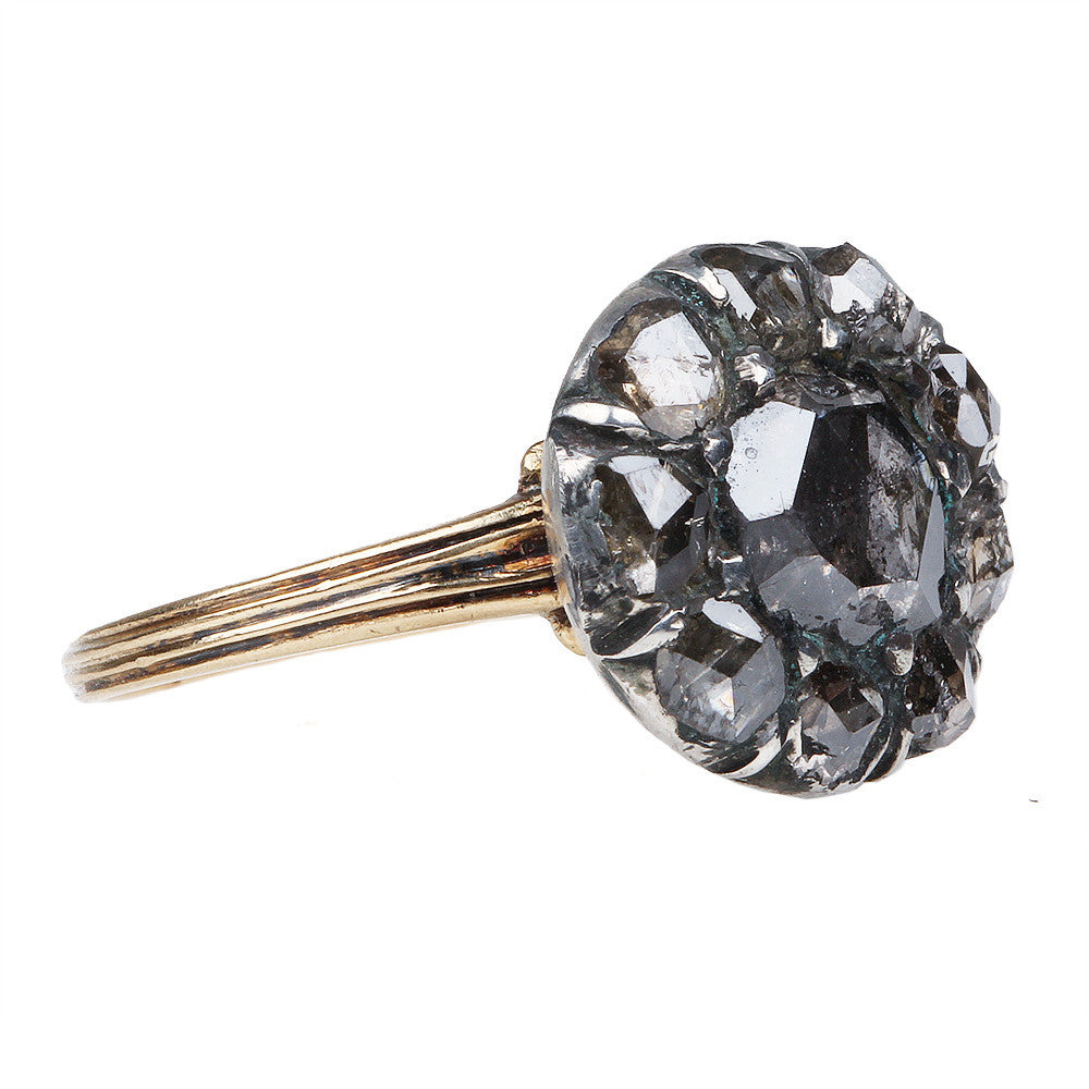19th century rose cut diamond cluster ring. Foiled back diamonds in silver setting on later gold shank. English in origin.
