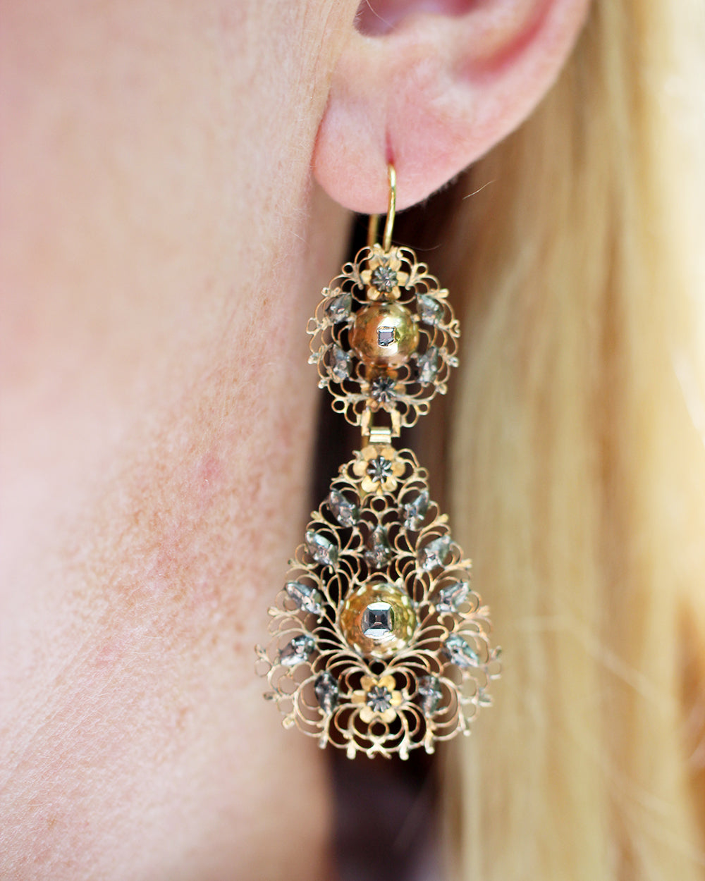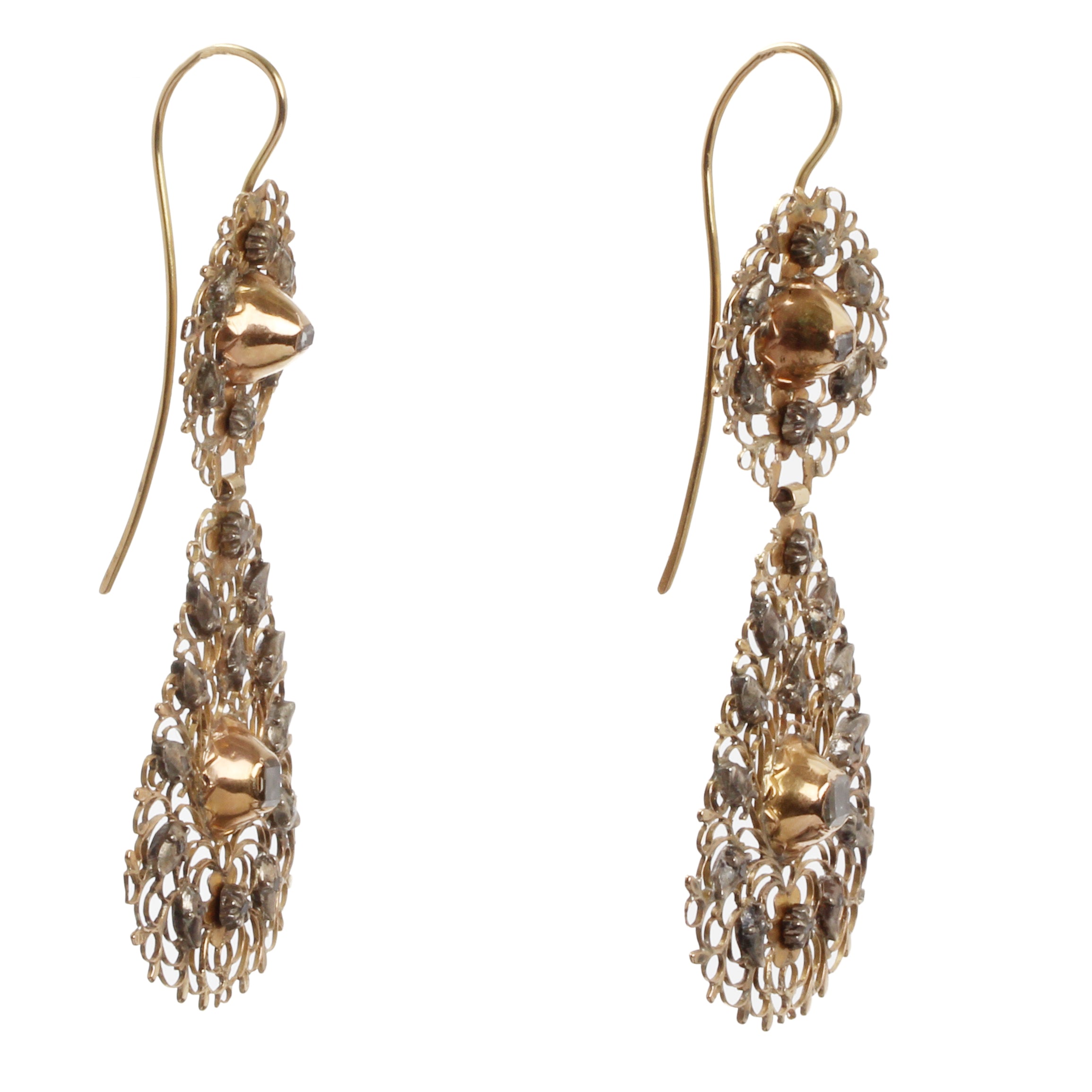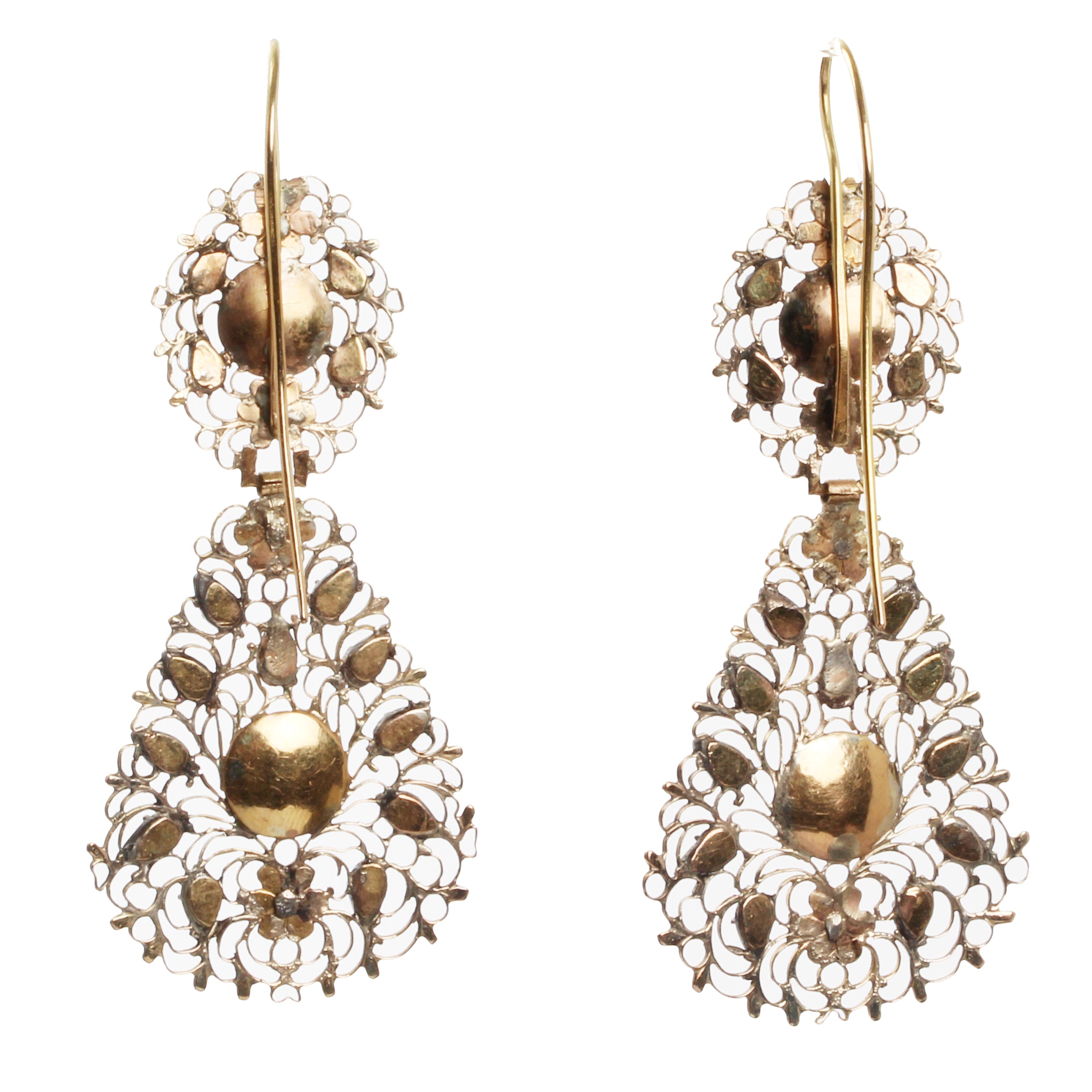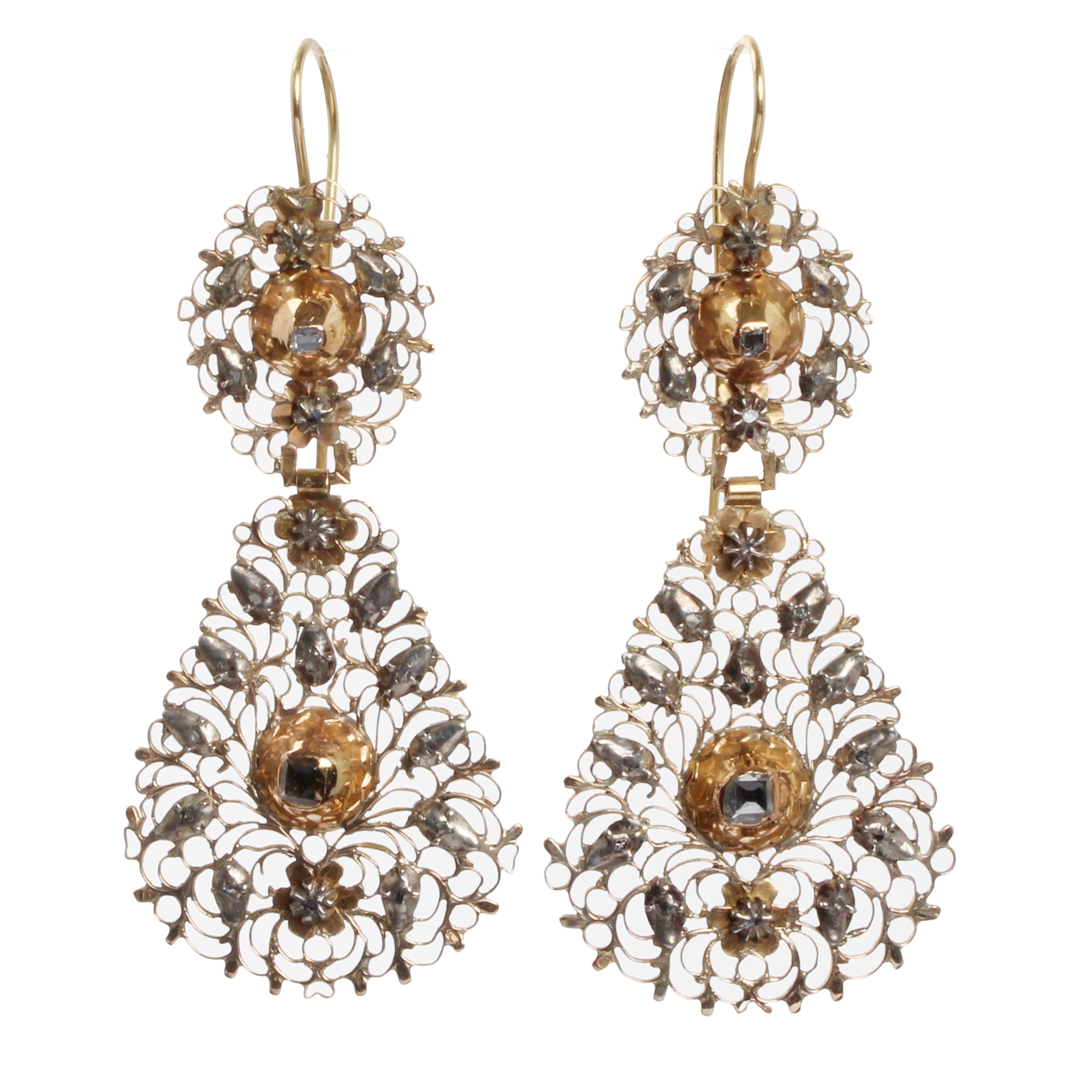 18th Century gold filigree and Table Cut diamond earrings. Silver topped gold closed back settings. Delicate details and lightweight. Portuguese in origin. Excellent condition with no breaks or significant wear.
