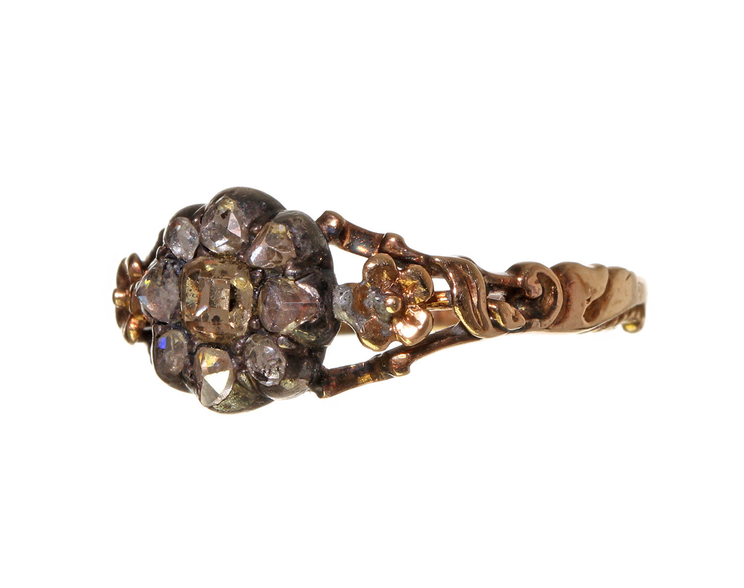 18th century Georgian diamond cluster ring. Central table cut diamond surrounded by rose cut diamonds. Trifurcated shank with forget me not flower details, often used as love tokens in jewelry. Closed set cutaway settings have been opened up from the back previously making the ring suitable for daily wear. Good overall condition. One old solder repair that will be cleaned up upon sizing. Difficult to find a ring this early in a cluster style. English in origin. Circa 1780.