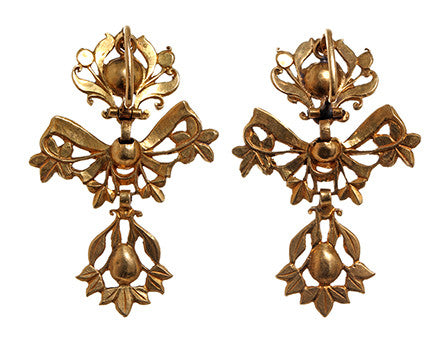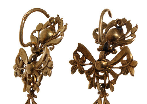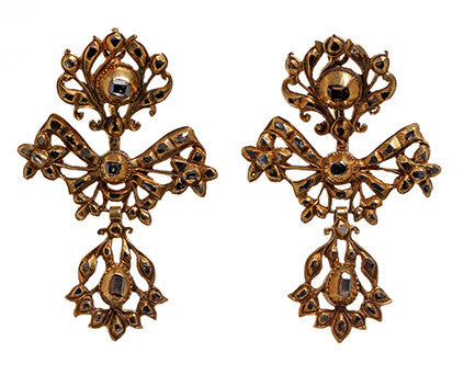Beautiful late 18th century diamond earrings in a classic pendeloque motif which is a ribbon bow surmount with an elongated drop. Spanish or Portuguese in origin. In the Iberian peninsula this style persisted into the early 19th century.