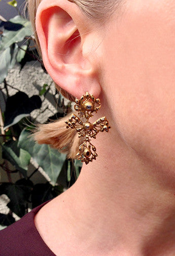 Table cut and rose cut diamonds in 18k yellow gold. Original back-to-front gold ear wires. Earrings measure 1.125 wide at widest point with 1.75 drop.