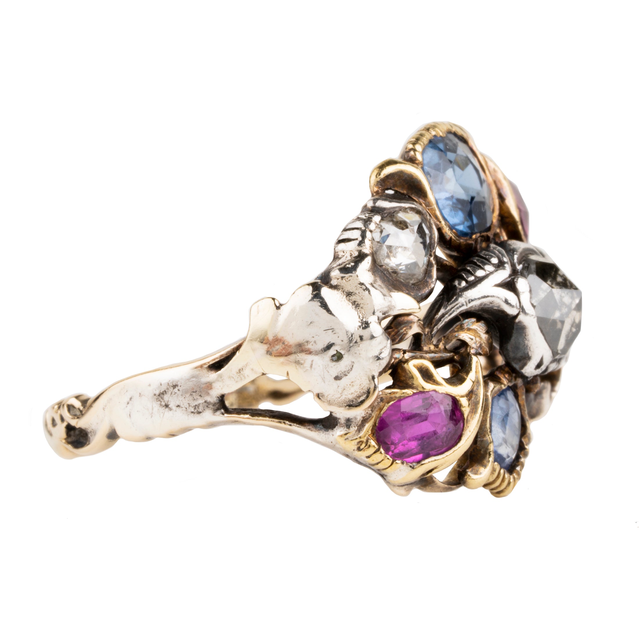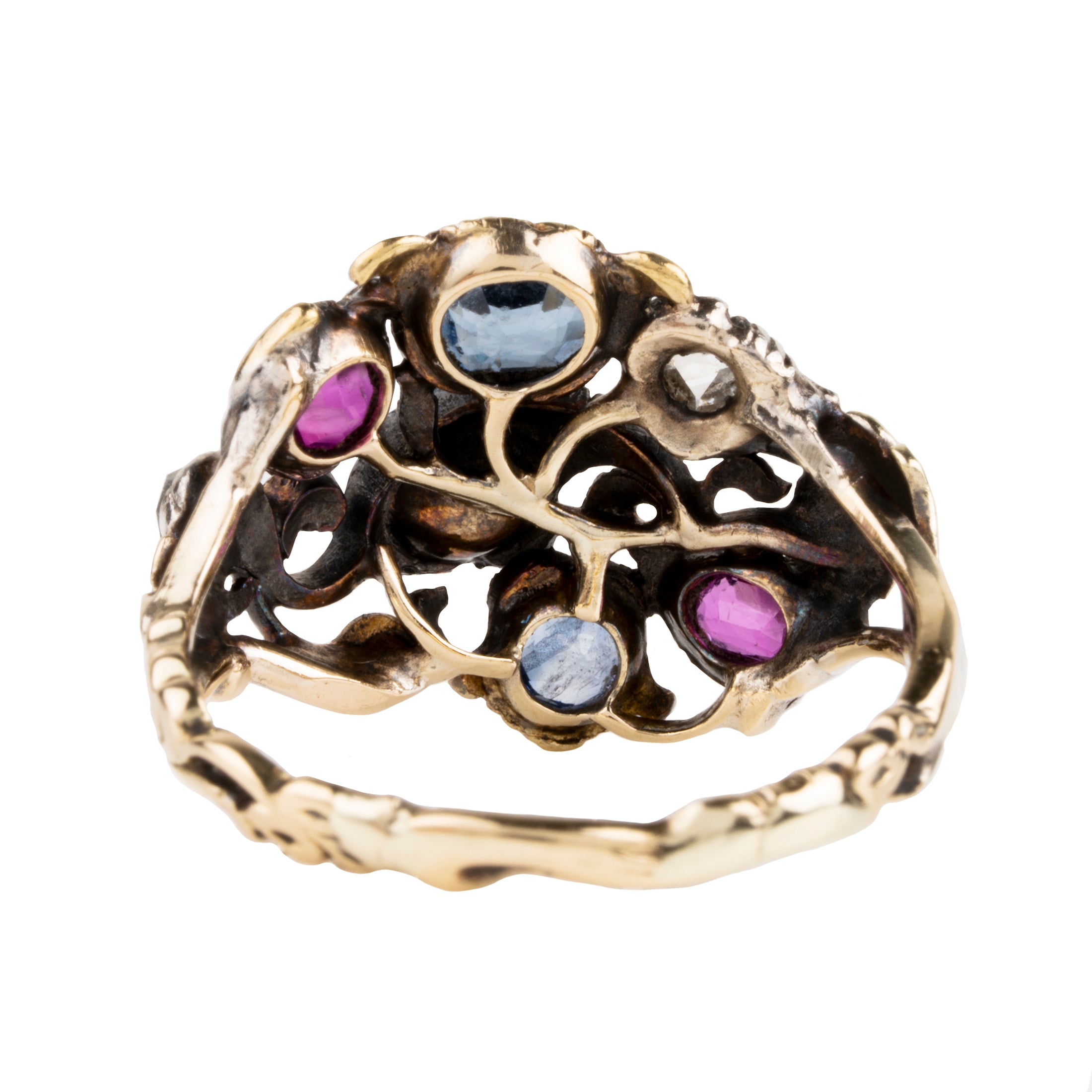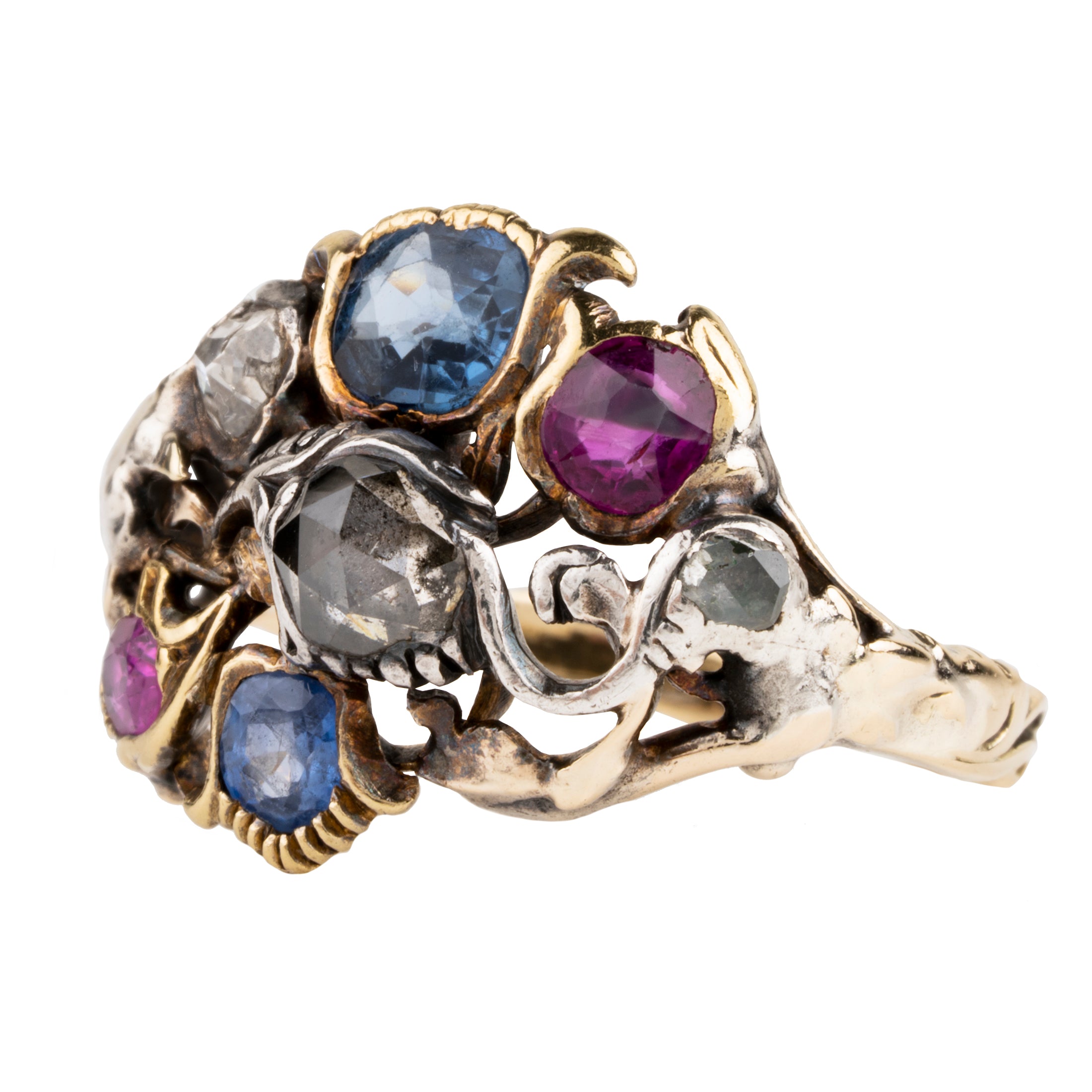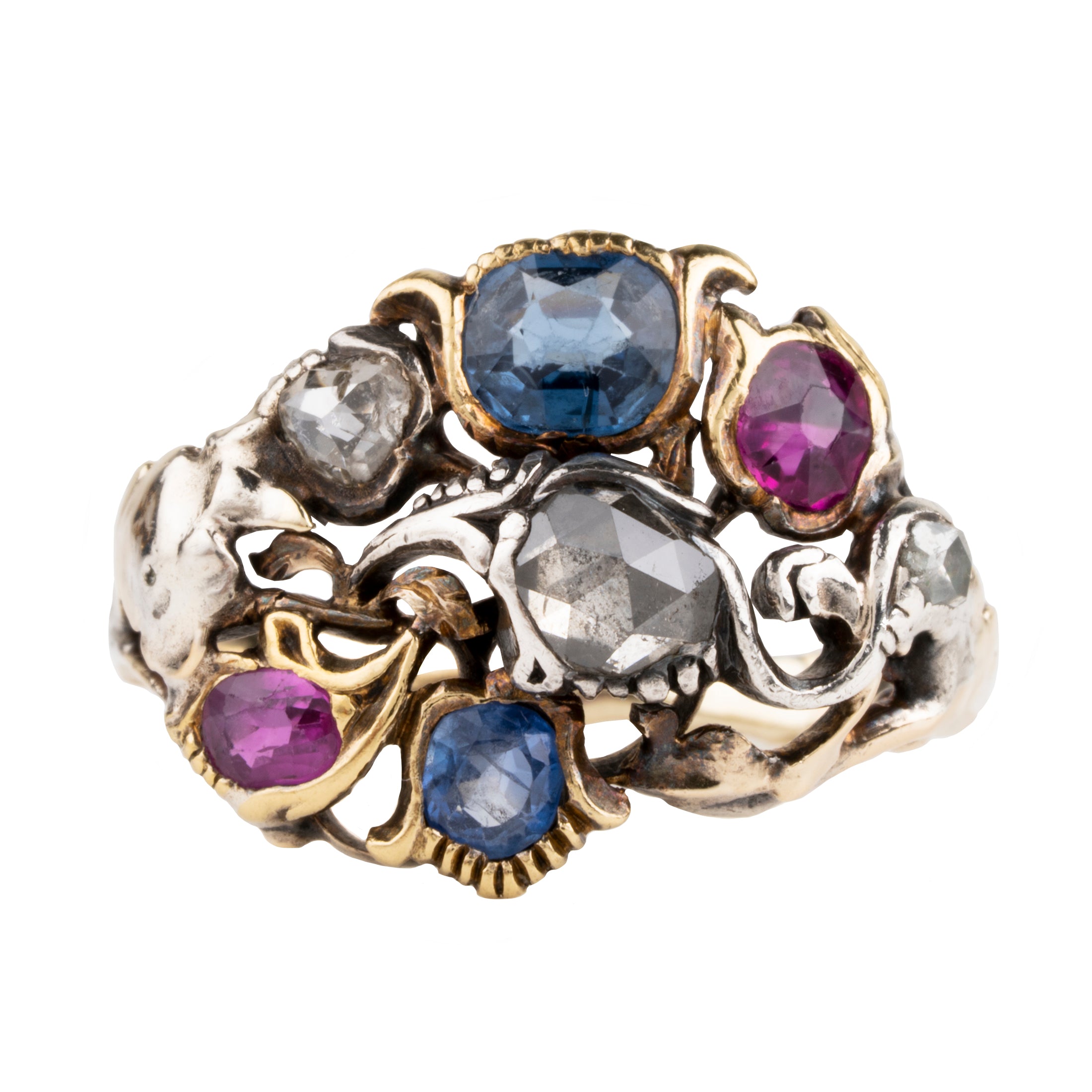 A ‘little garden’ ring with sapphires, rubies and rose cut diamonds, in silver and gold. Giardinetti rings have an airy floral motif, resembling flowers or an arrangement in a vase. English in Origin. Circa 1760.