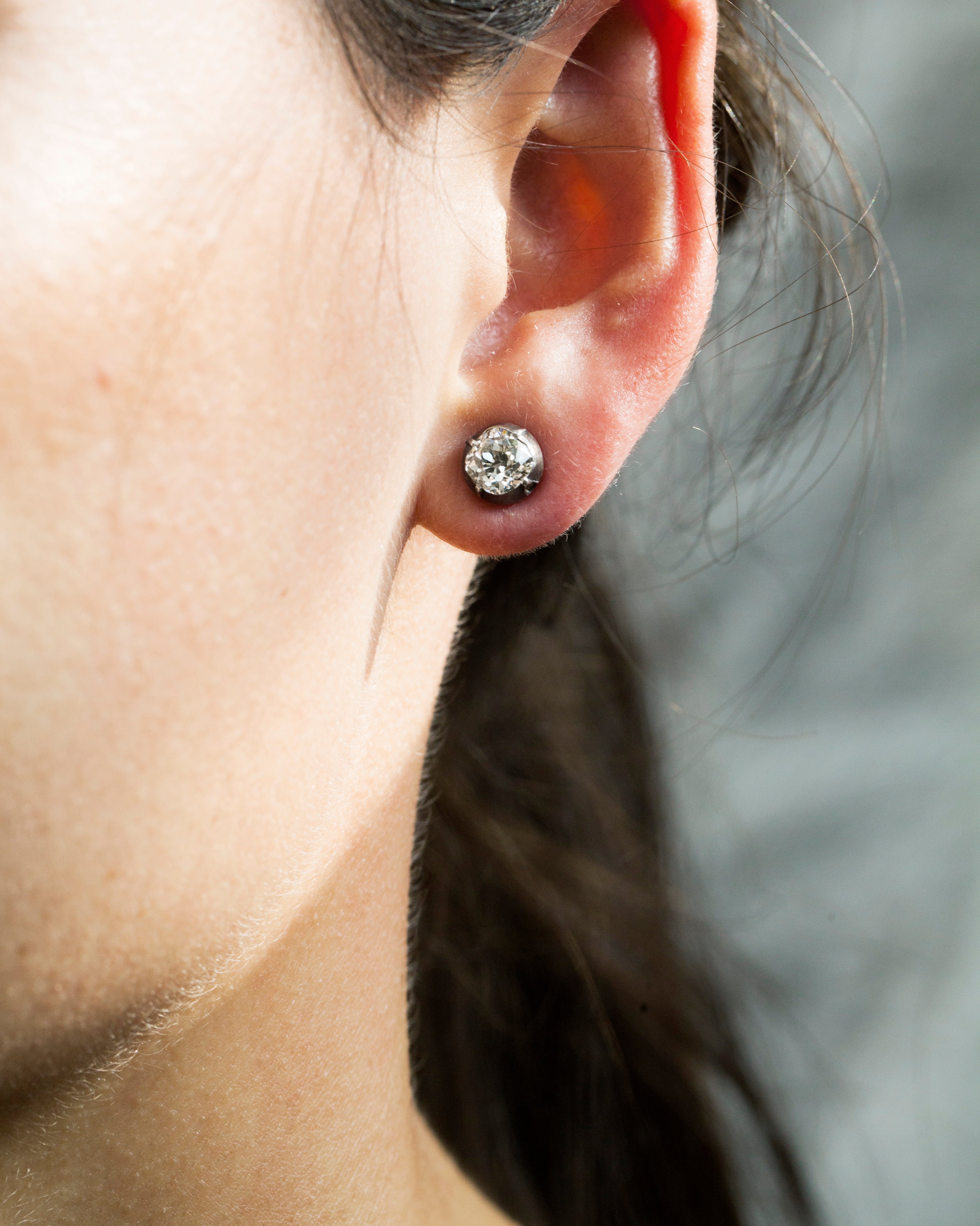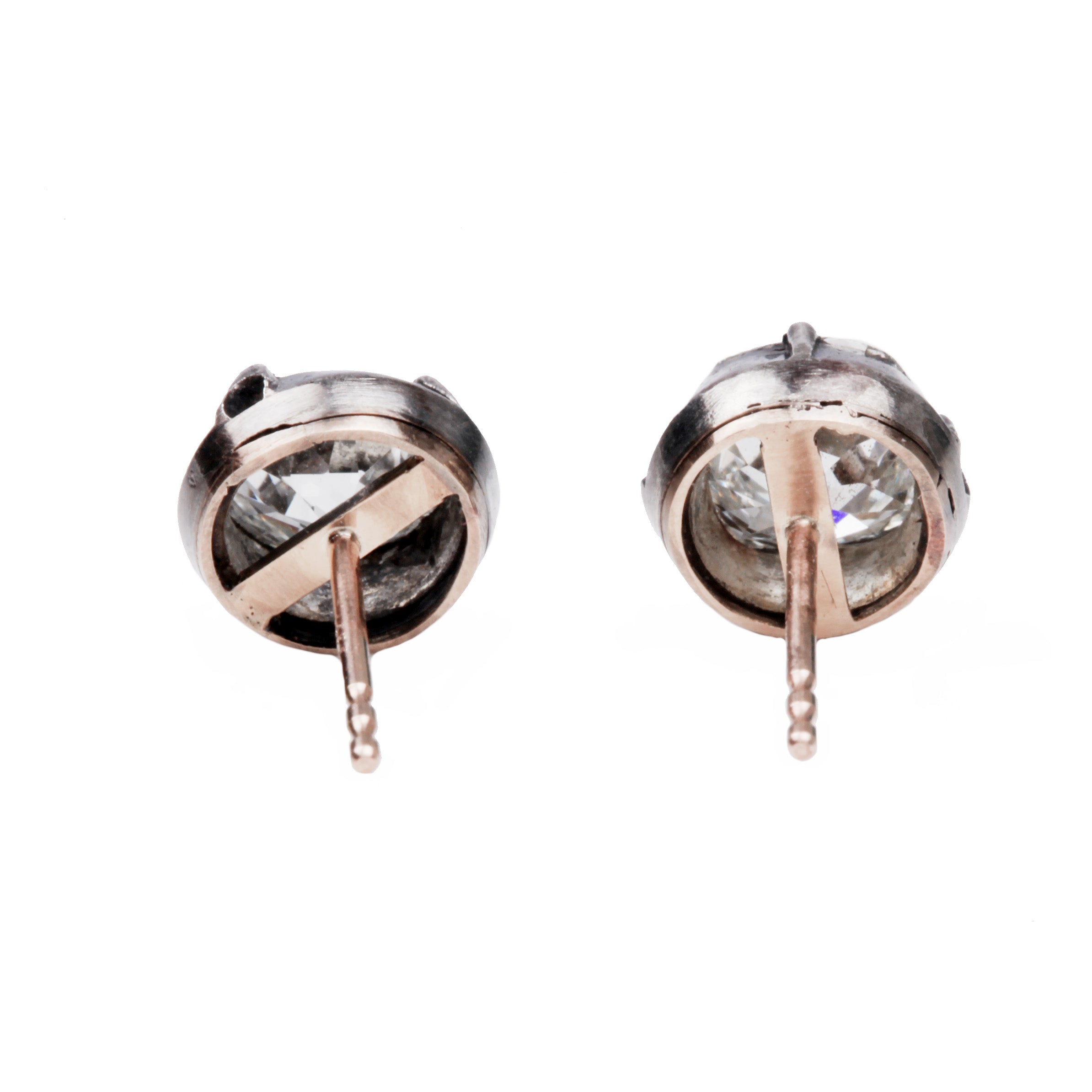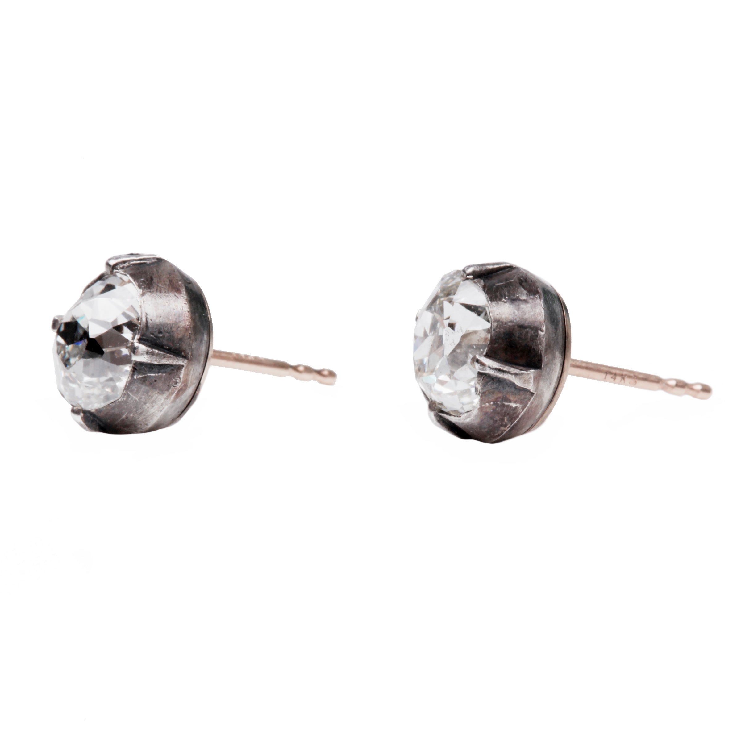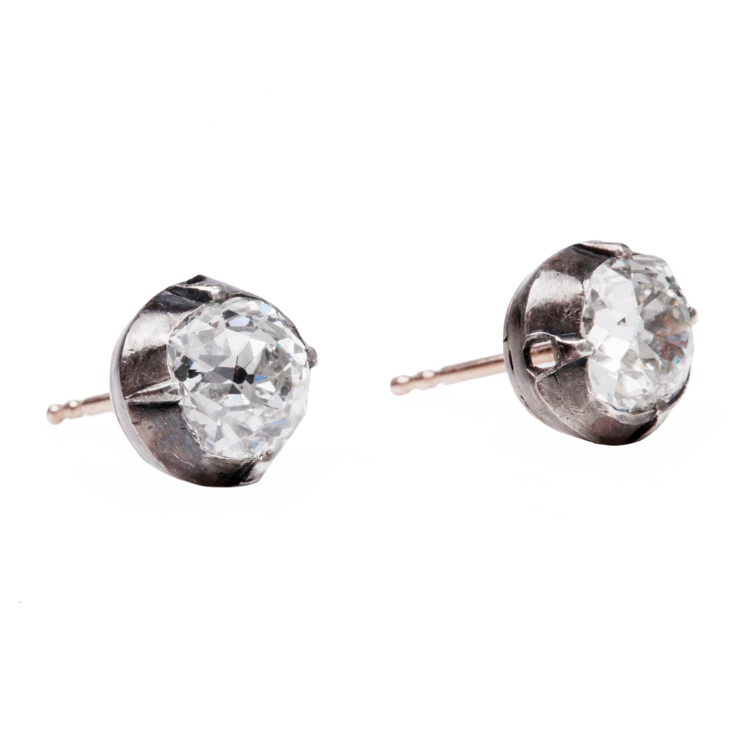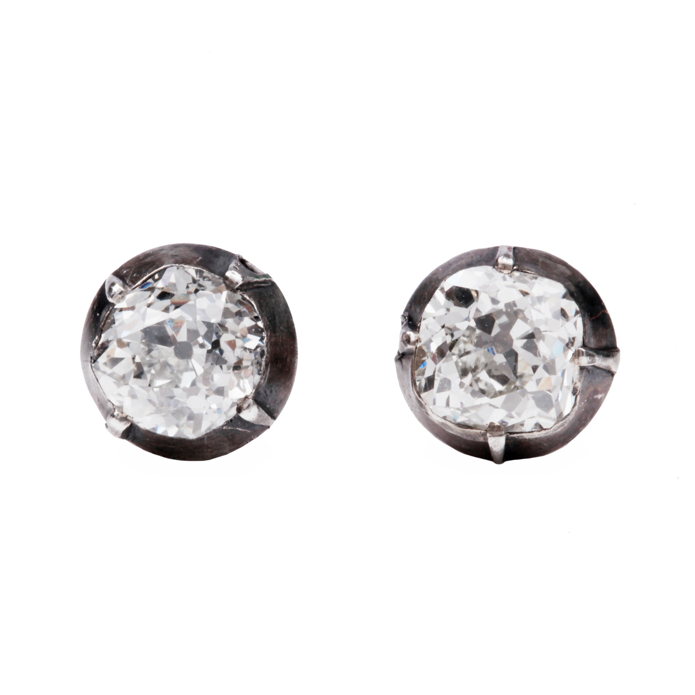 Antique old mine cut diamond earrings. 18th century diamond settings, part of a larger piece of jewelry. Later converted into earrings. Silver topped gold cut away settings with18k gold post. Approximately 2.01 carats in total diamond weight.