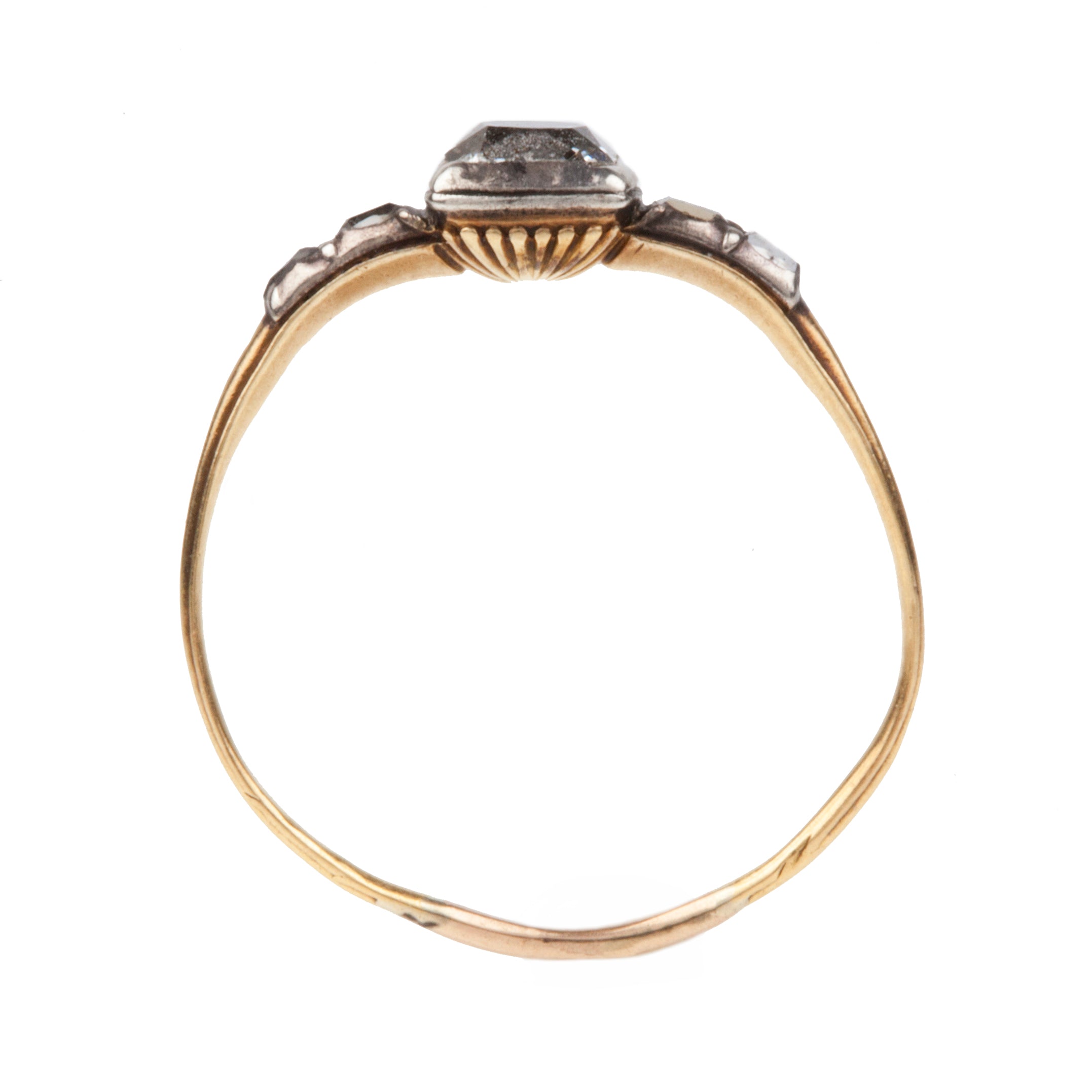 Georgian era, mid 18th century diamond ring. The center Old Mine cut diamond is bright and flanked by four table cut diamonds. Typical of the time period, the stones are set in silver while the remainder of the ring is in 18k gold. The reverse of the ring has a beautiful reeded detail. The ring has an old sizing in the back that can be improved when sized for the next owner. Otherwise it is in very good condition. English in origin.