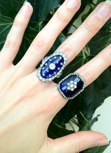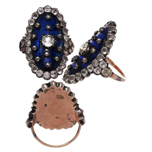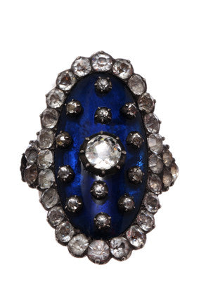 Late 18th century French blue enamel large scale ring with paste stones. Rings such as this became popular in the late 18th century. In 1774, The long awaited news of the pregnancy of Marie Antoinette was marked by rings 'au firmament' with diamonds scattered like stars in in the midnight sky on a dark blue ground, and the birth of the dauphin in 1785 by 'bagues a l'enfantement' centered on a large diamond.