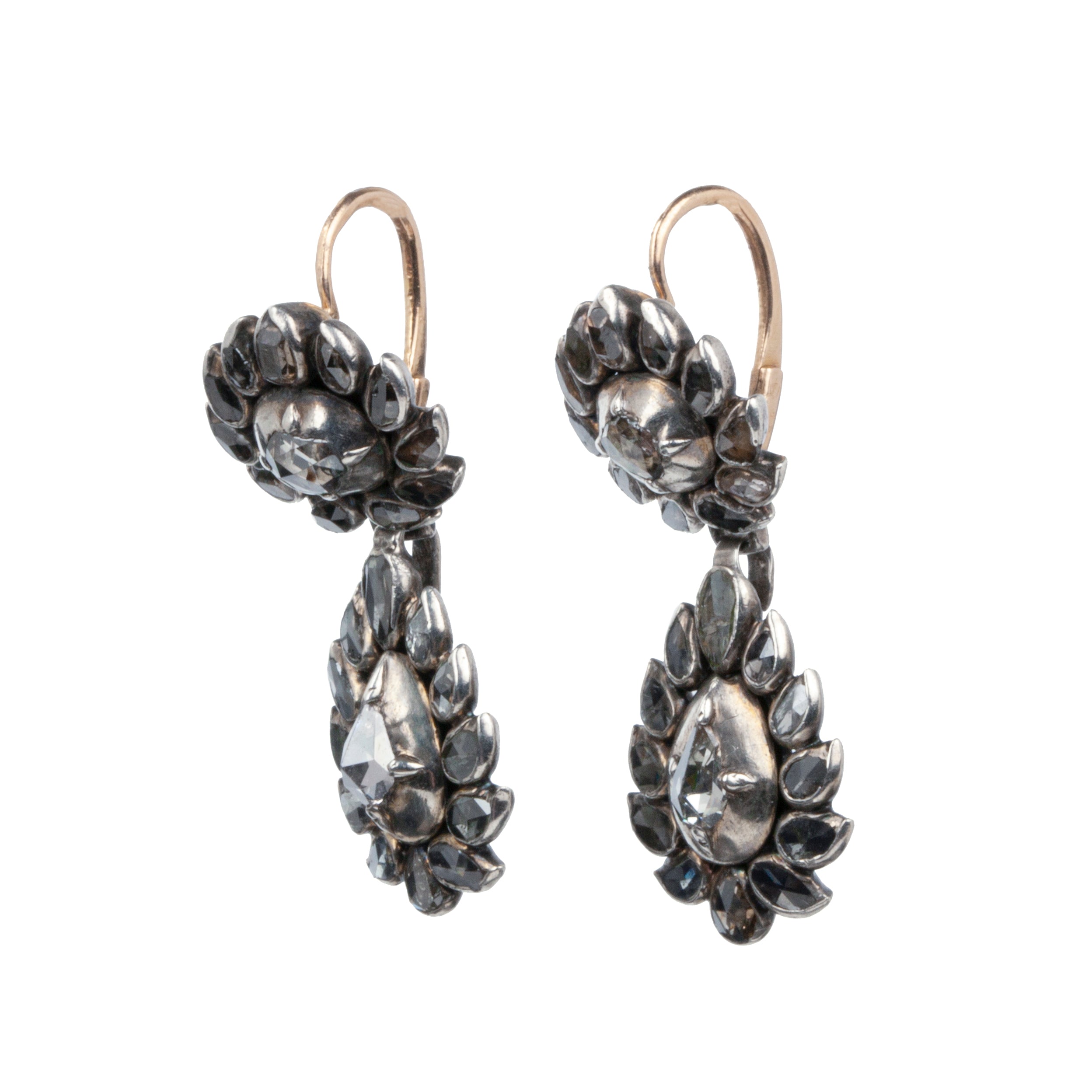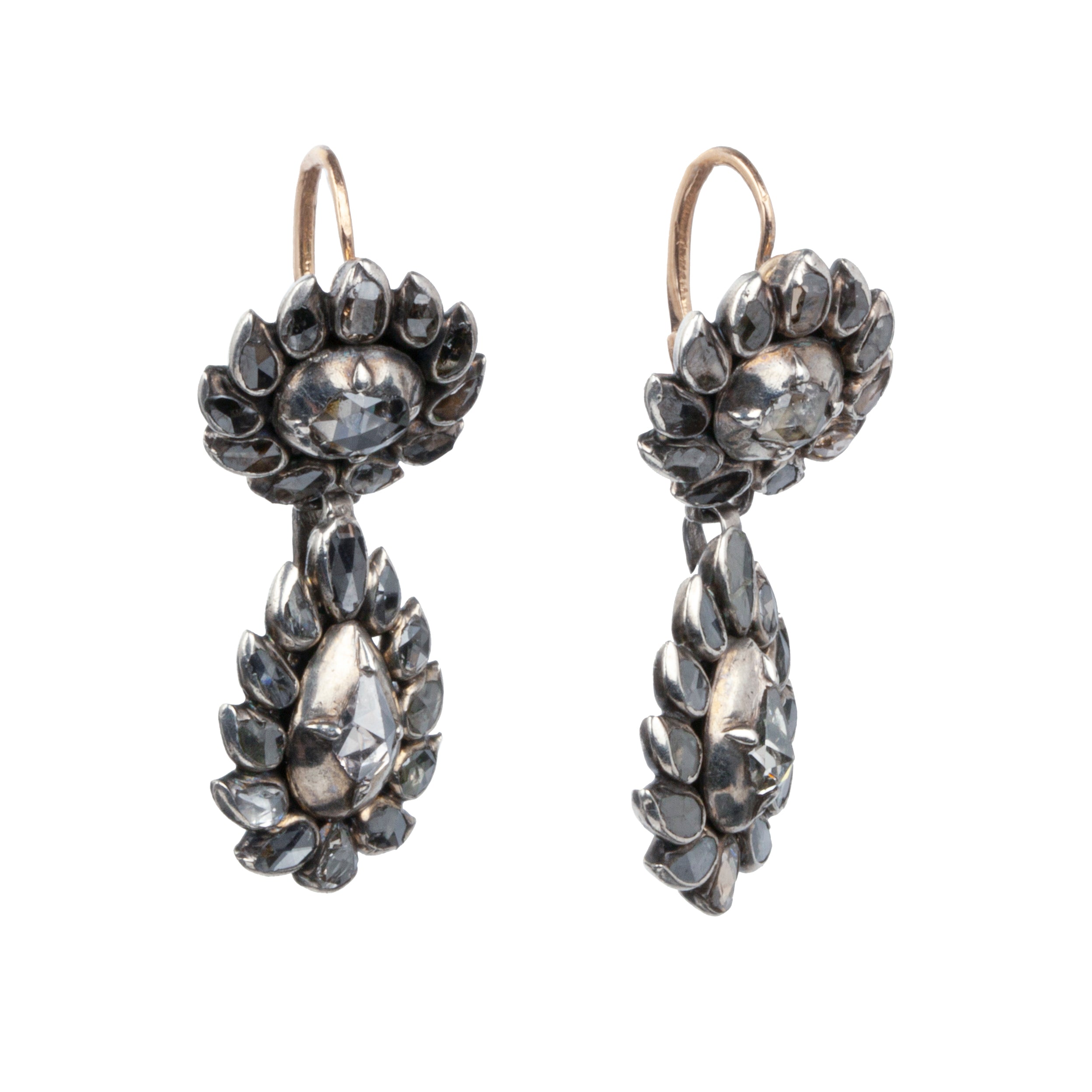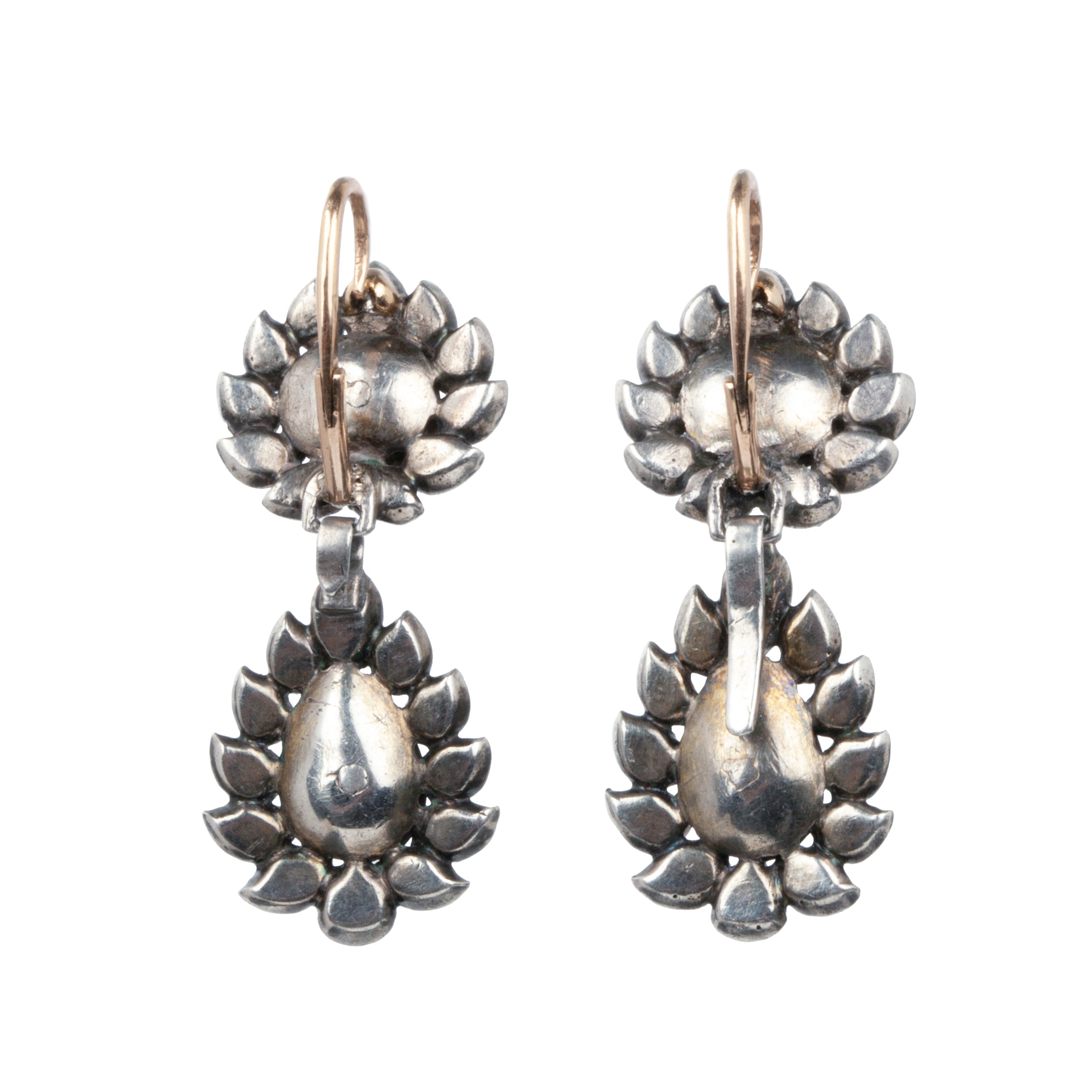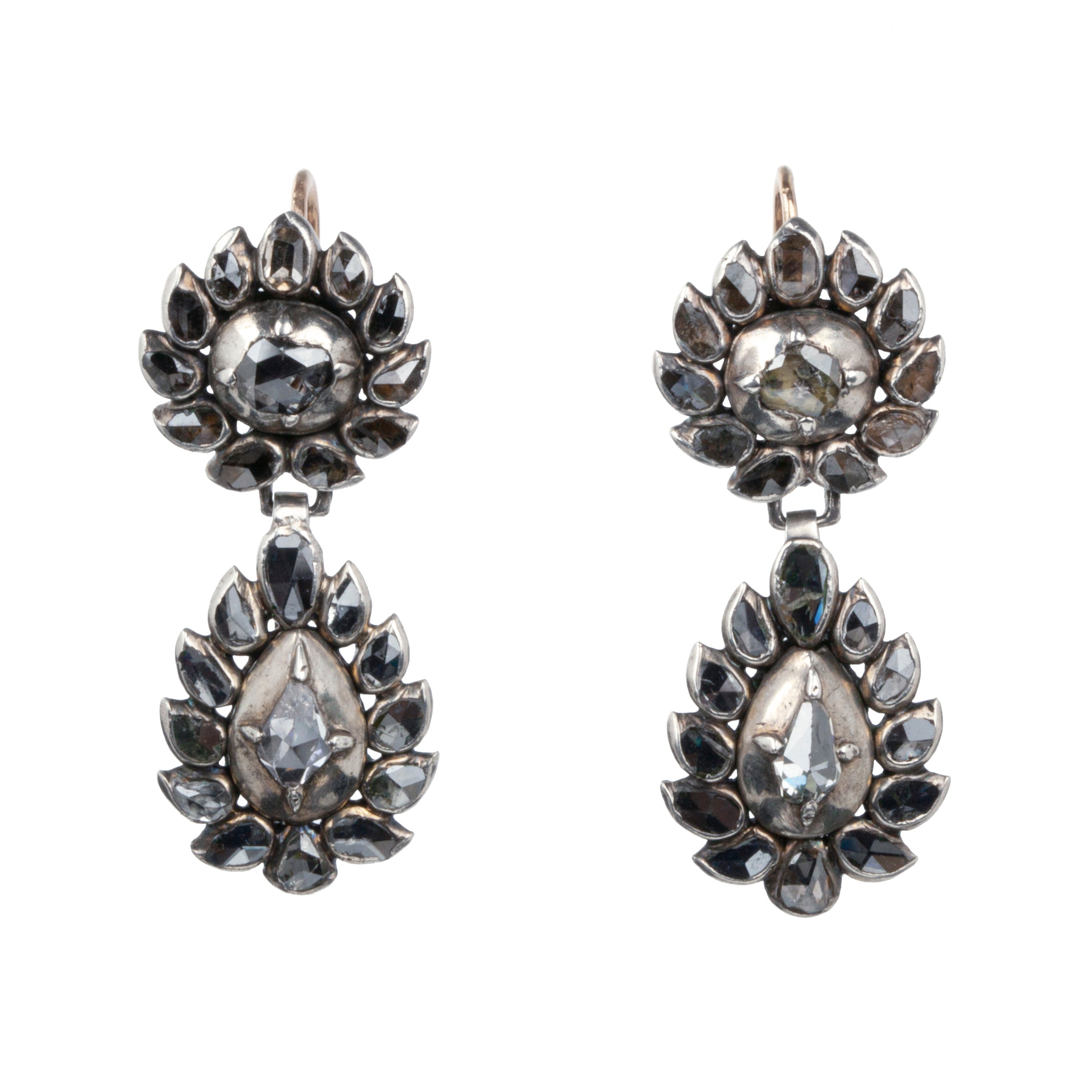 Rare 18th Century Portuguese Earrings. Rose-cut diamonds set in silver-topped gold arranged in a flame pattern. 50 diamonds in total. Original back to front ear hooks, typical for the period. Portuguese in origin. Circa 1780. Found in London.