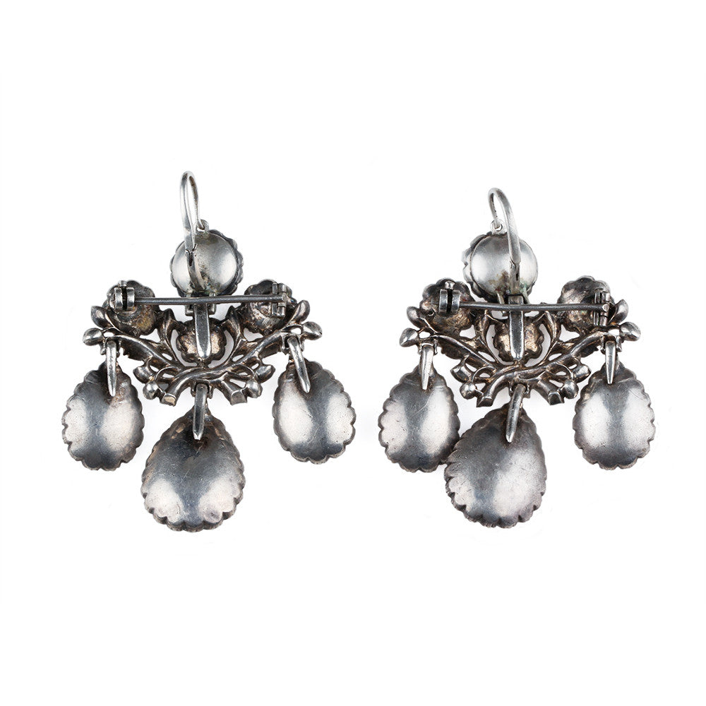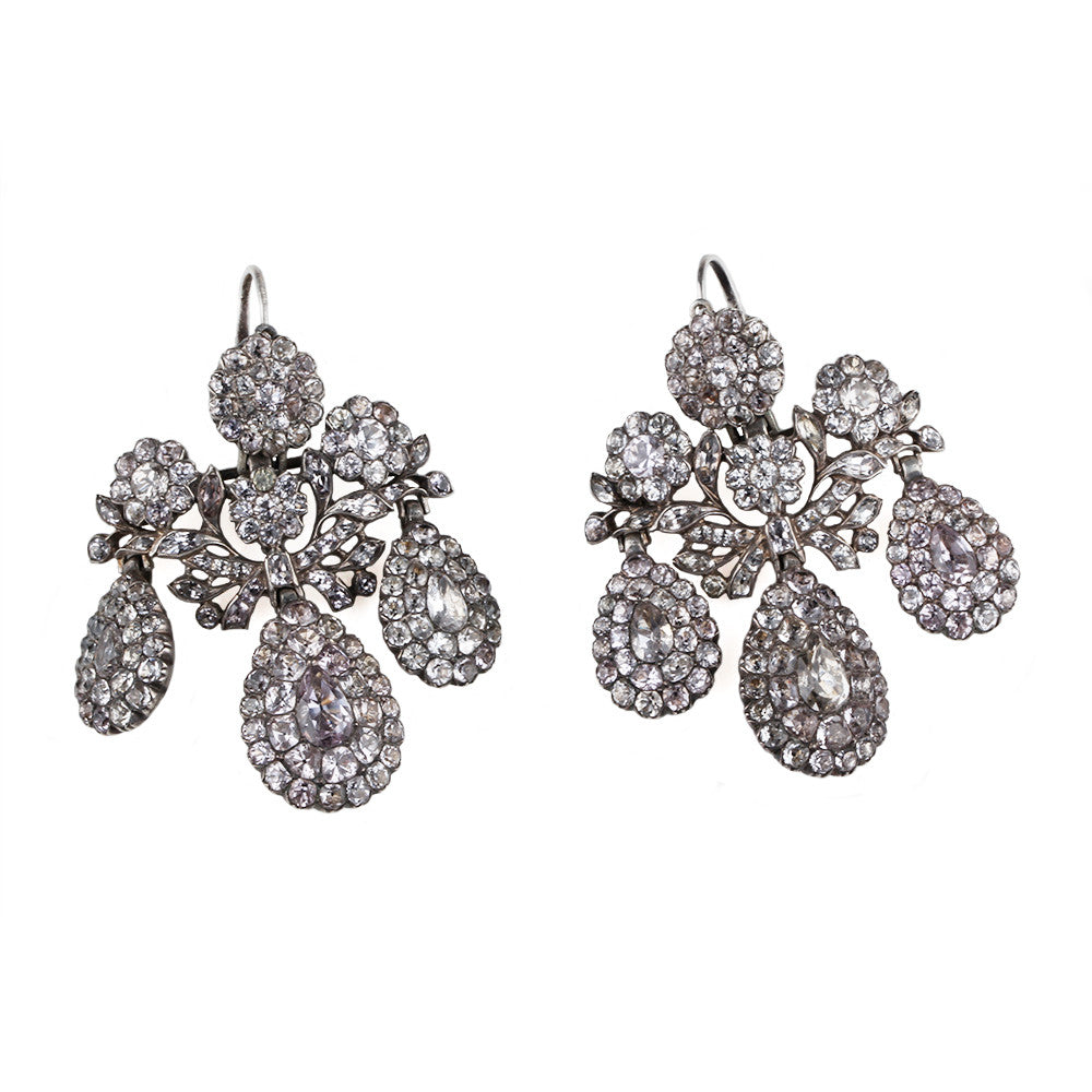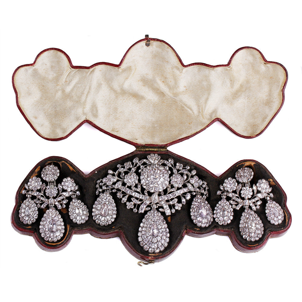 The present example is a rare survival of a classic design in Portugese jewelry. The demi parure is housed in its original hand tooled leather case. The set is comprised of a central girandole stomacher pendent, flanked by matching girandole earrings. Each piece is set with both white and the softest pink natural topaz stones, closed set and foil backed in silver. For a similar example see Five Centuries of Jewelry (p 80). Portuguese. Second half of the 18th century.