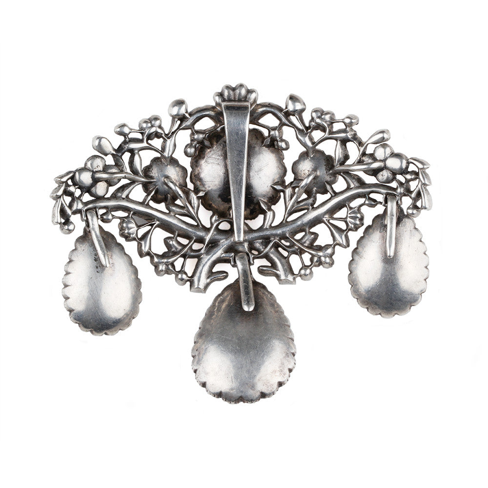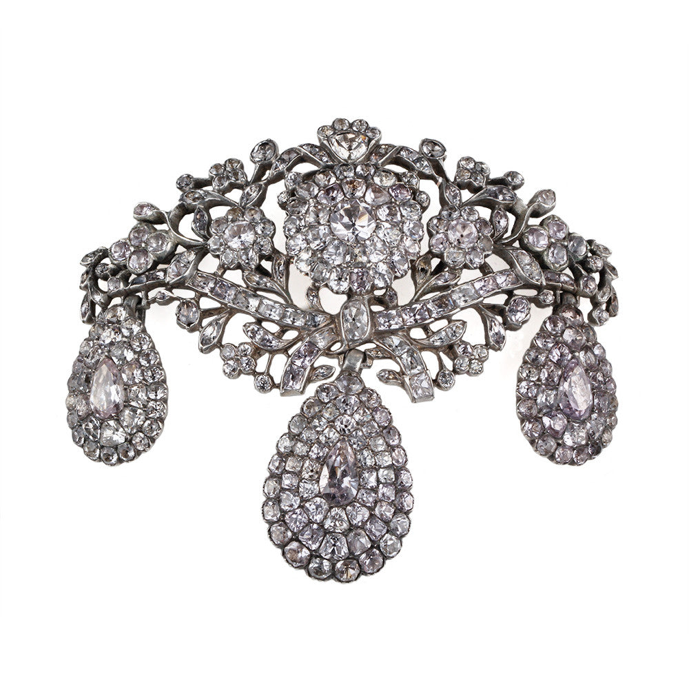 Portugal, like much of Europe, typically followed the French in jewelry and decorative designs fashionable with the aristocracy. Brazilian stones of chrysoberyl, topaz, and aquamarine were among the materials that gave a regional taste to Portuguese designs. Stones were polished and mounted side by side with the slightest metal frame separating each stone. Each stone is set with a foil behind the stone to give a soft light that would have enhanced the jewel in candlelight.