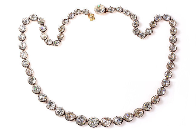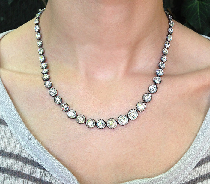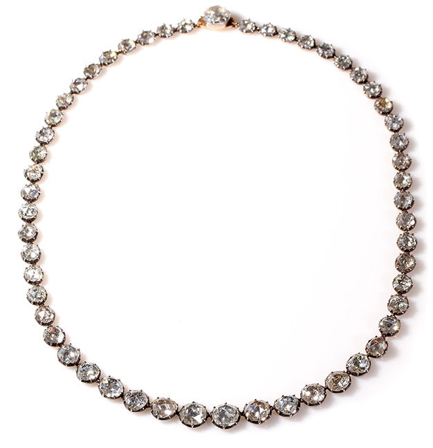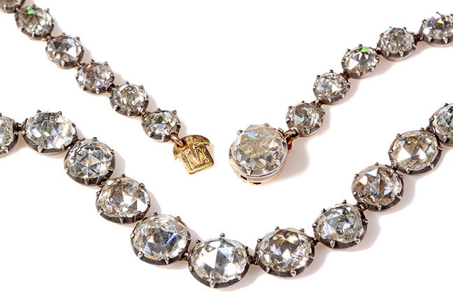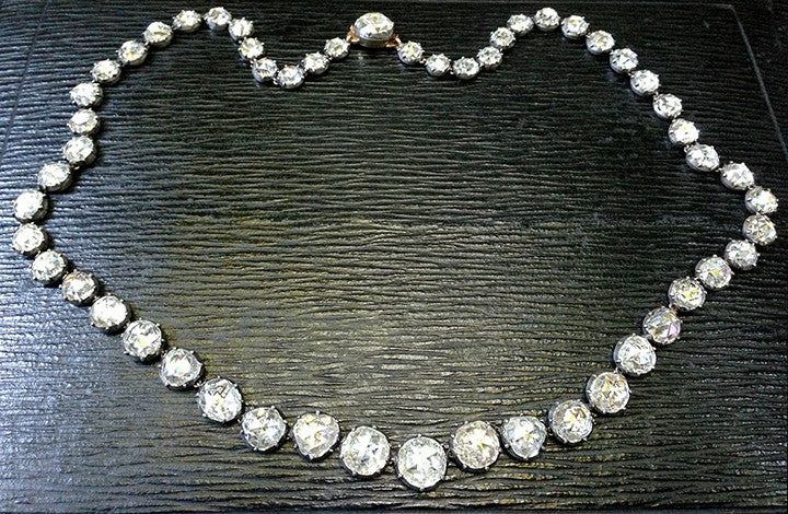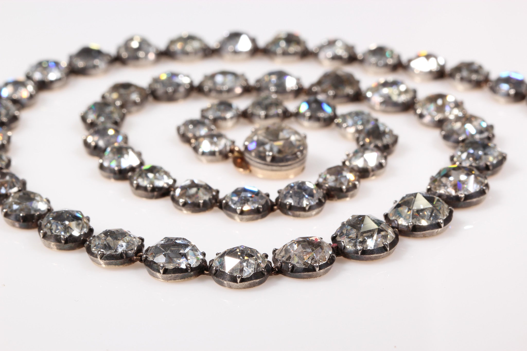54 bright foiled diamonds are delicately graduated in size. The largest stone measures approximately 8.00 mm in diameter The smallest stones at the back of the necklace measure approximately 5.00 mm with an 8.00 mm rose cut set in the clasp. These rose cut diamonds have a nice depth to the diamonds a cut rarely seen in the modern diamond trade.
