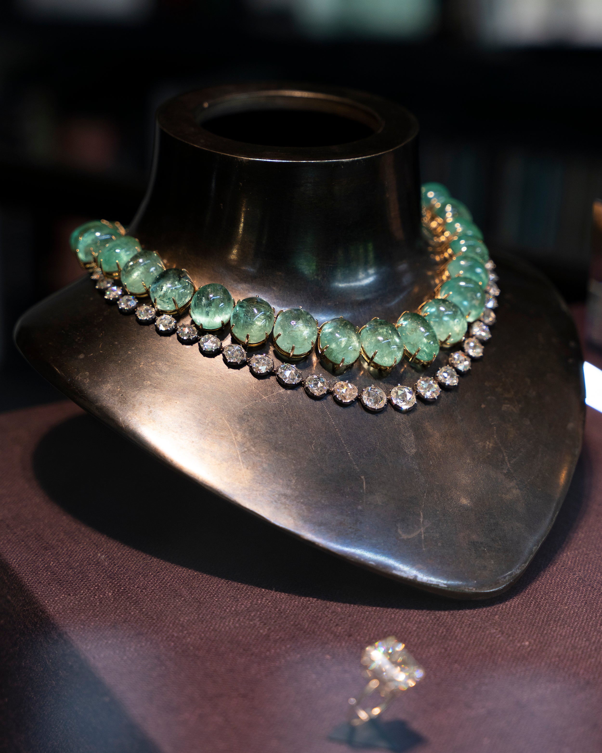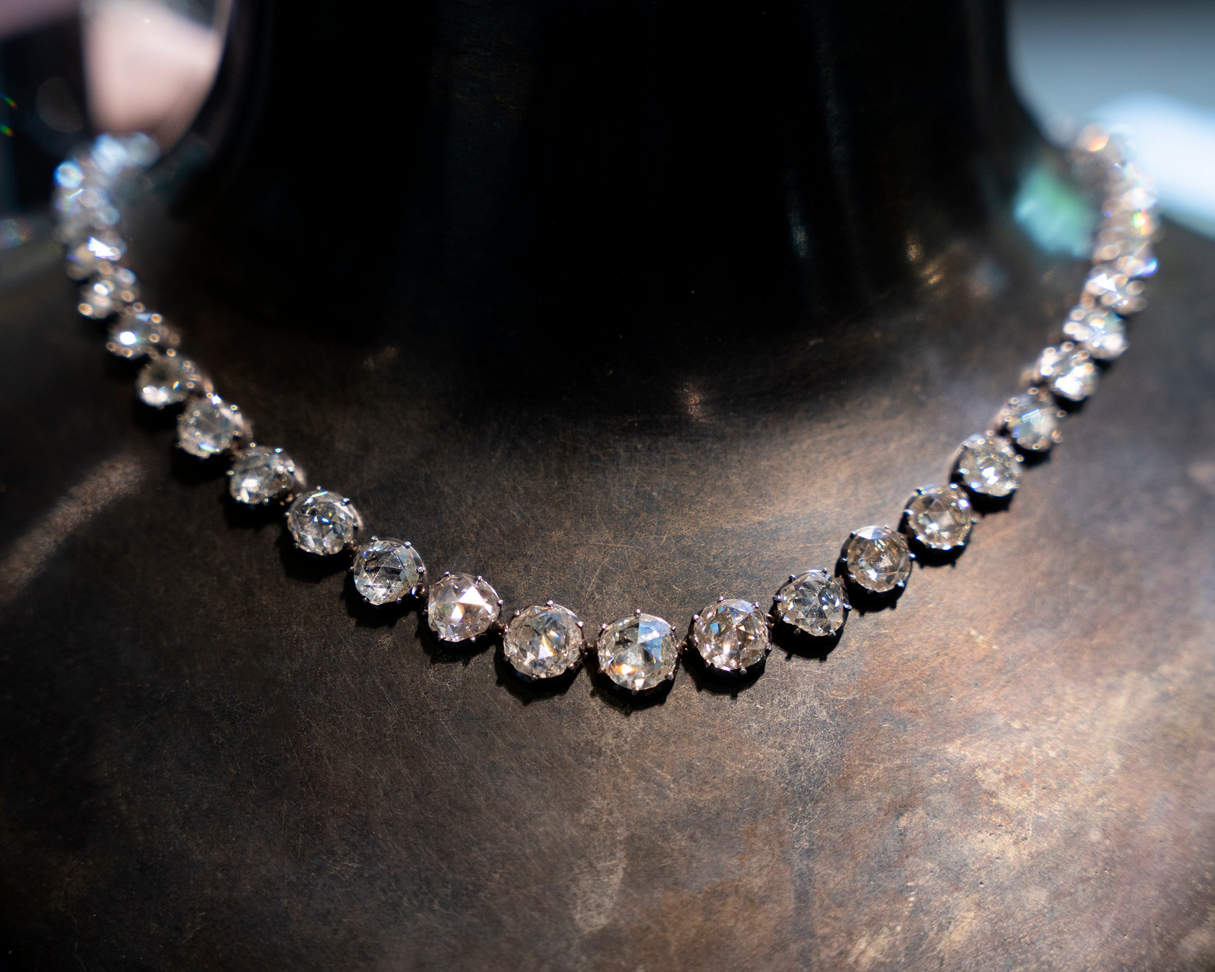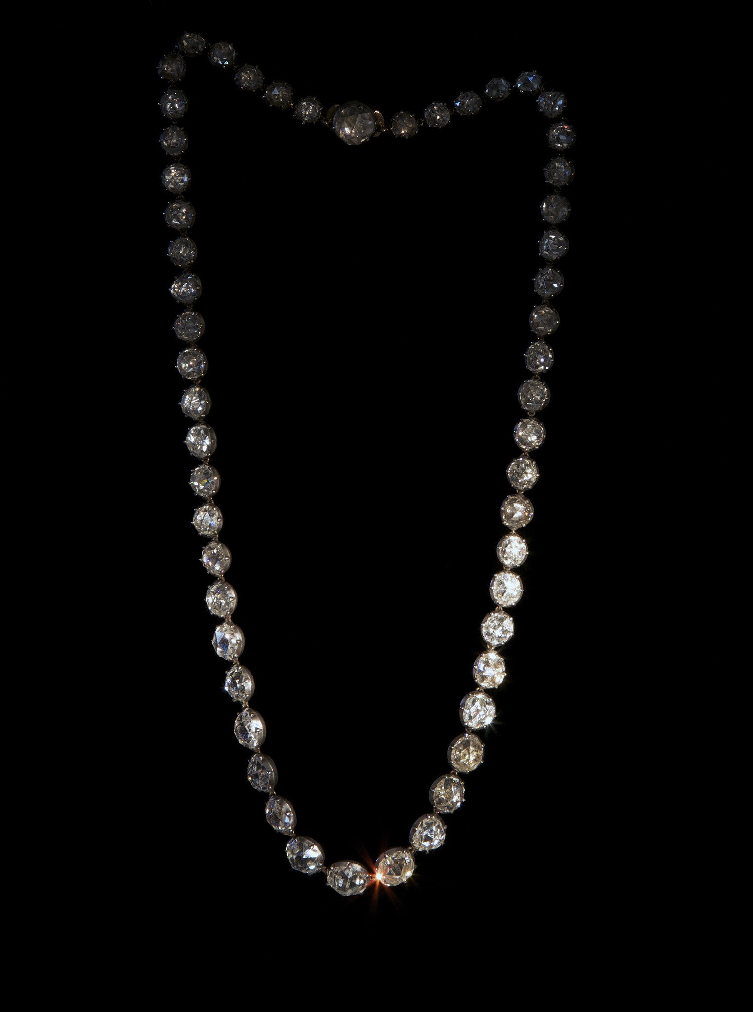 54 bright foiled diamonds are delicately graduated in size. The largest stone measures approximately 8.00 mm in diameter The smallest stones at the back of the necklace measure approximately 5.00 mm with an 8.00 mm rose cut set in the clasp. These rose cut diamonds have a nice depth to the diamonds a cut rarely seen in the modern diamond trade.