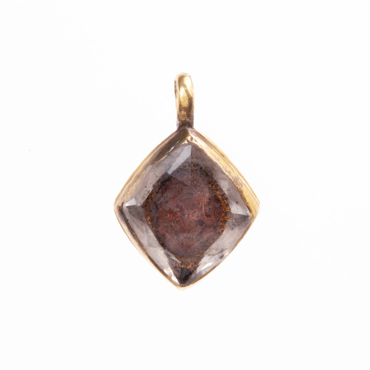 Georgian era early 18th century rock crystal mourning pendant in a very unusual diamond shape. Rudimentary engraving dates the pendant to 1720. Woven hair set underneath the crystal with gold wire forming the initials "LA". It would have originally been worn on a fine ribbon in the hair or on the neck.