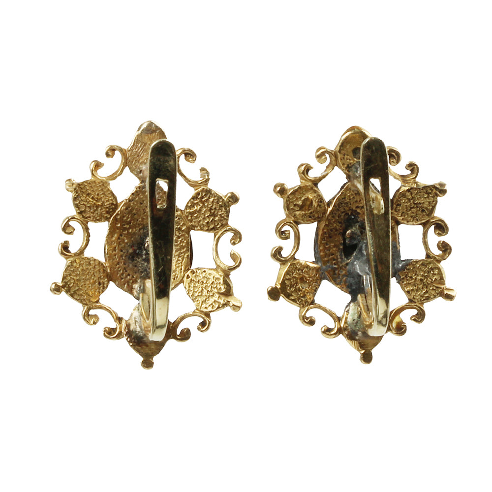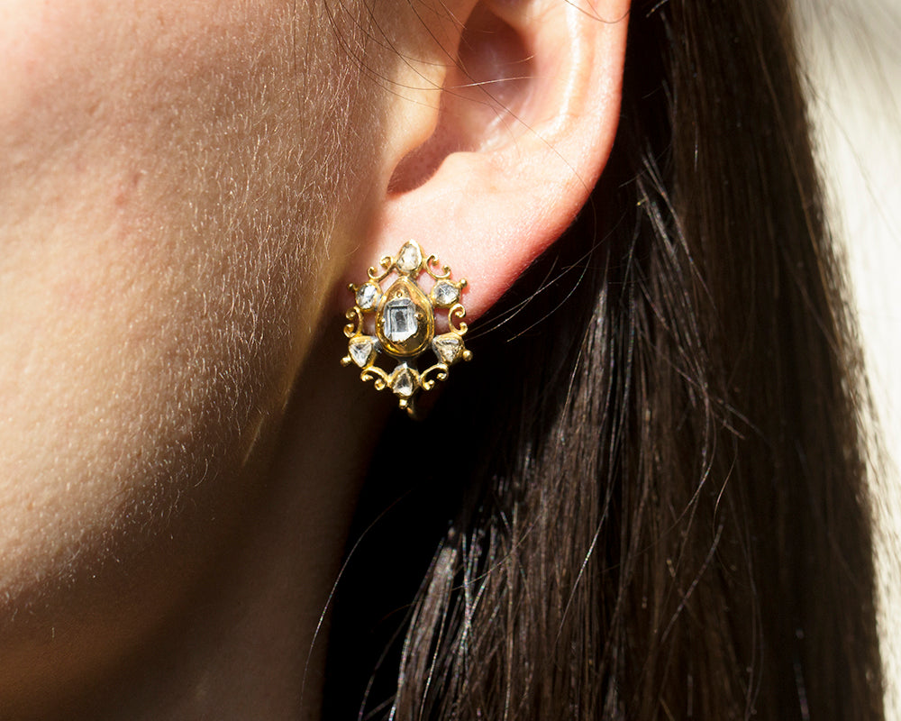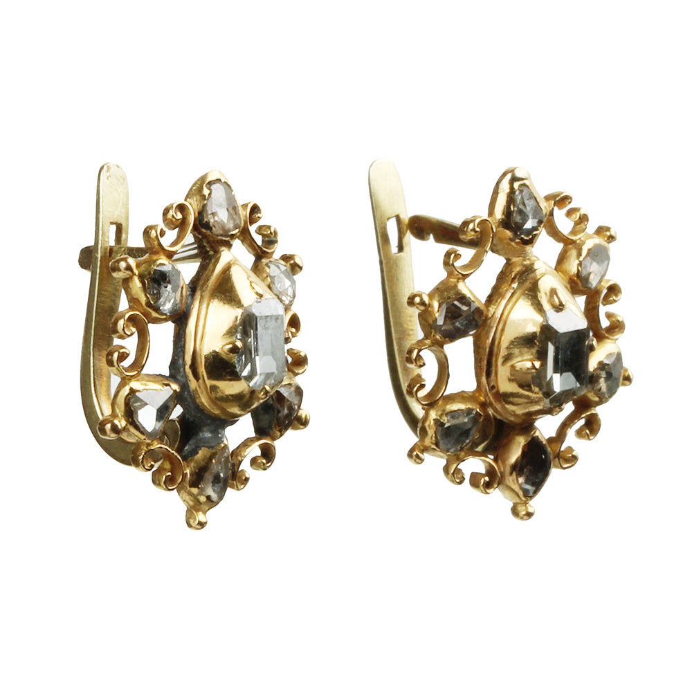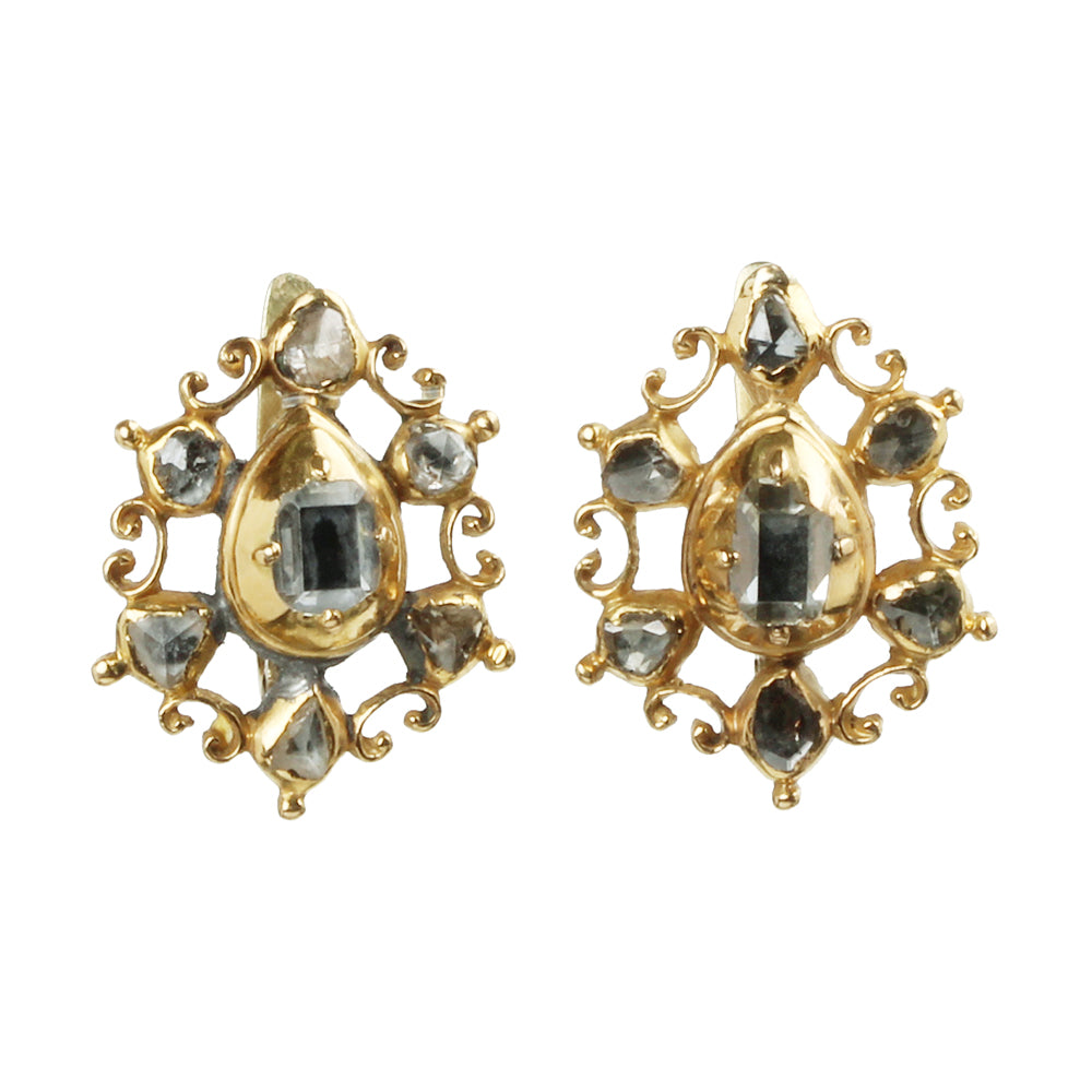 Beautiful late 18th century Table cut diamond earrings, in 18k gold. Spanish or Portuguese in origin. In the Iberian peninsula this style persisted into the early 19th century.