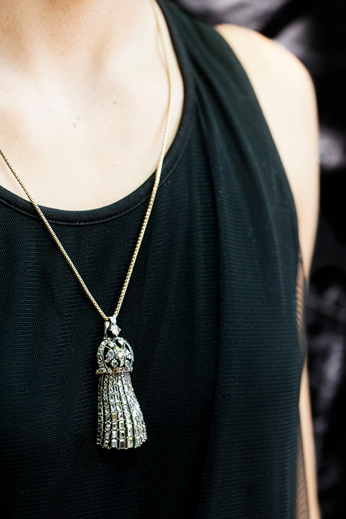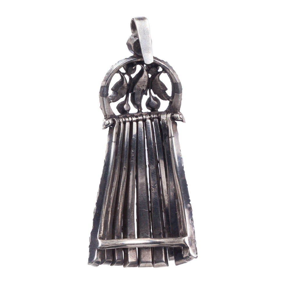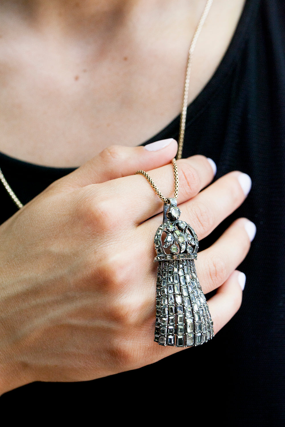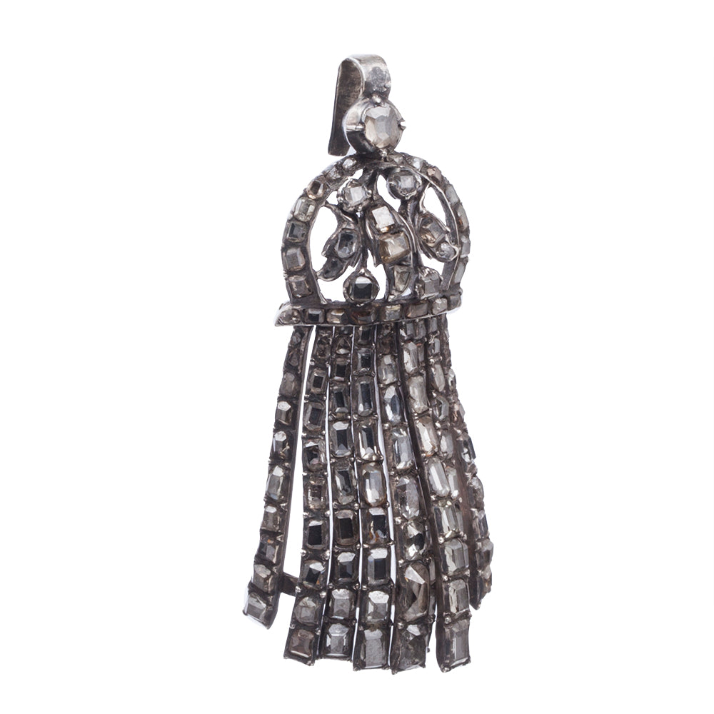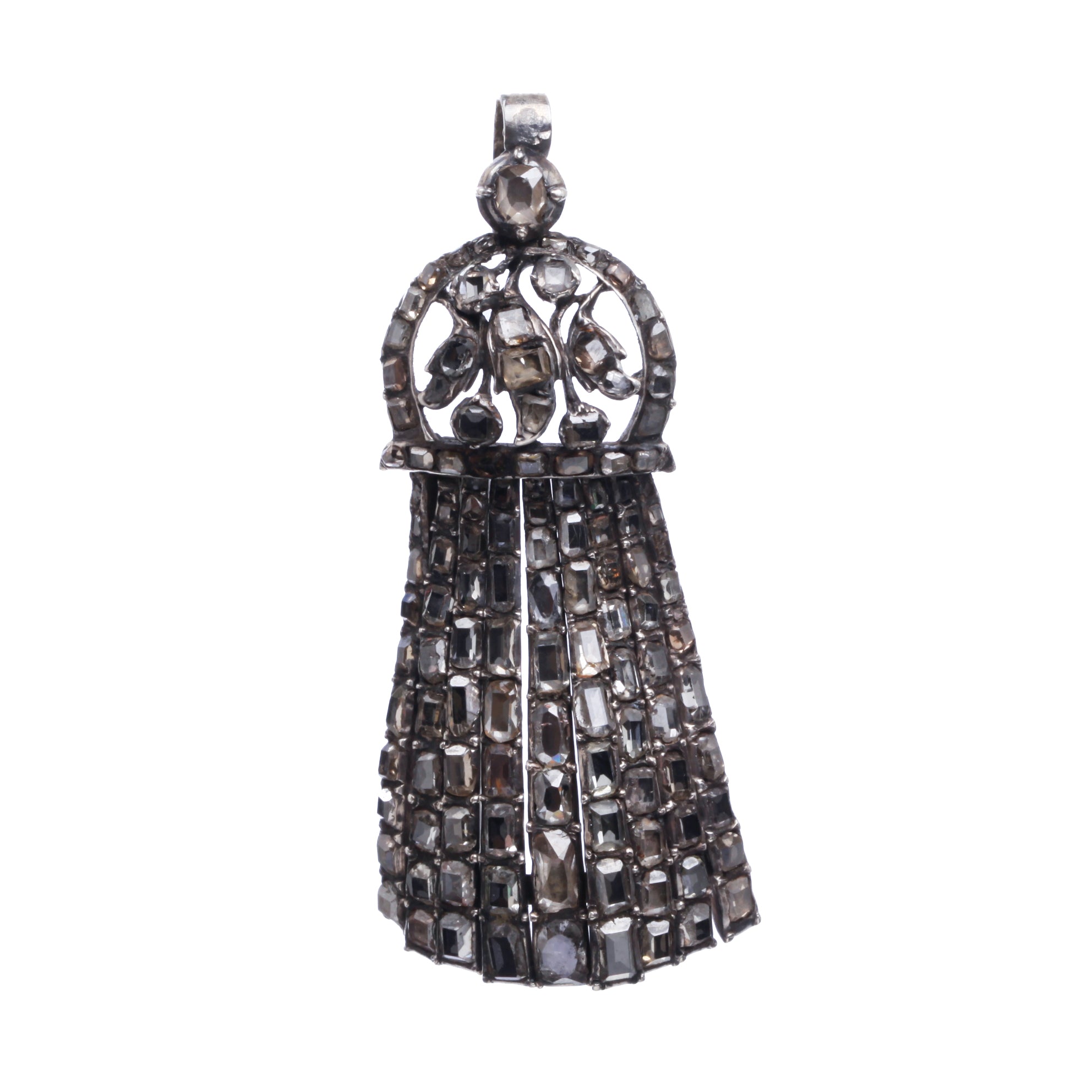 18th Century tassel pendant with table cut diamonds, set in silver. The tassel are hinged and have slight movement. Portuguese in origin.