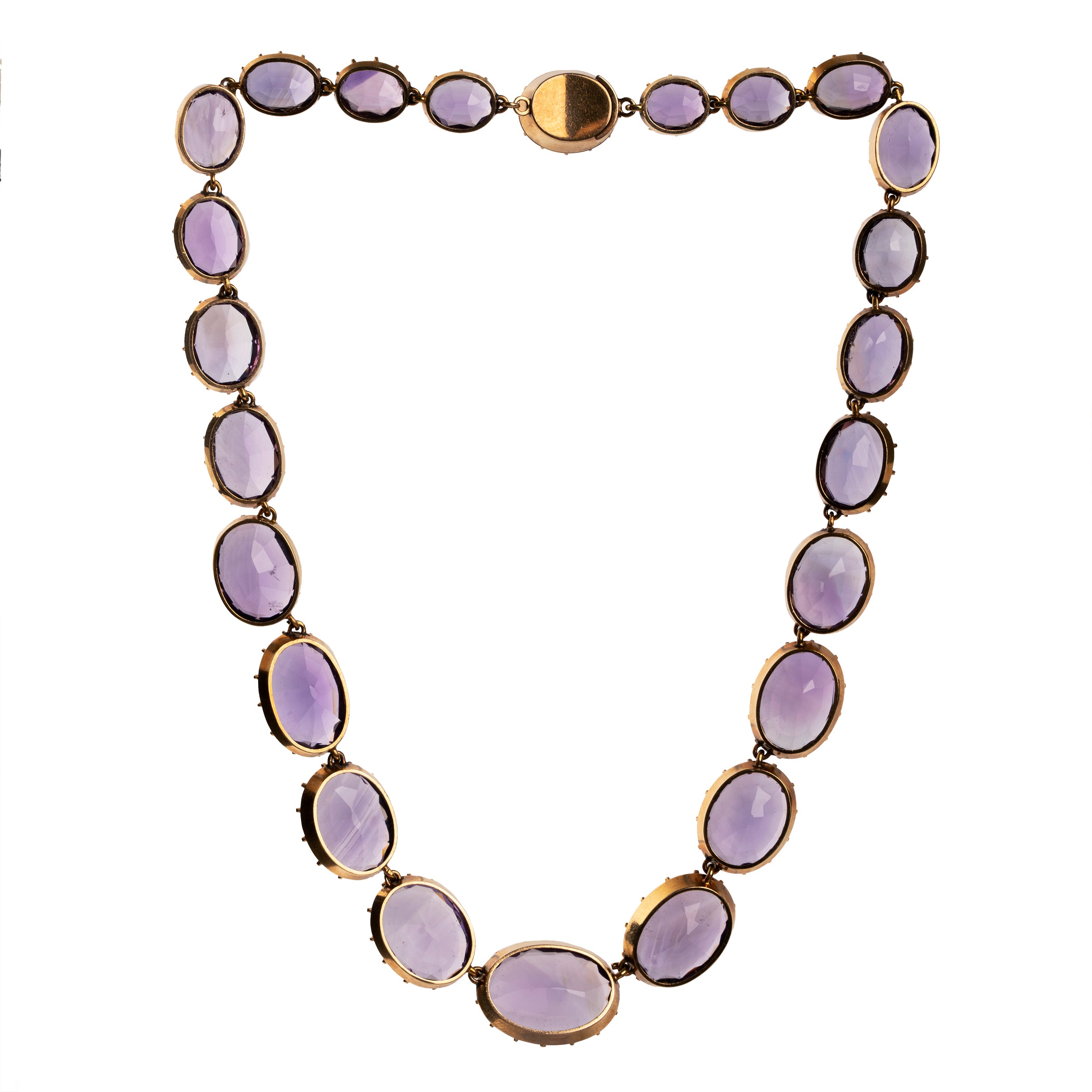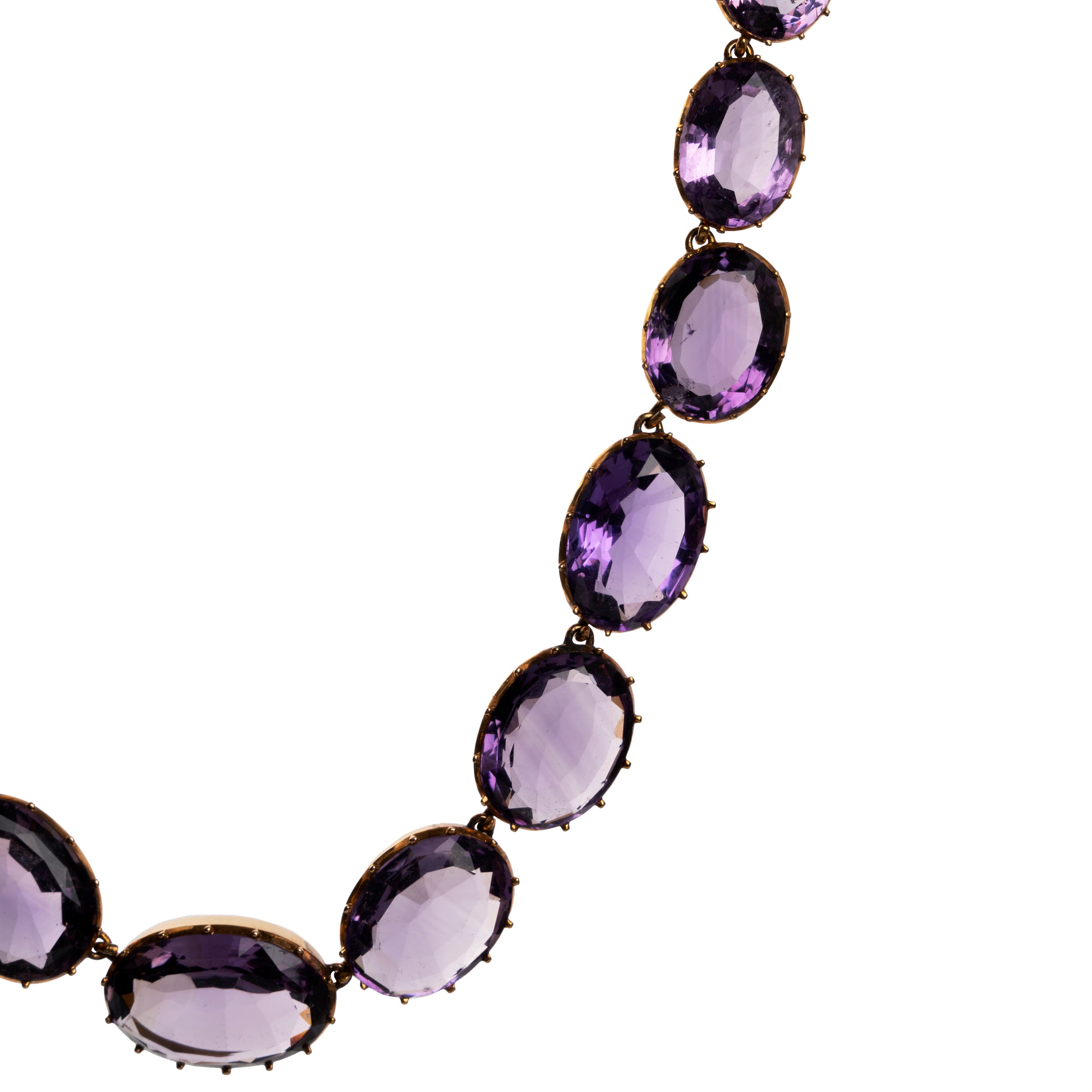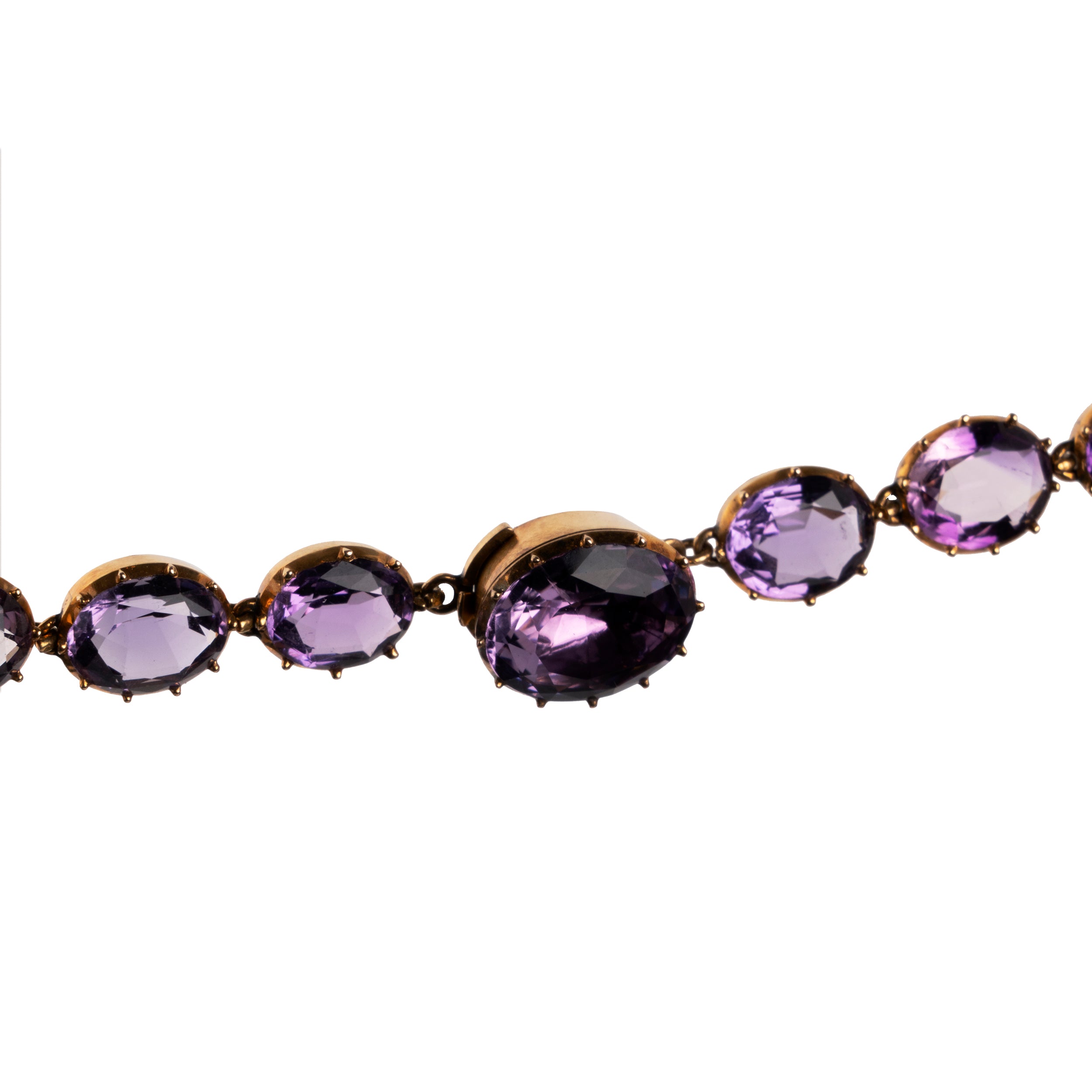 A beautiful 19th century amethyst rivière necklace, in classic gold collet settings. The large scale oval stones are all vibrant deep purple colors. English in origin. Circa 1870.