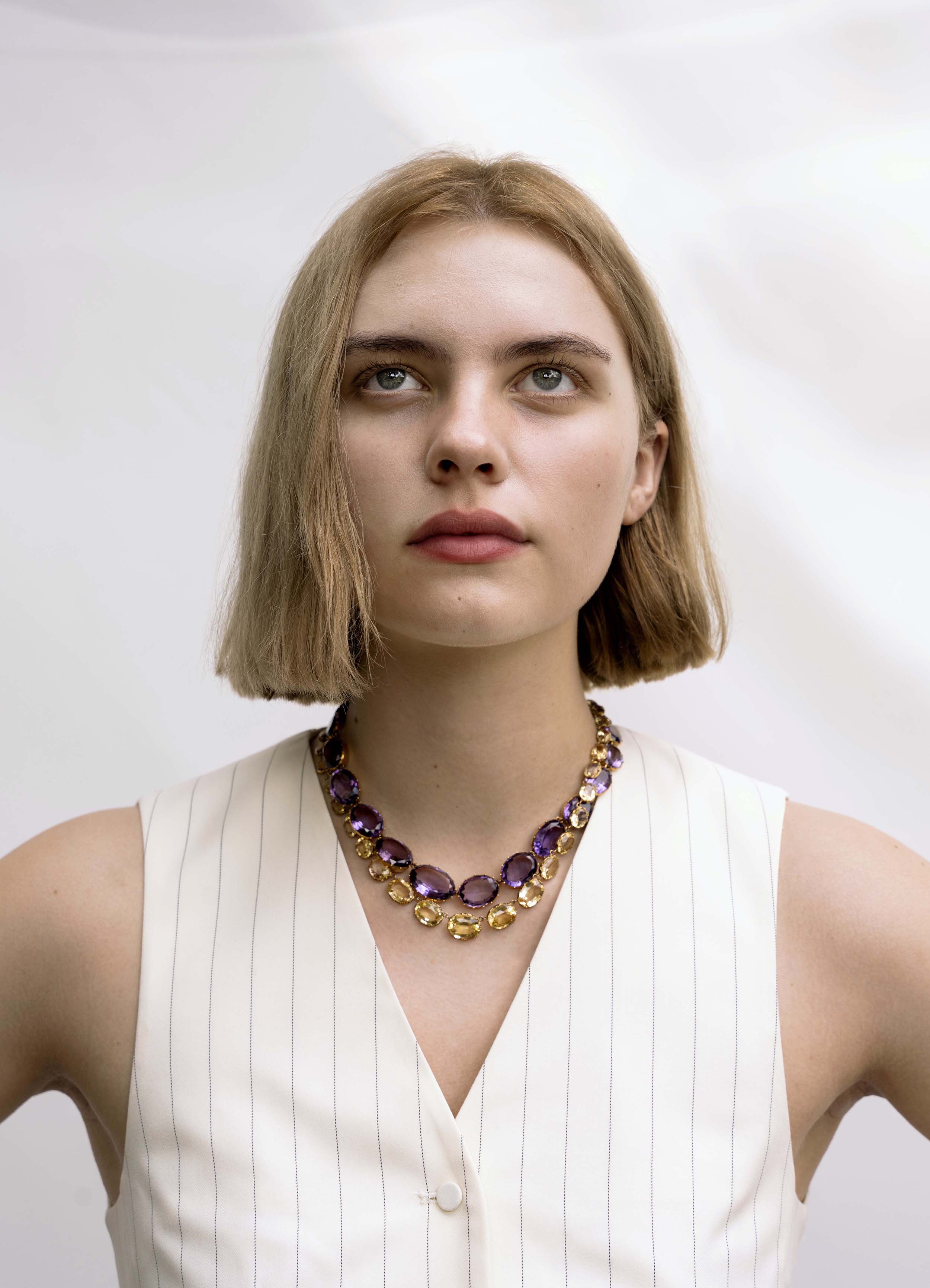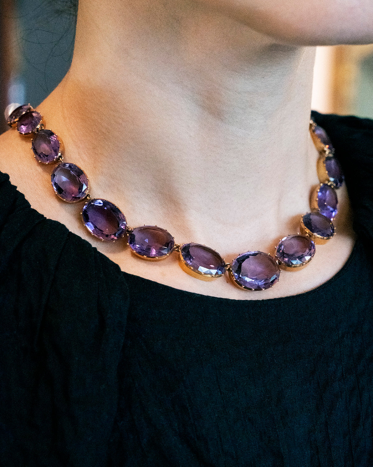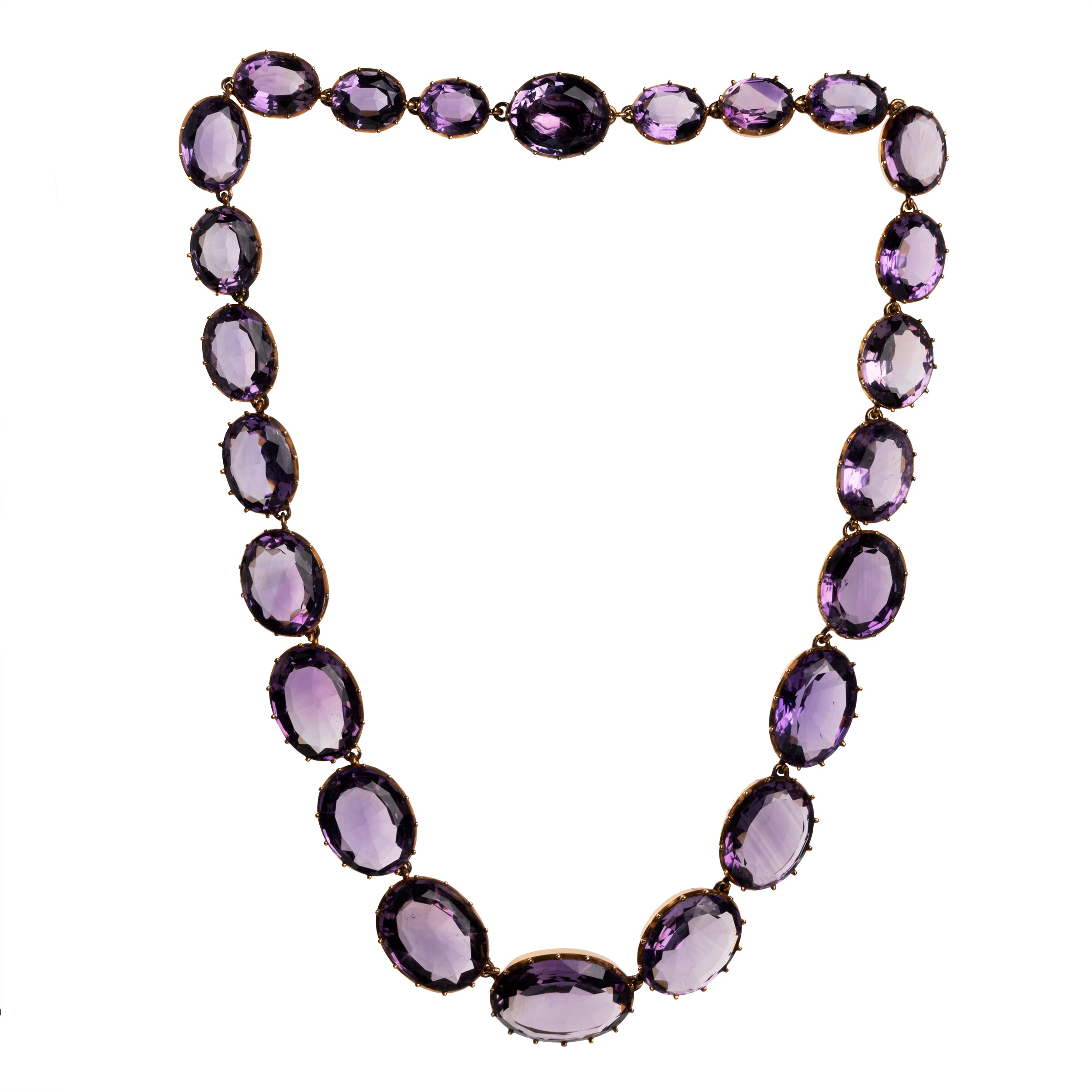 A beautiful 19th century amethyst rivière necklace, in classic gold collet settings. The large scale oval stones are all vibrant deep purple colors. English in origin. Circa 1870.