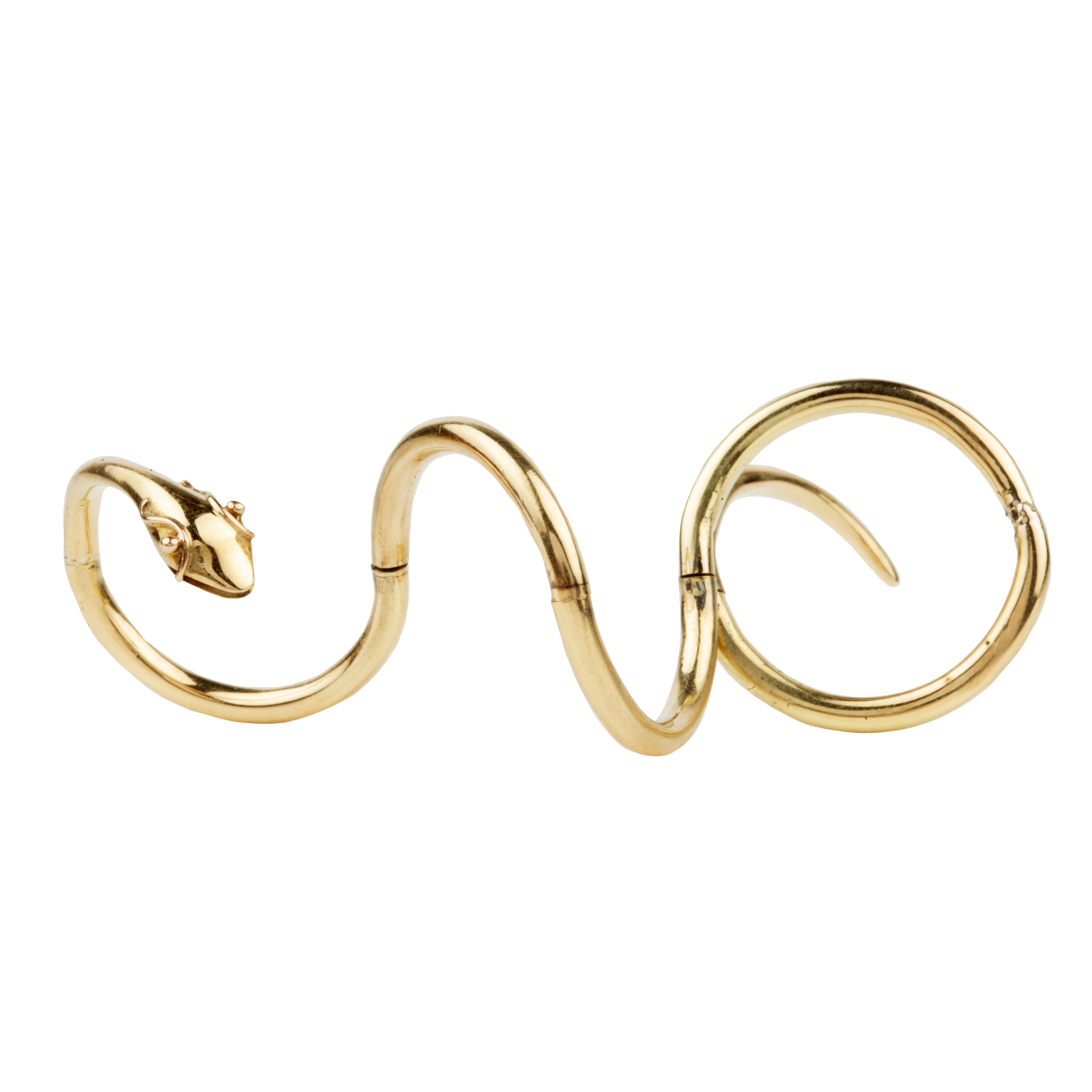 19th century articulated gold snake ring. Masterfully crafted with seven hinged sections that twist and curve around the finger. The ring is a rare find and remains in exceptional condition. A remarkably similar piece, seemingly by the same craftsman, is featured in the book Serpentina and displayed at the German jewelry museum in Pforheim. Greman in origin. Circa 1850.