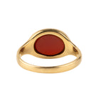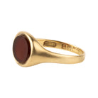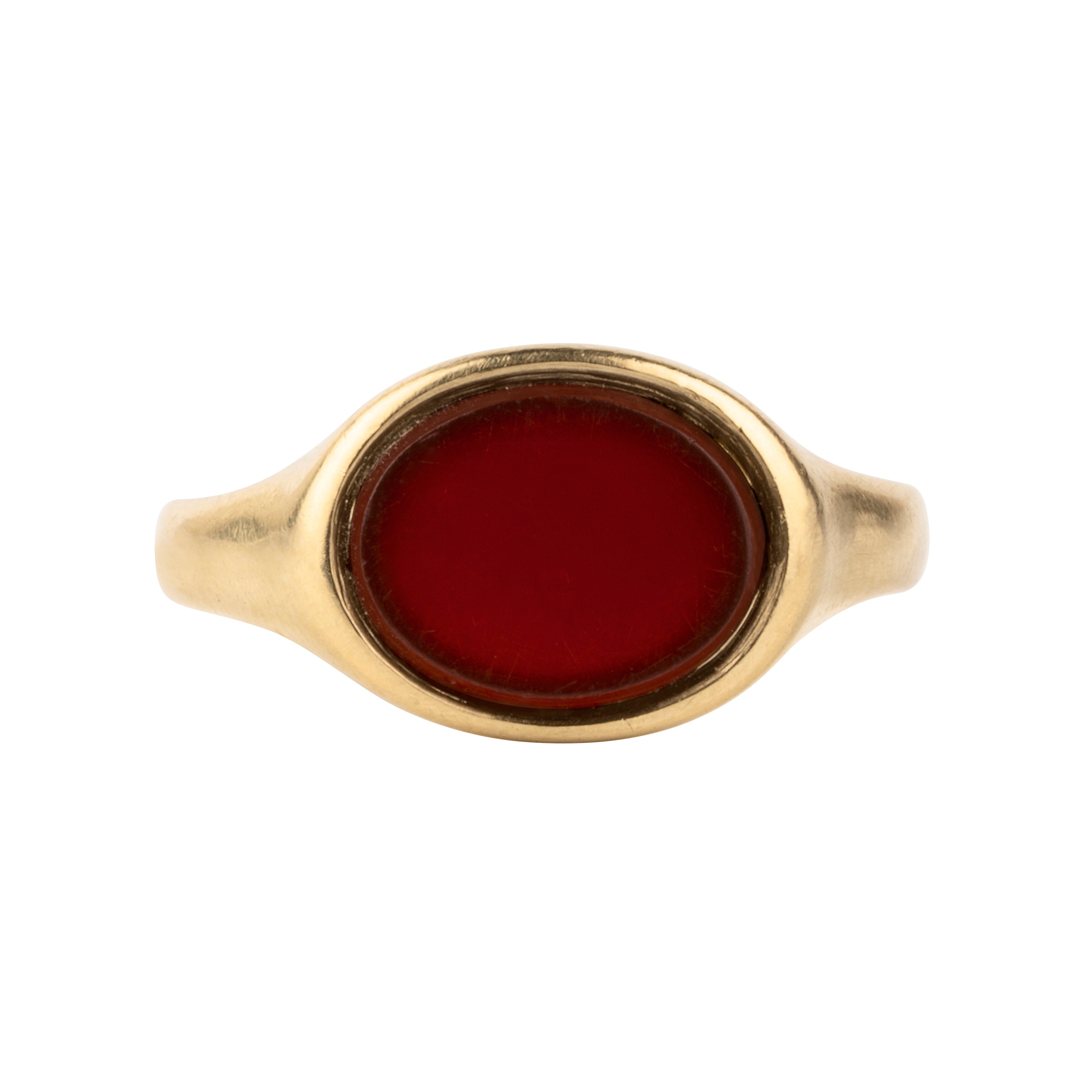 An antique ring with the softness that only comes with time. A deeply colored carnelian stone is set in 18k yellow gold. There are hallmarks for London, but the date letter has worn away with time. The style and materials lead us to date the ring to the late 19th century.