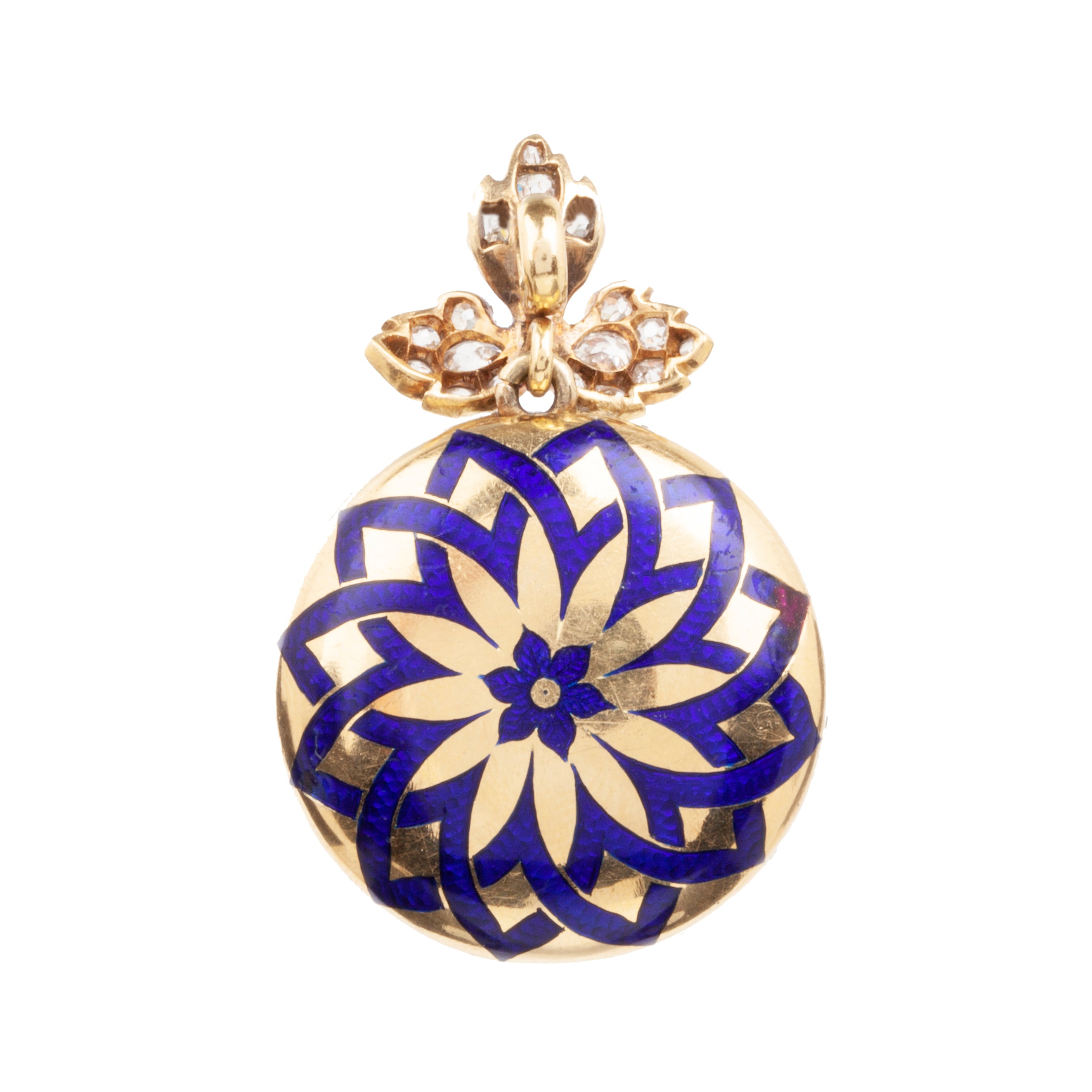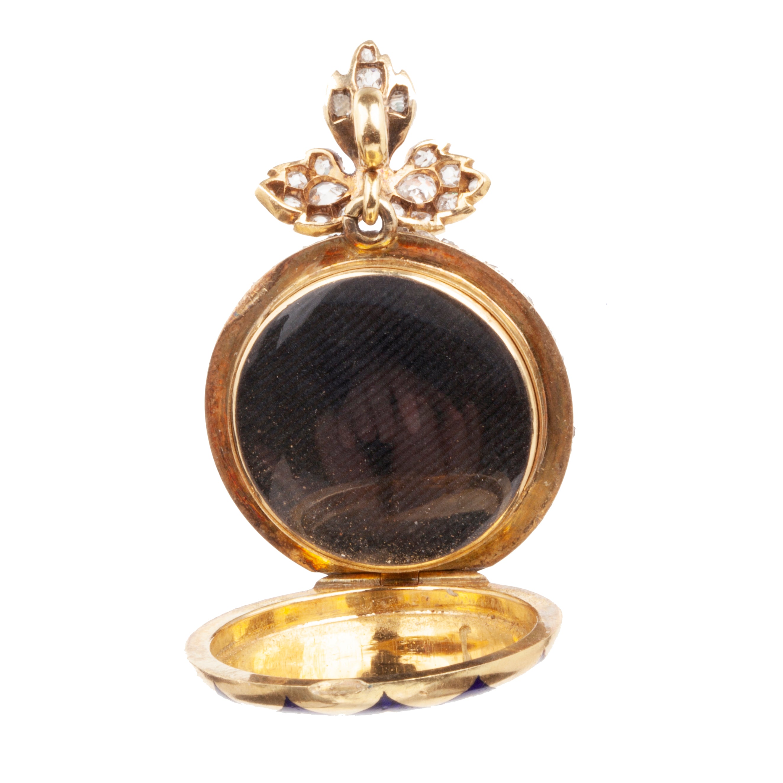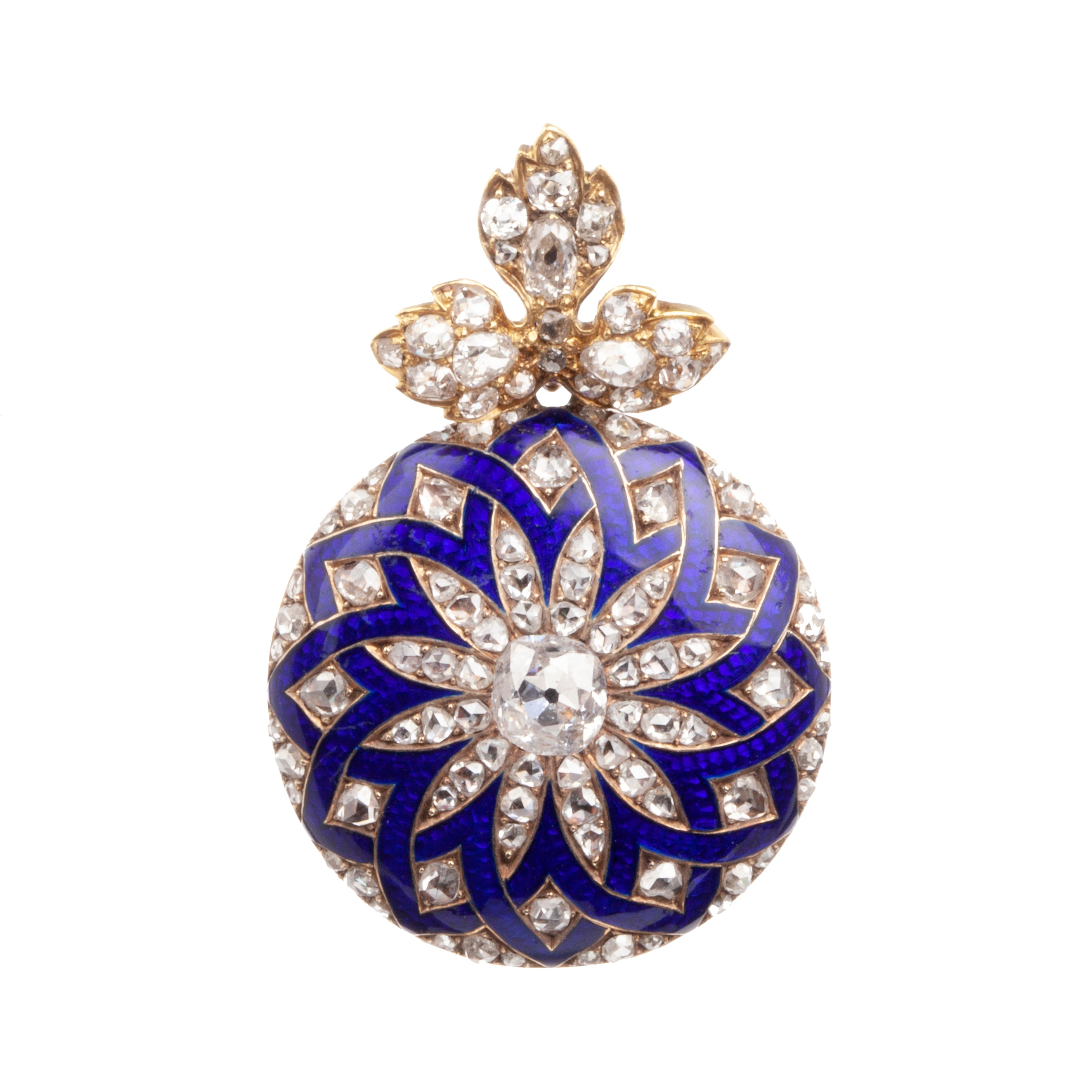 19th century diamond and blue enamel locket, in 18k gold. The old Mine cut diamonds are approximately 9 carats in total diamond weight. The locker features a beautiful decorative royal blue enamel and a floral diamond bail. Original locket fixtures and glass are intact. English in origin. Circa 1870.
