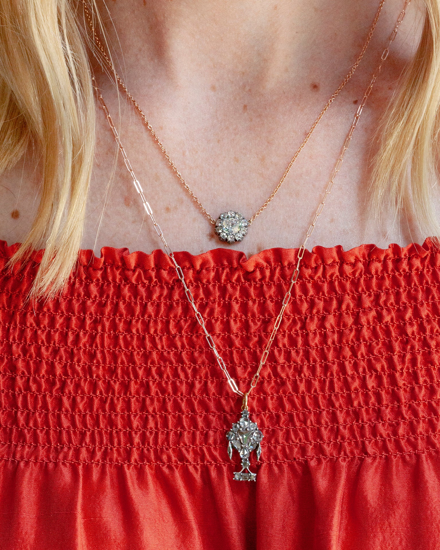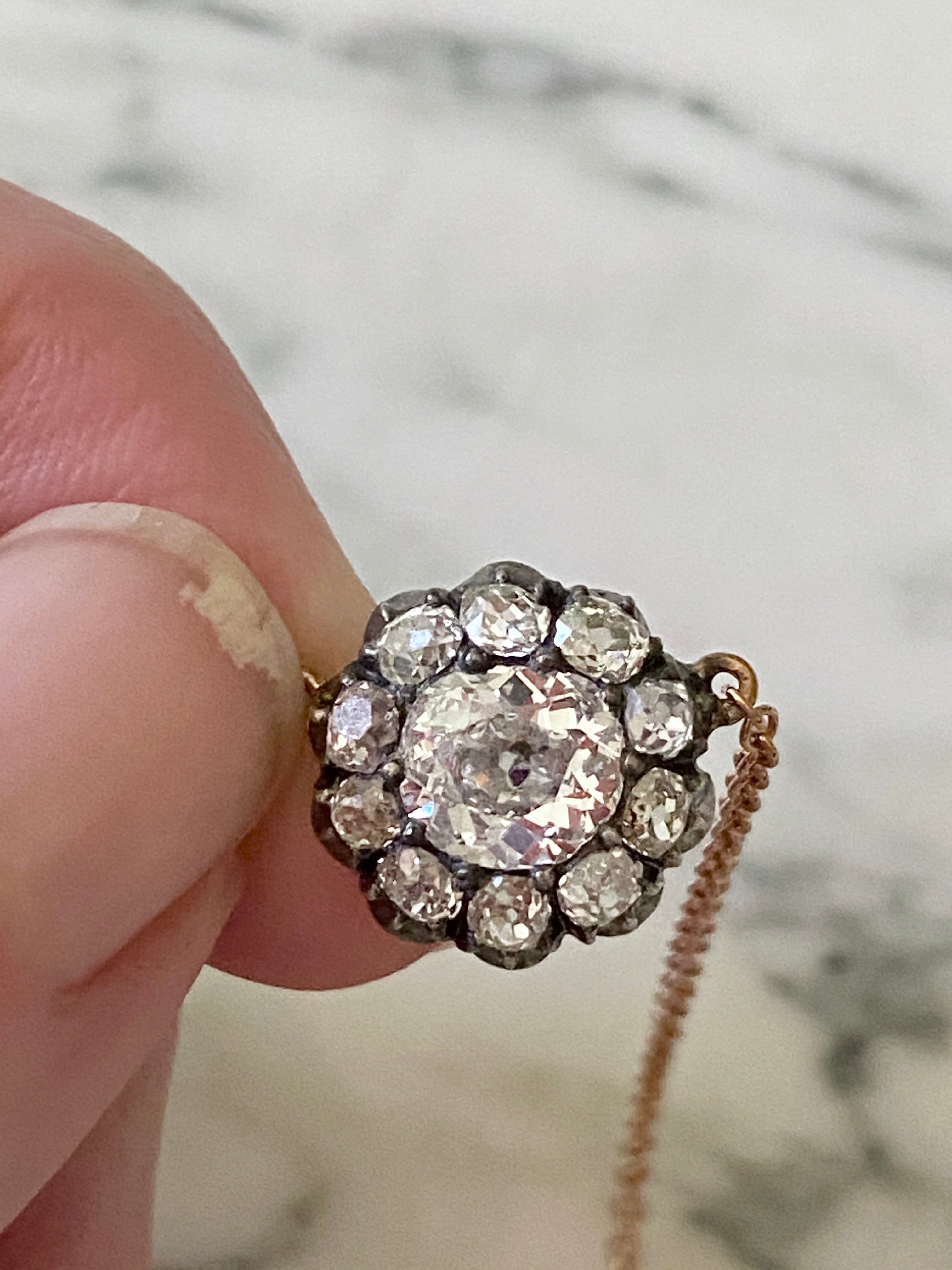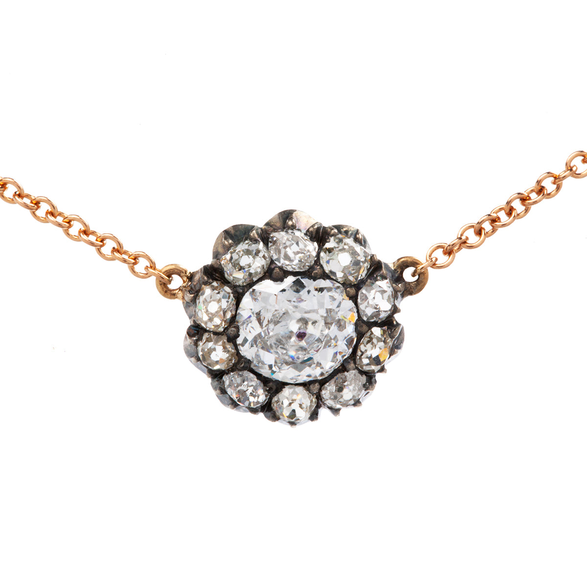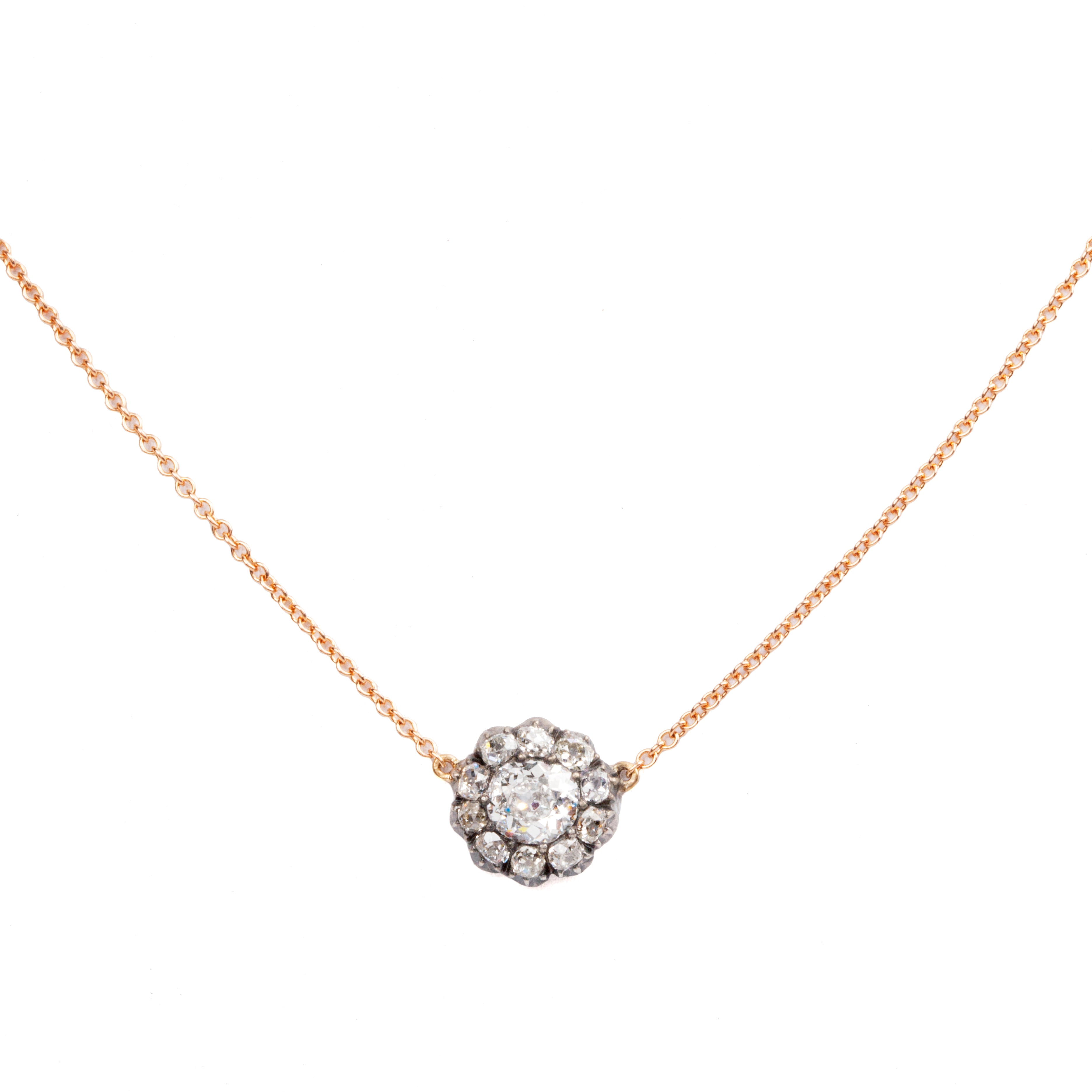19th century Old Mine cut diamond cluster pendant, in silver topped gold setting. Approximately 1.15 carats in total diamond weight. There is a tiny natural ruby inclusion in the shape of an heart within the center diamond. Originally part of a larger necklace, converted into pendant necklace.