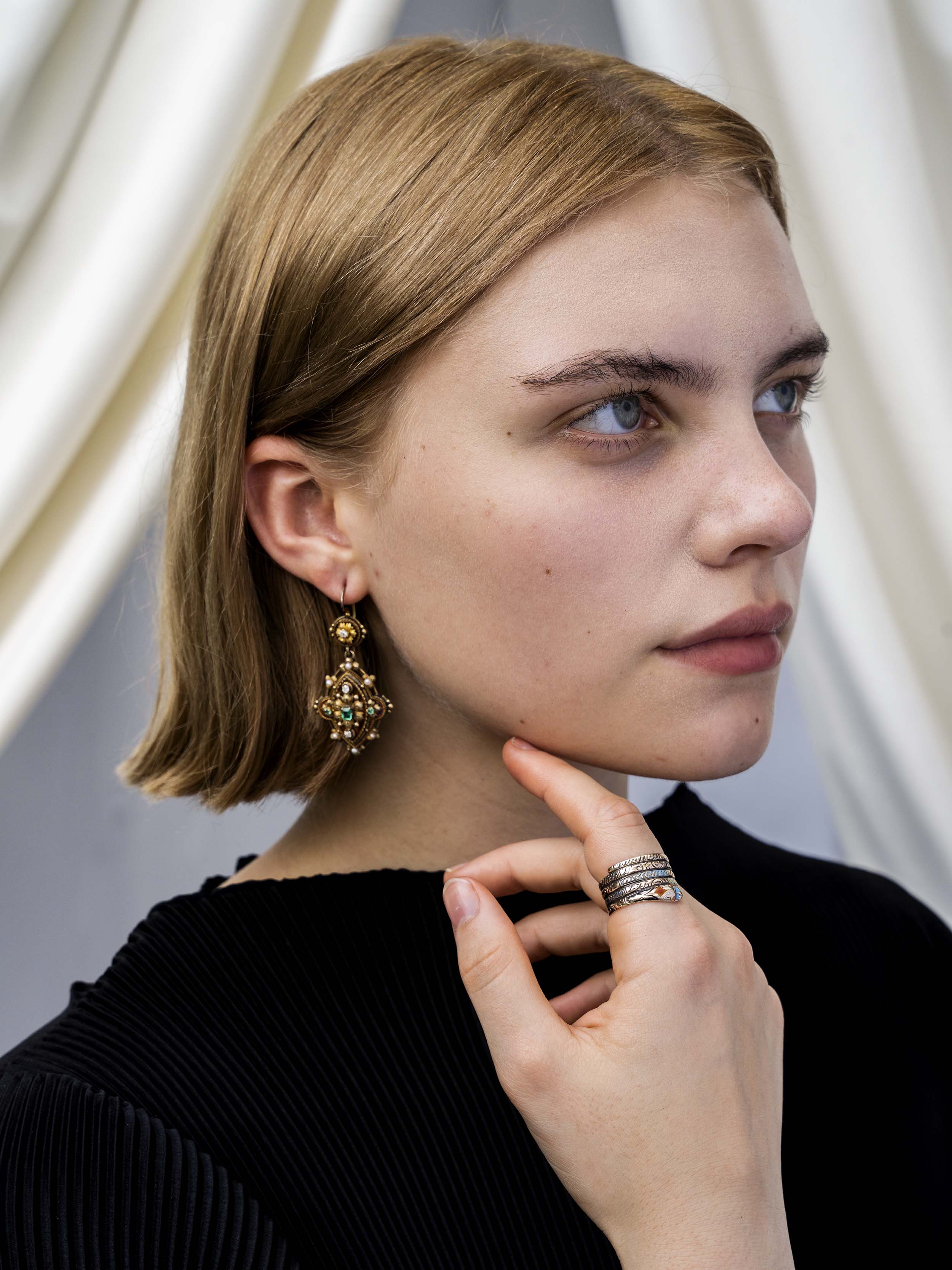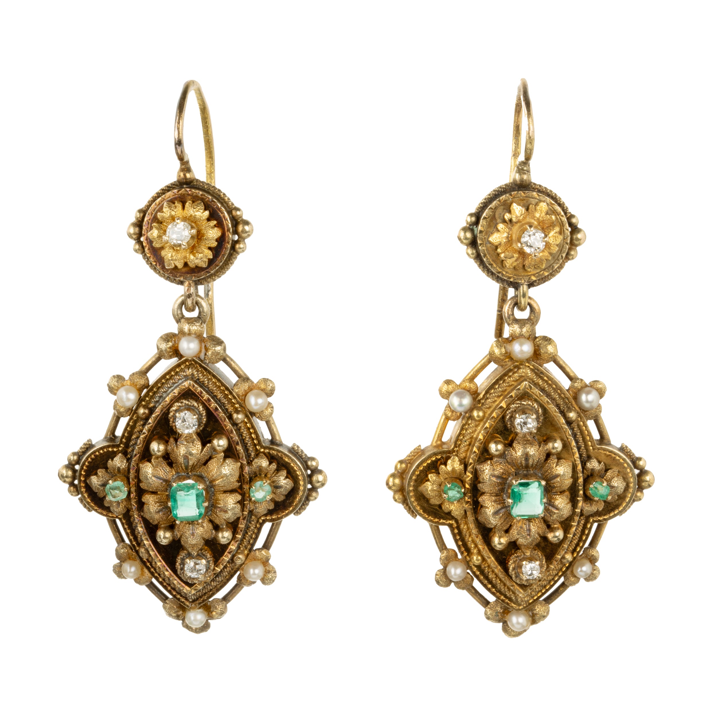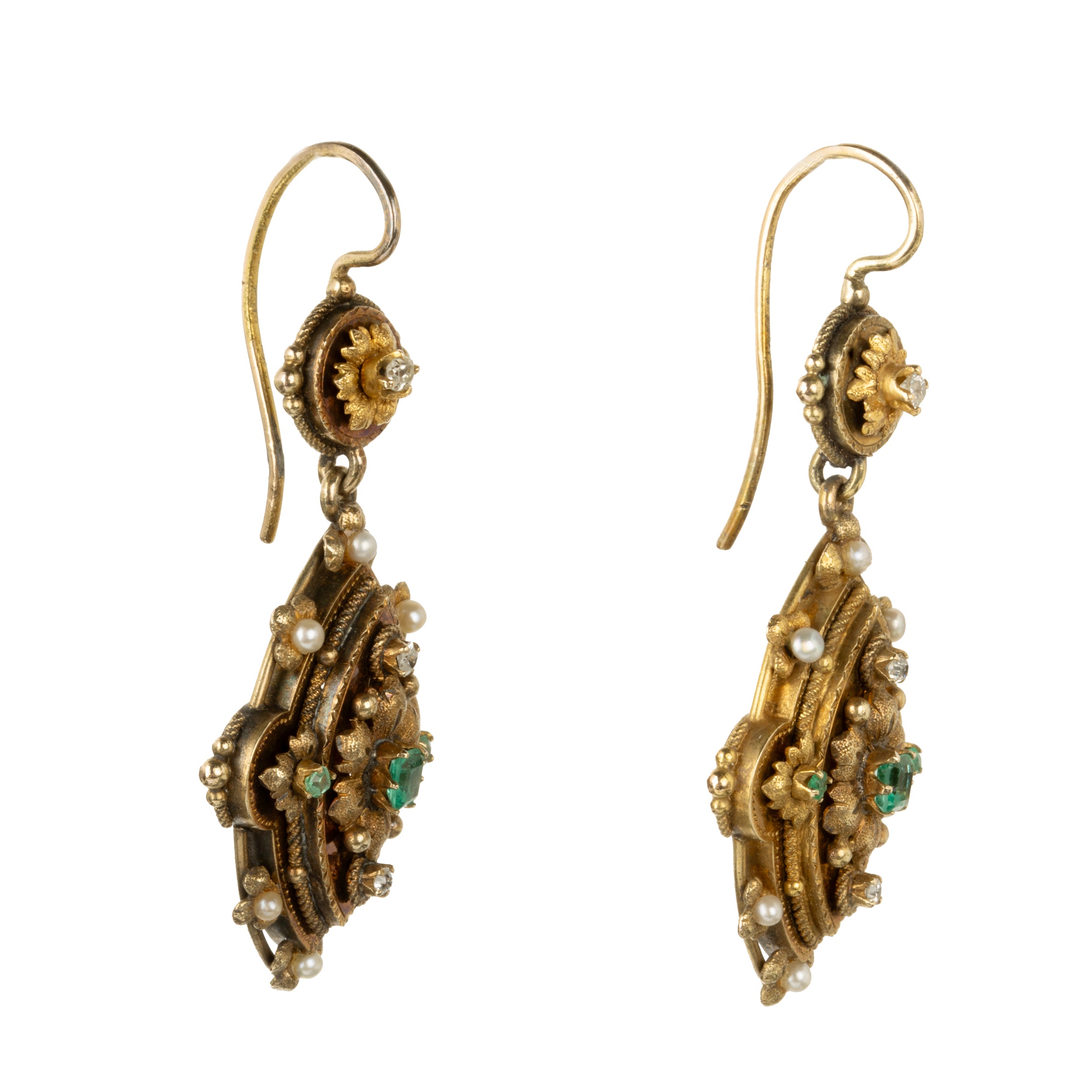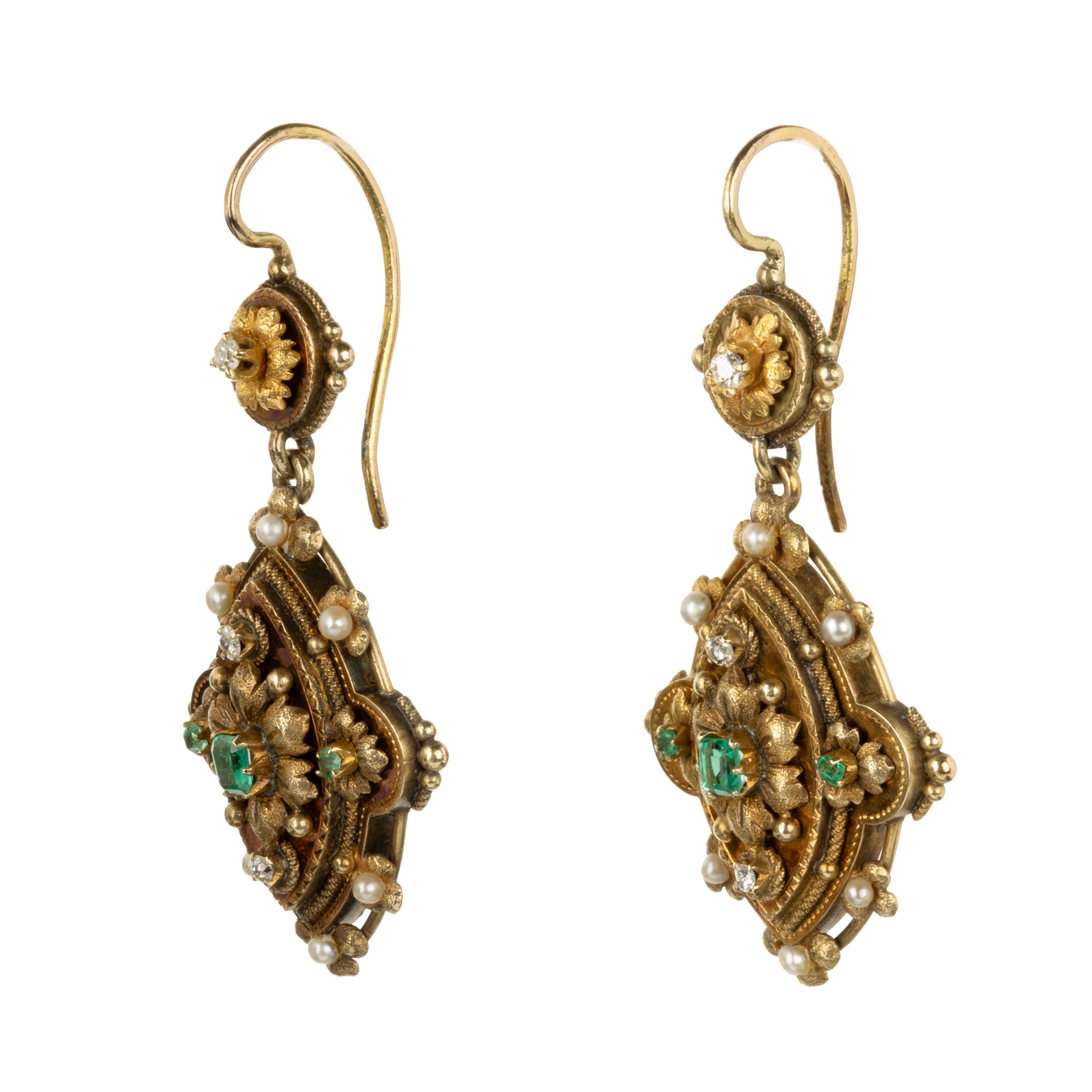 Floral motifs with gemstone details in a classical design in 18k gold. Seed pearls, and old mine cut diamonds accent the emerald stones. Continental European, circa 1870.