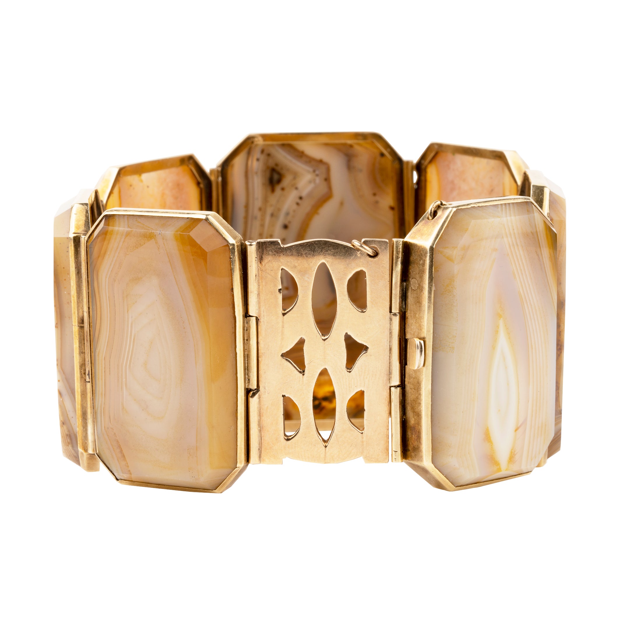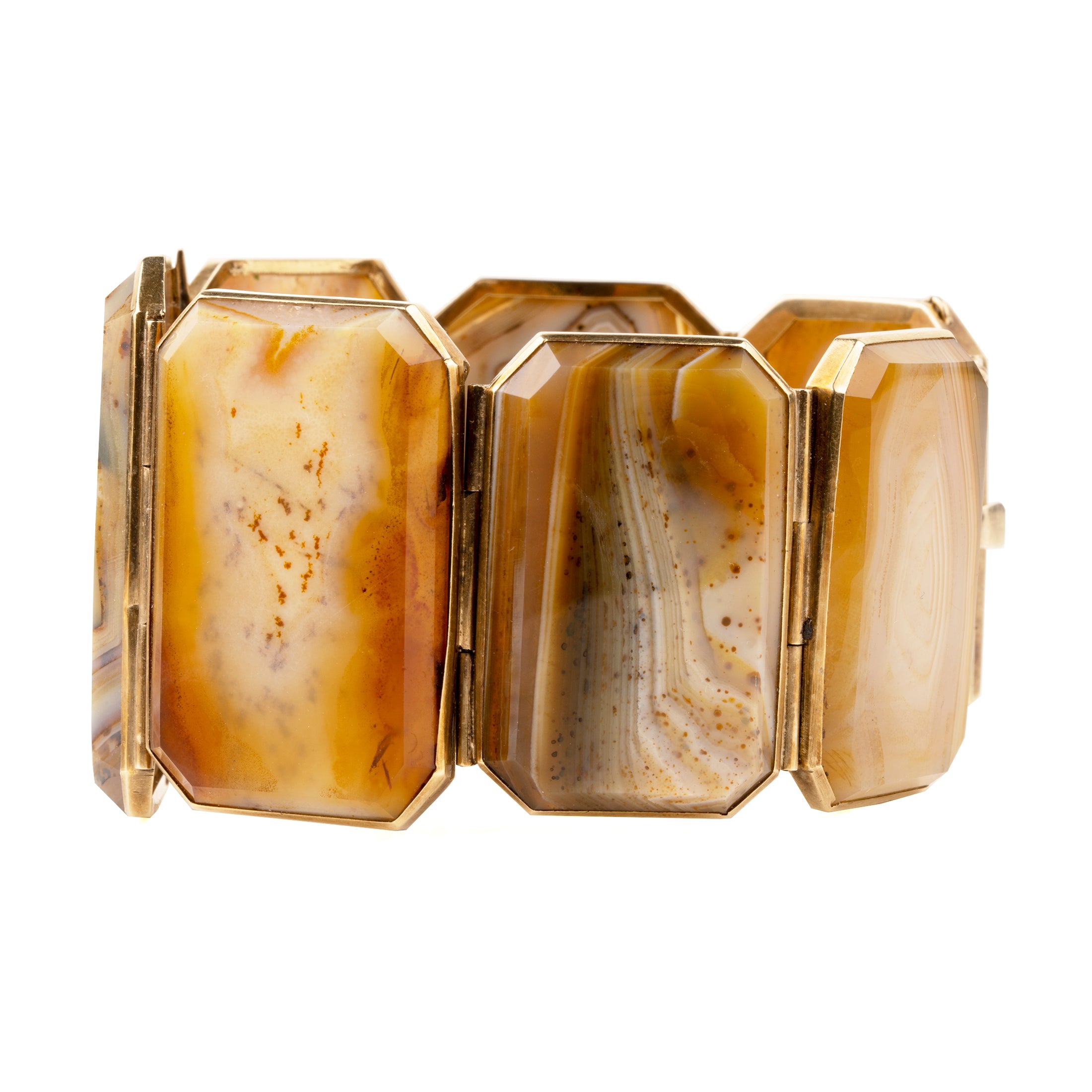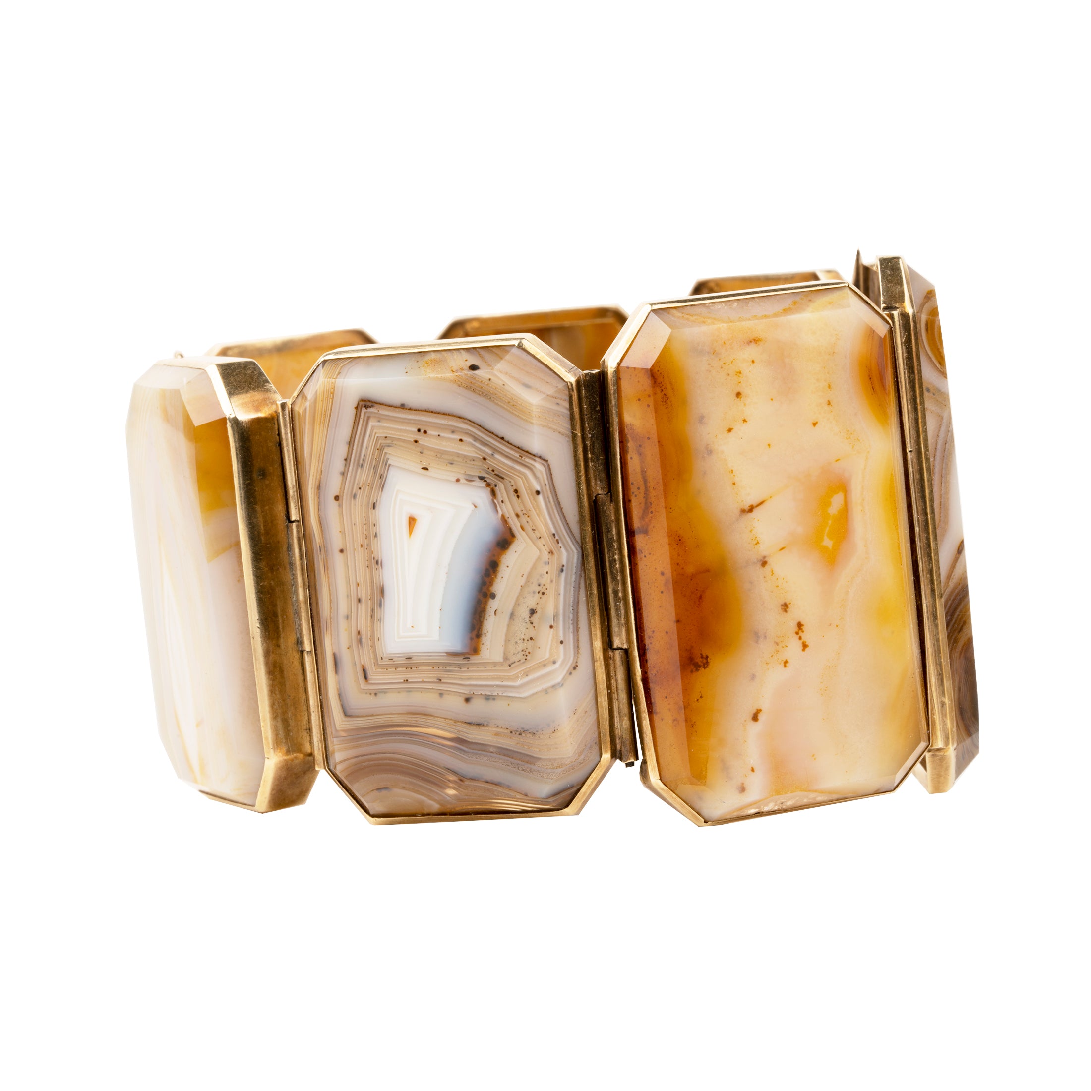 Mid 19th century bracelet with vivid agate specimens. Beautifully crafted in 15ct gold. Bracelets like these were often made from agate stones found in Scotland. English in origin. Circa 1860.