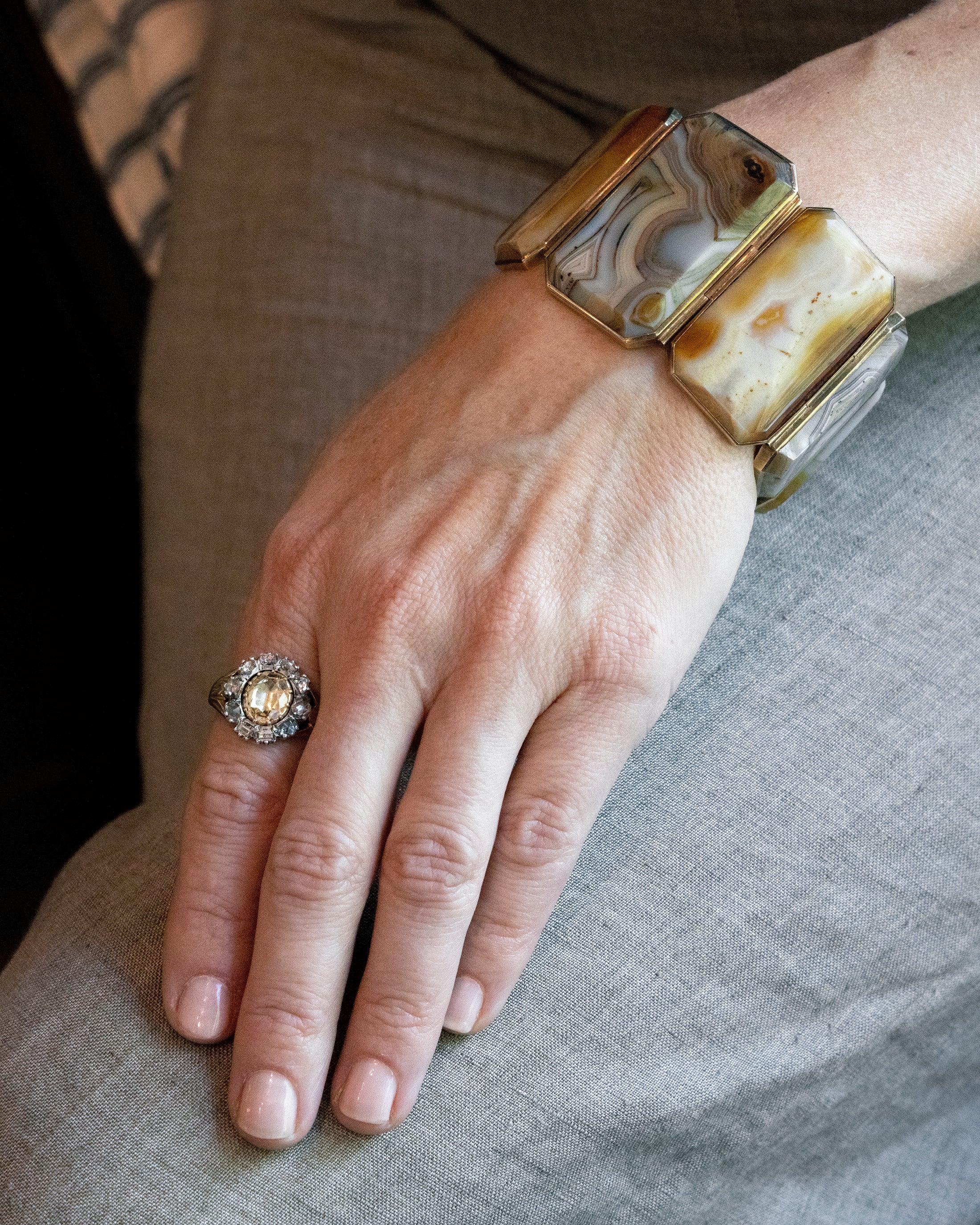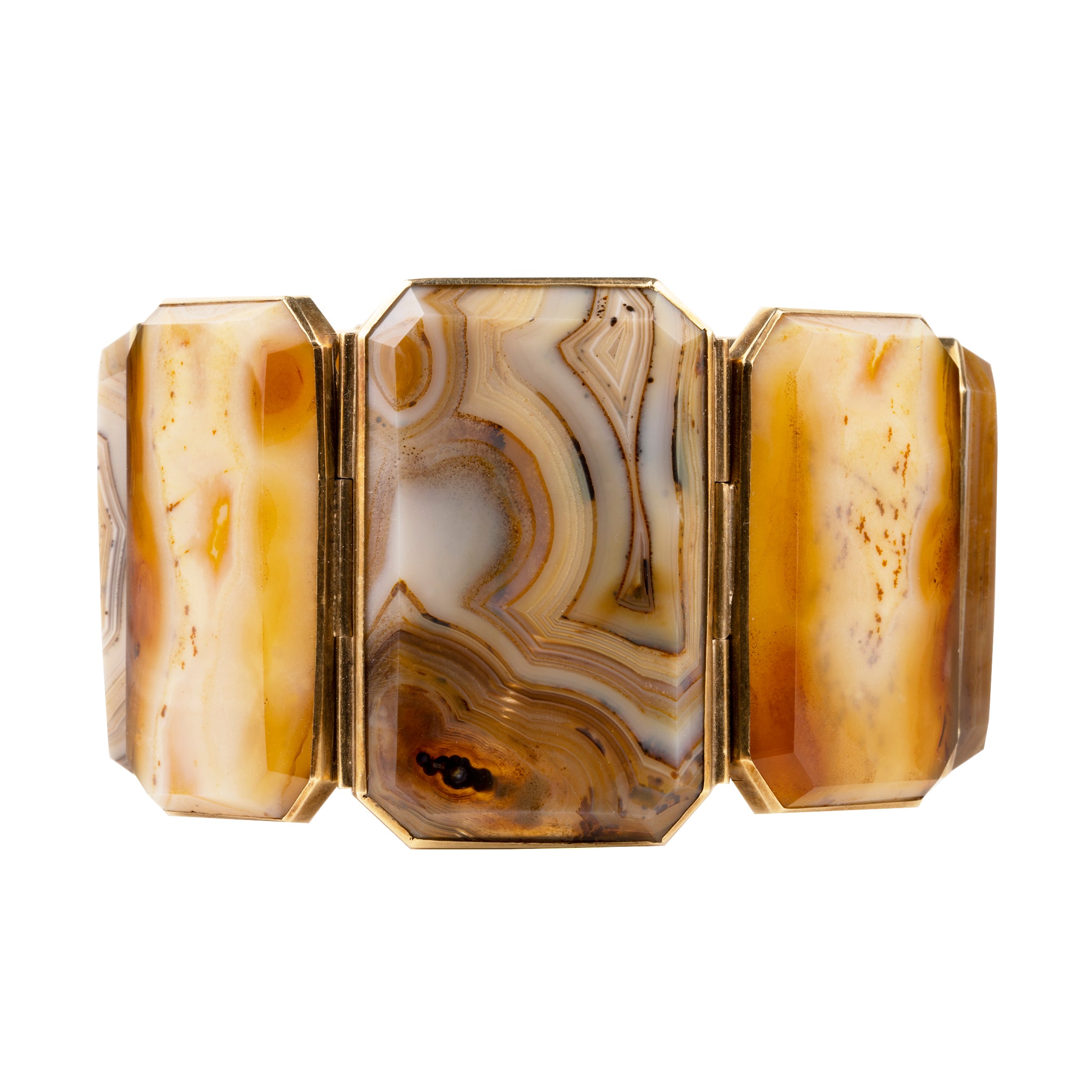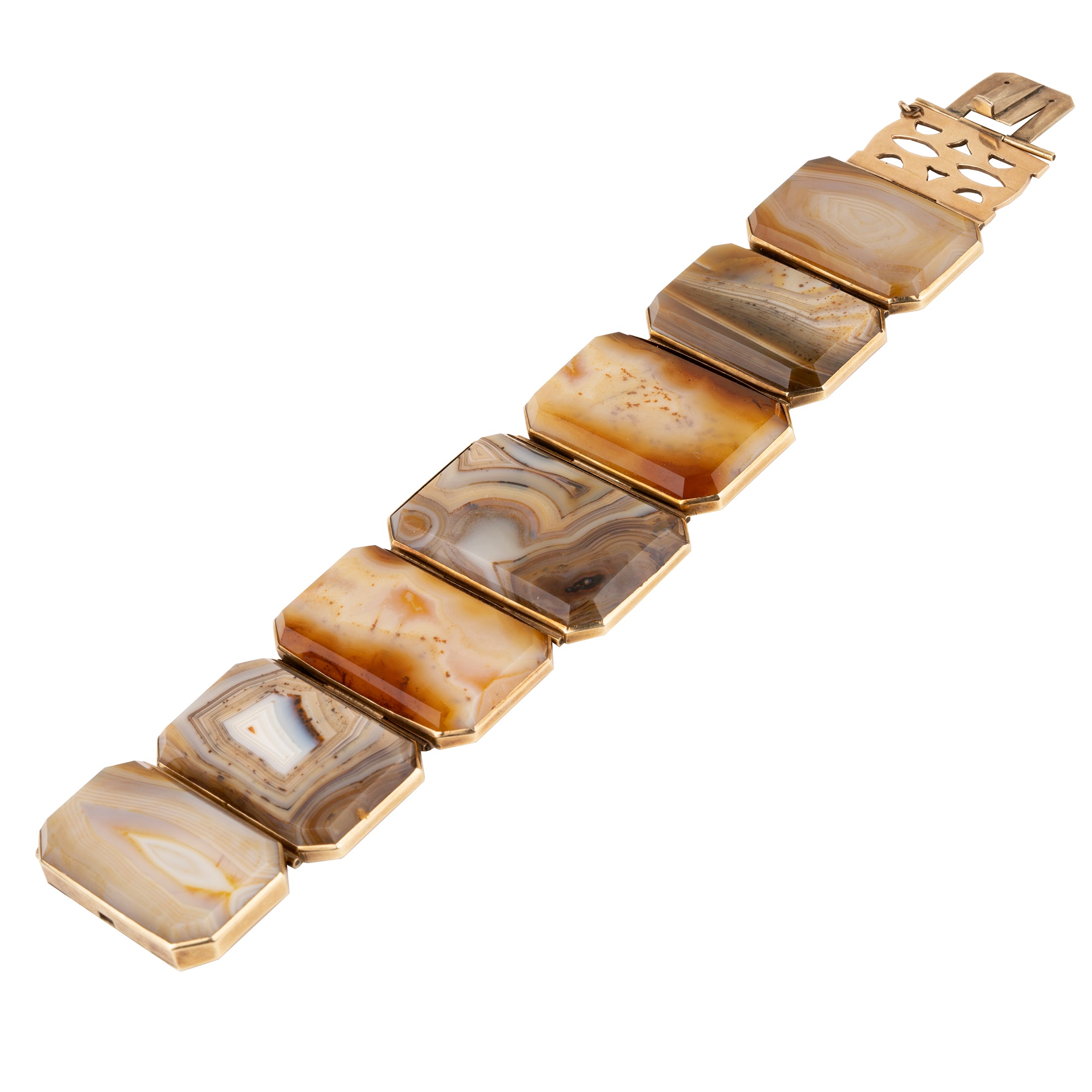 Mid 19th century bracelet with vivid agate specimens. Beautifully crafted in 15ct gold. Bracelets like these were often made from agate stones found in Scotland. English in origin. Circa 1860.