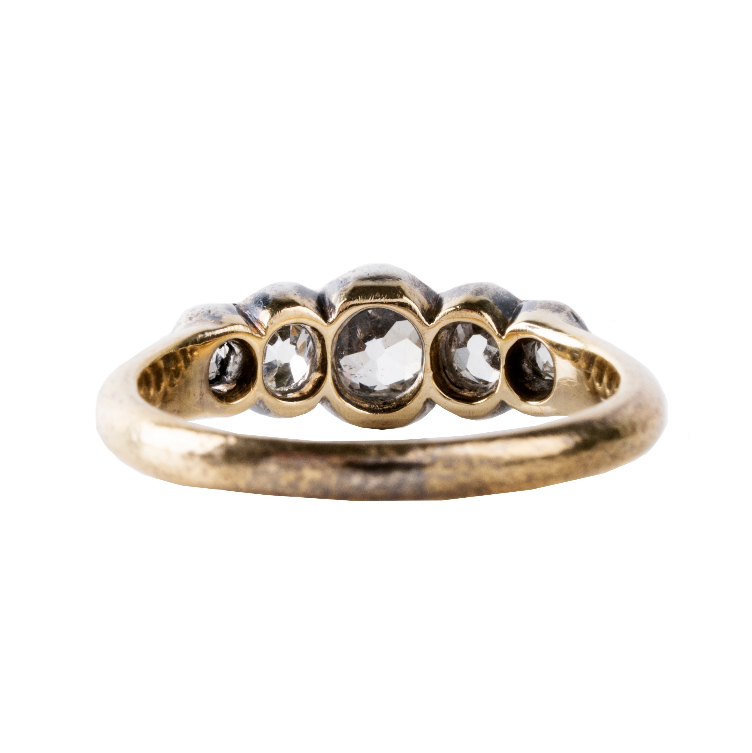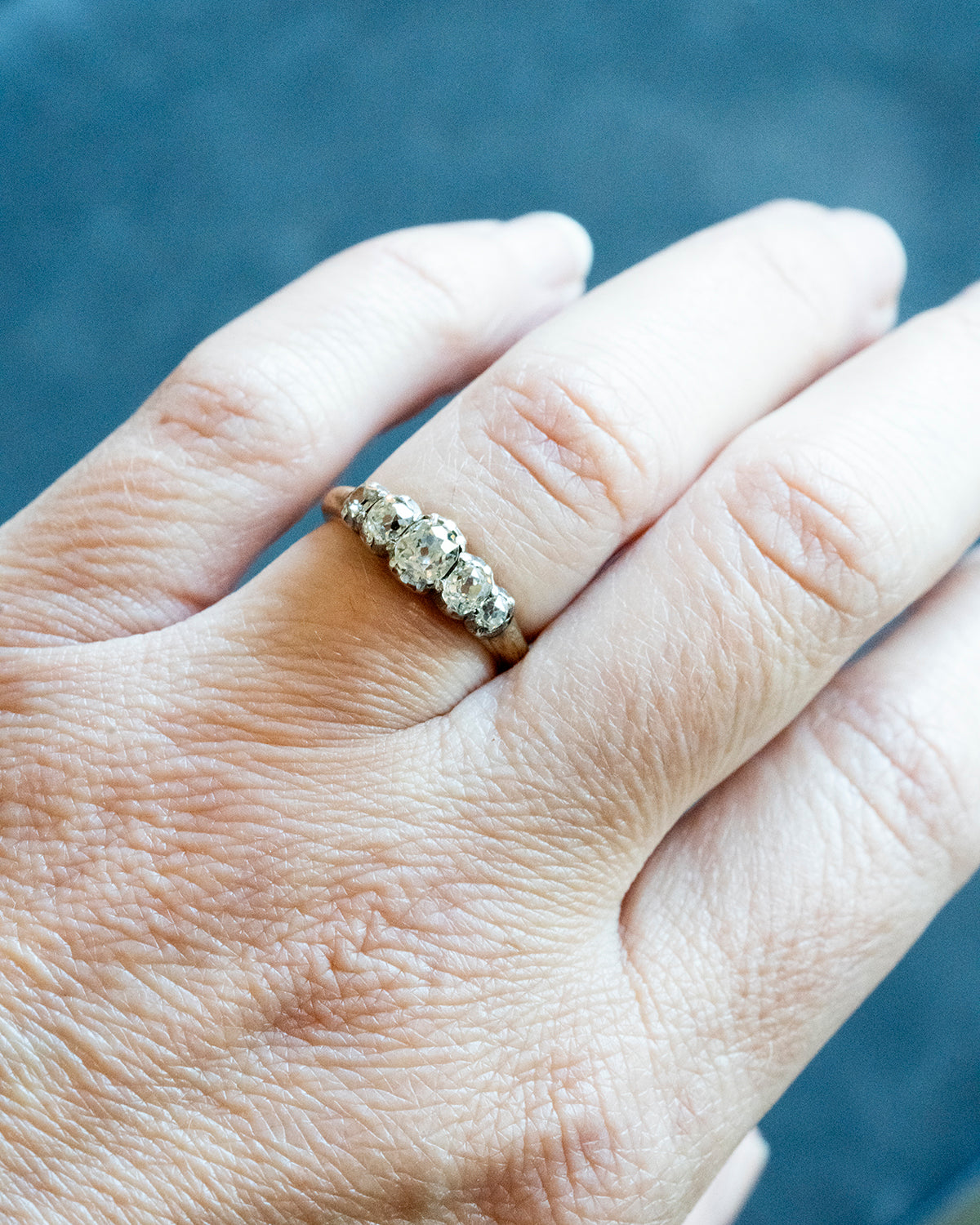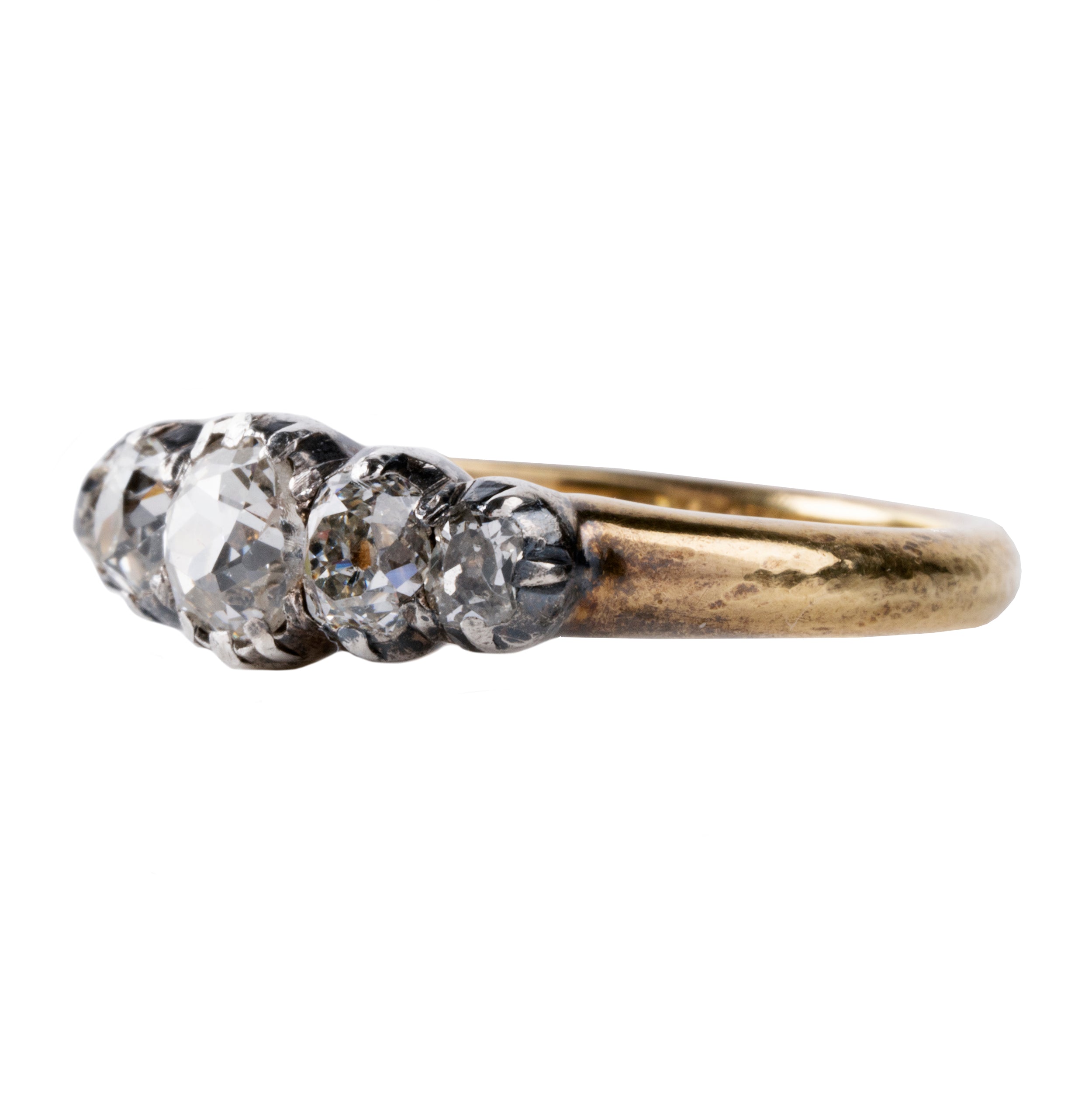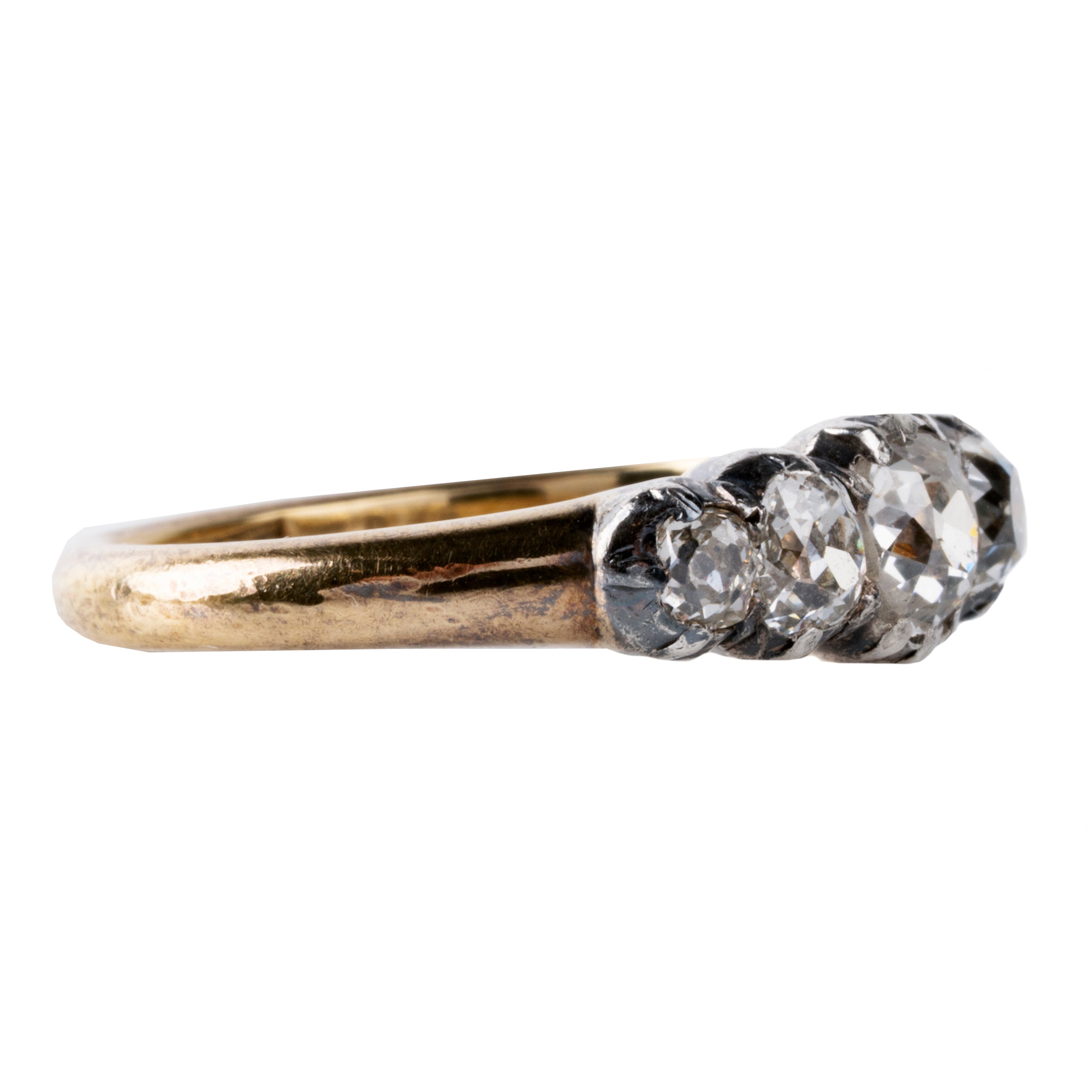 19th century five stone old mine cut diamond ring. The diamonds are set in silver on gold open back settings. English in origin. Circa 1860.