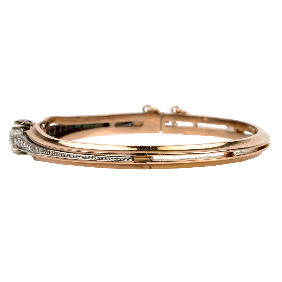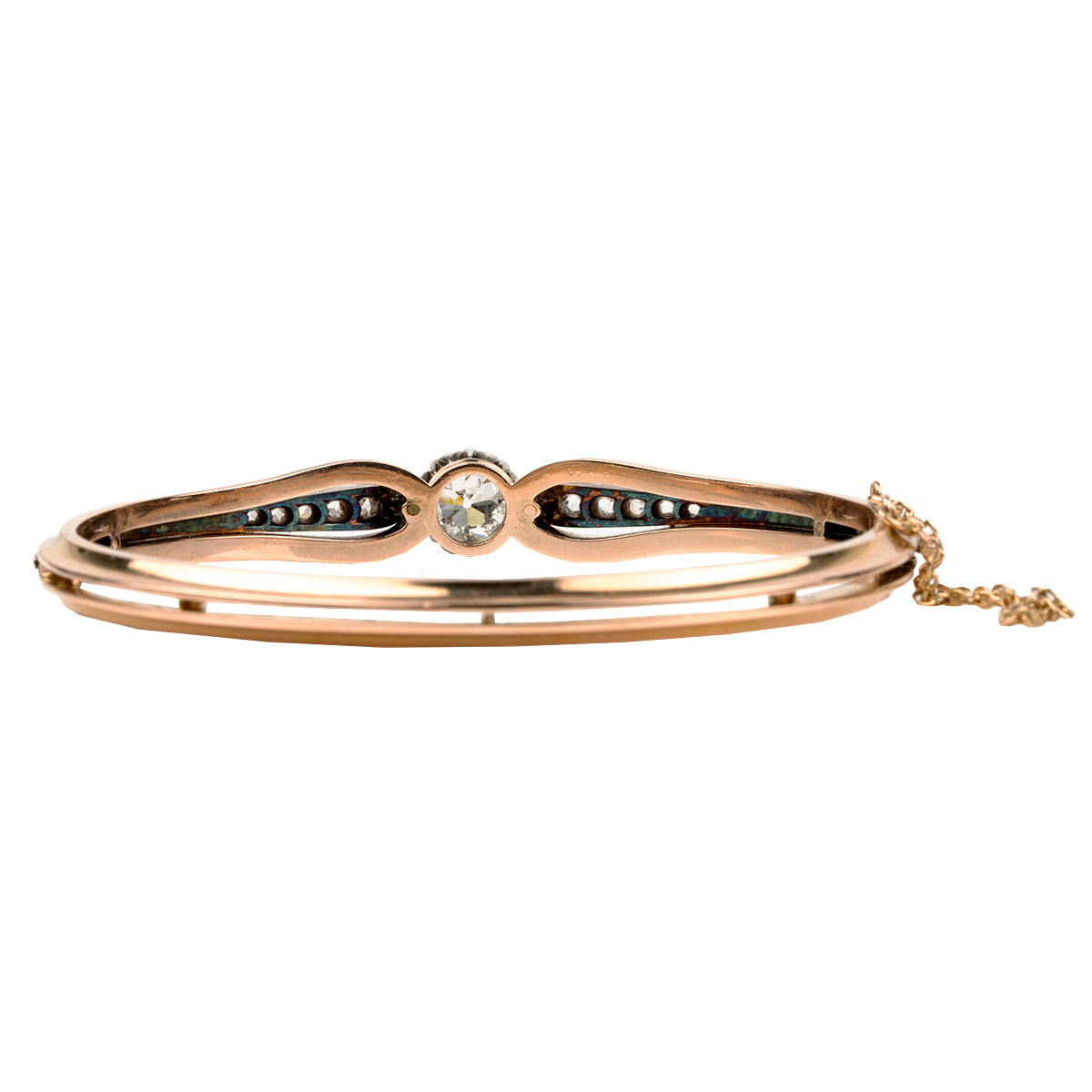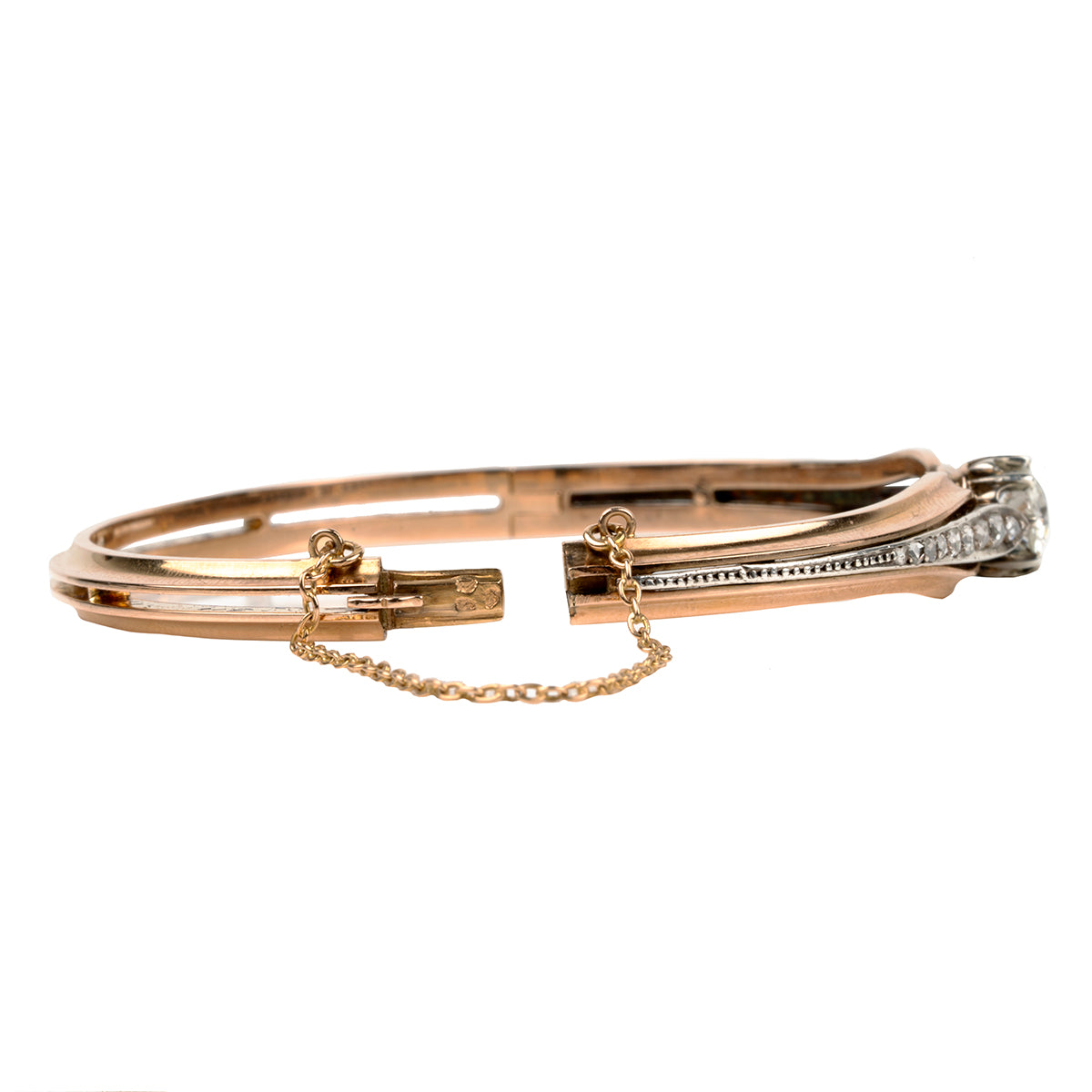 19th Century French diamond bangle bracelet, in 18k rose gold. The Center diamond is an old European cut diamond, approximately 1.06 carats, flanked by rose cut diamonds. French hallmarks.