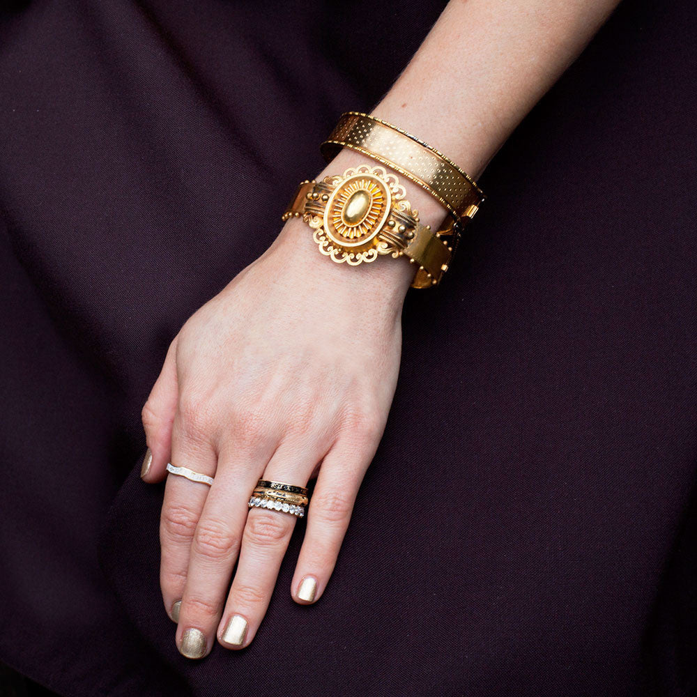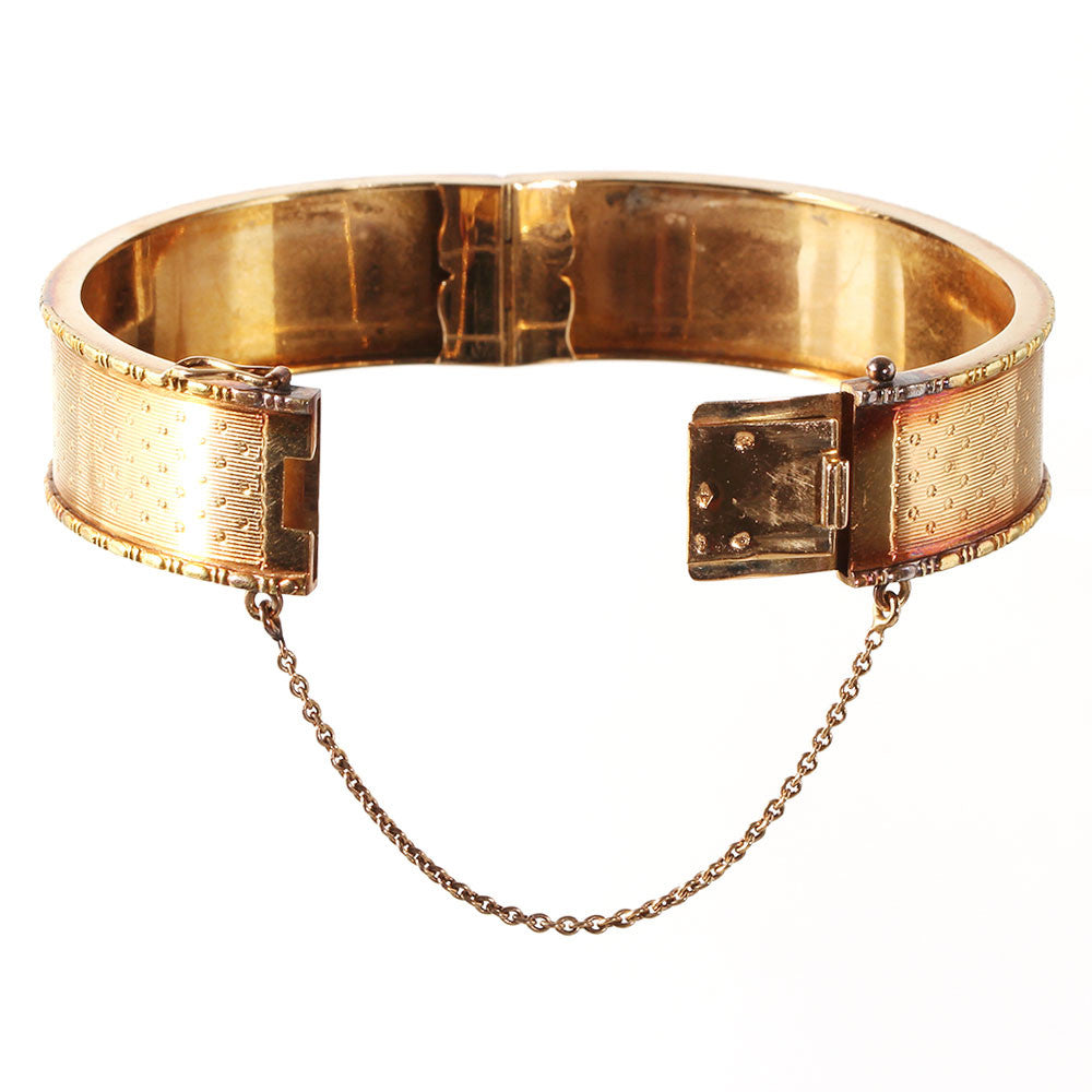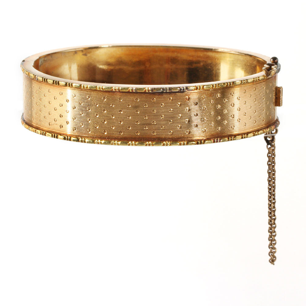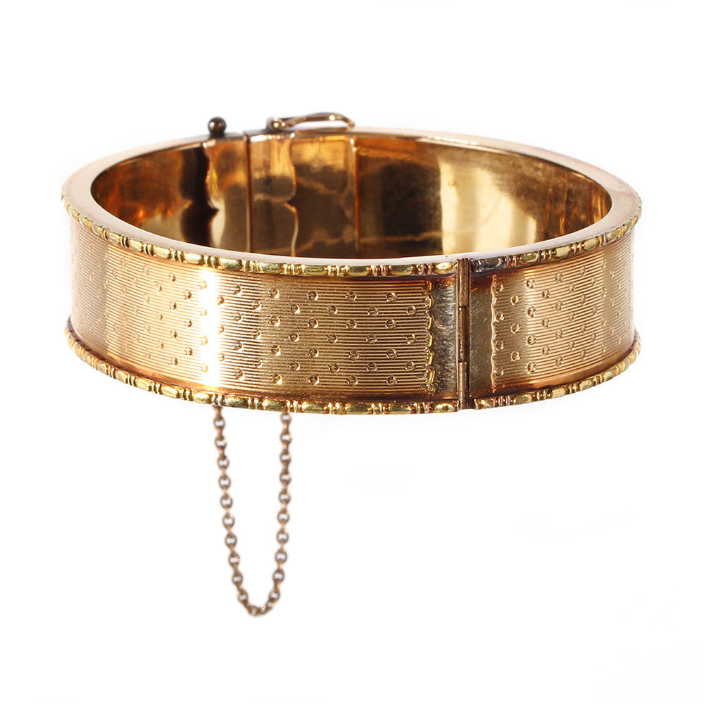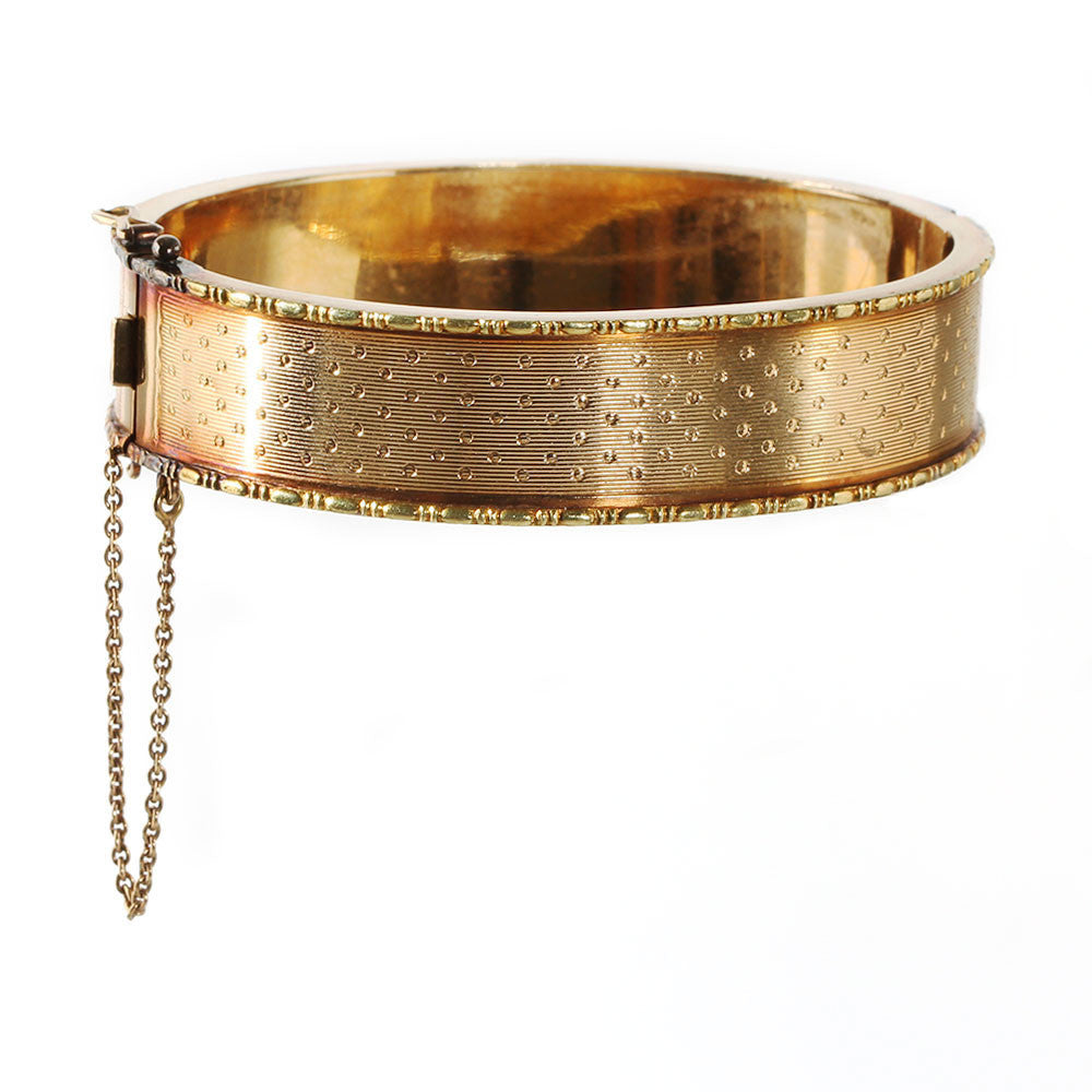 Second Empire French bangle bracelet with beautiful patina and hand engraved dotted detail. Bright 18k yellow gold, complete with french hallmark and unidentified makers mark. Would stack well with other Victorian era or modern bracelets. Circa 1860-80. Generous in size for bracelets of this period. Measures 7" in circumference. 5/8" wide.