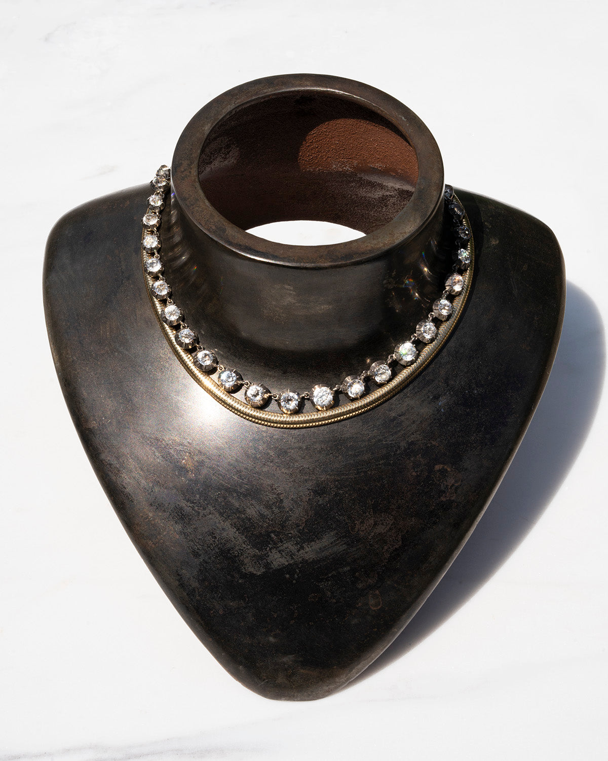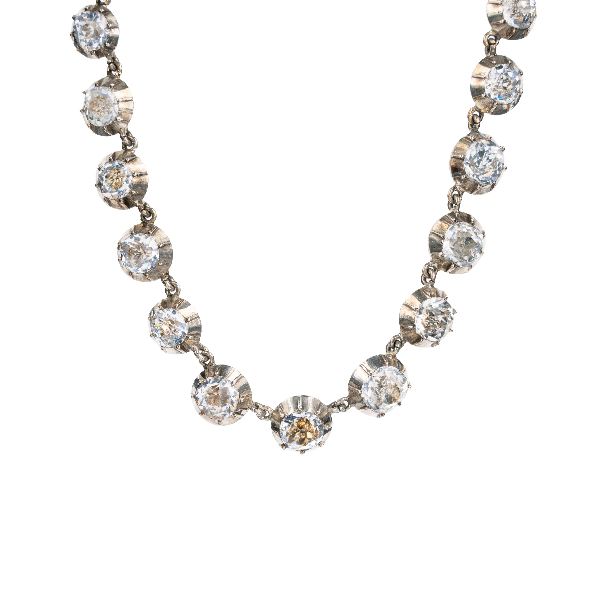 19th century French paste rivieré necklace. Each paste is set in sterling silver on cutaway settings. It lies beautifully on the neck. French hallmarks. Circa 1840.