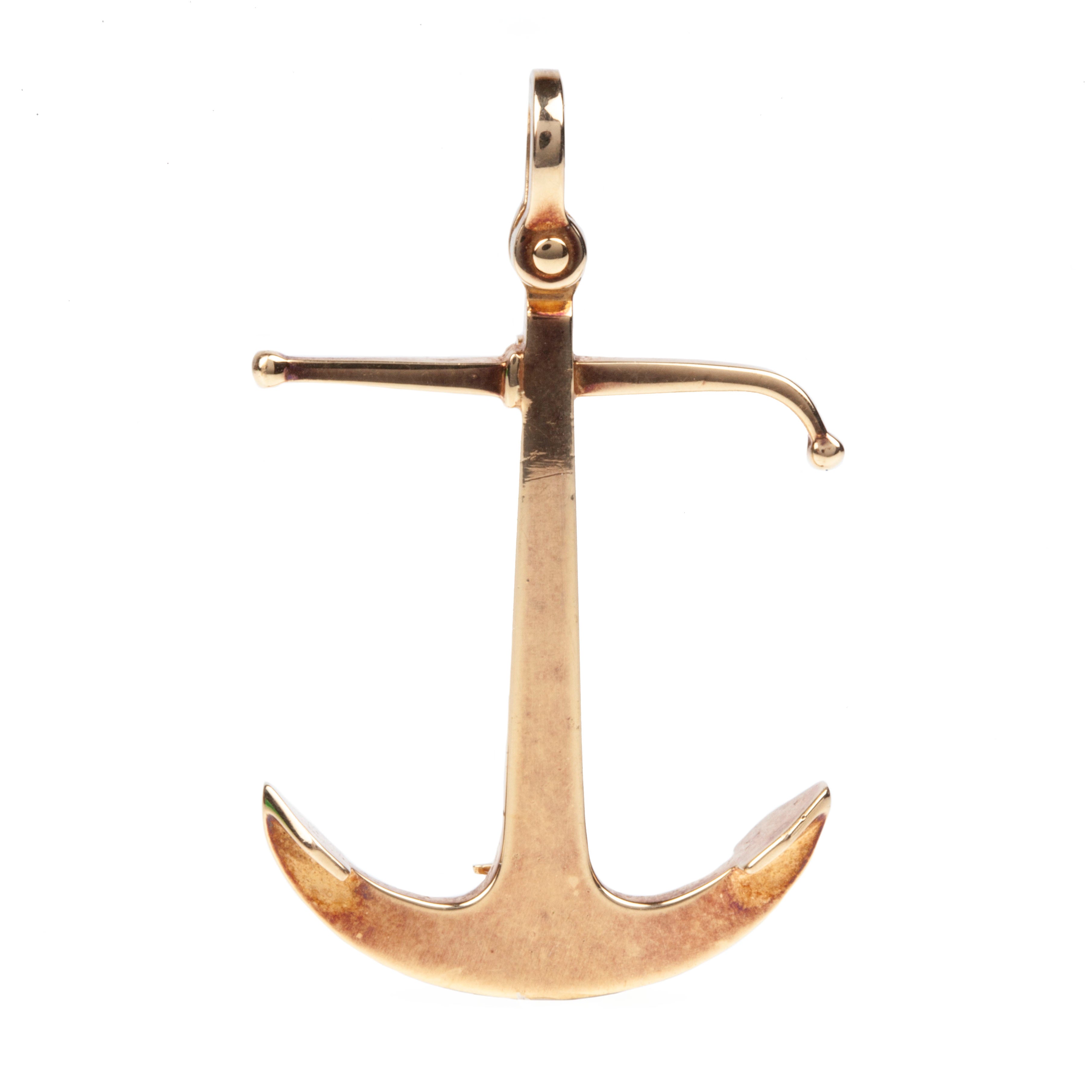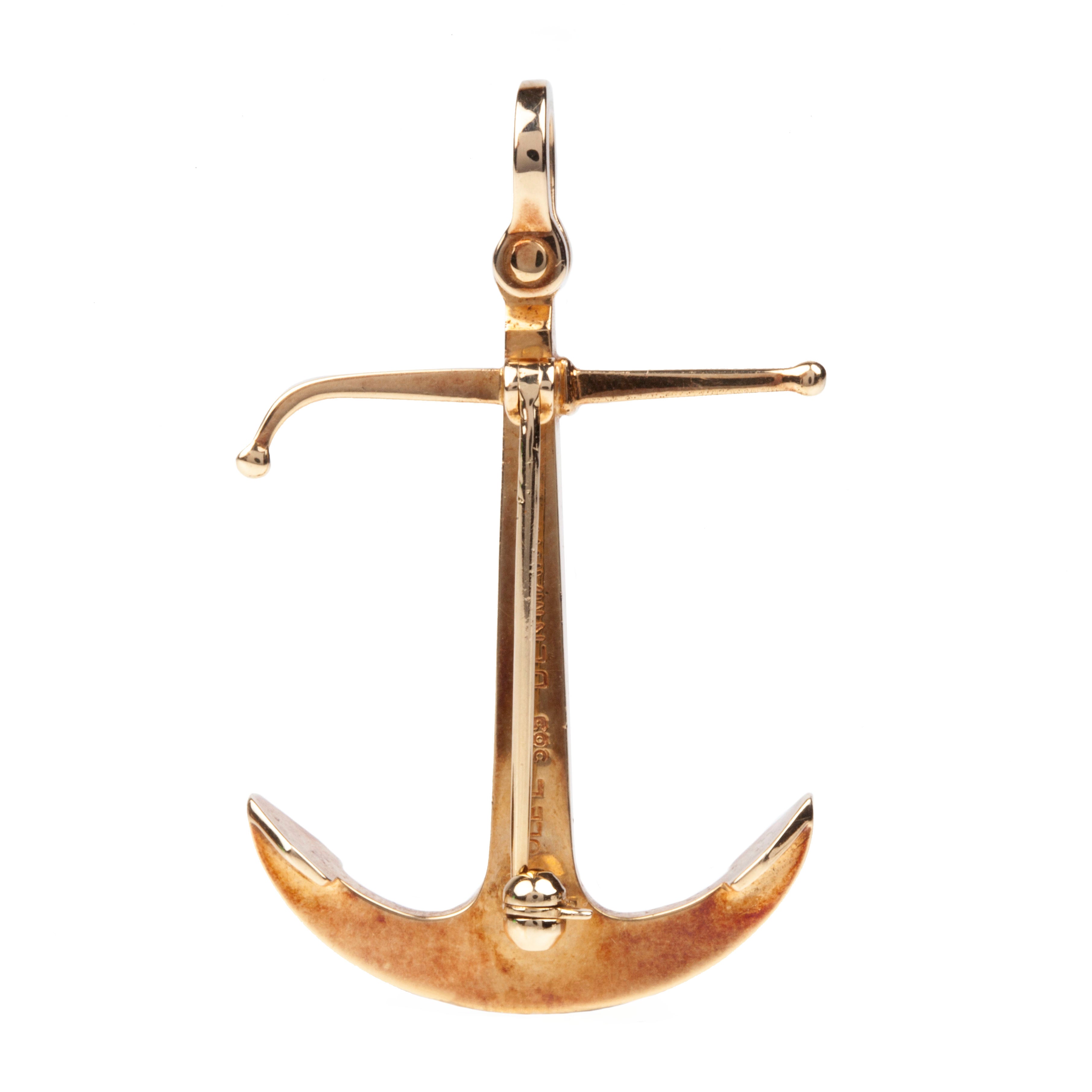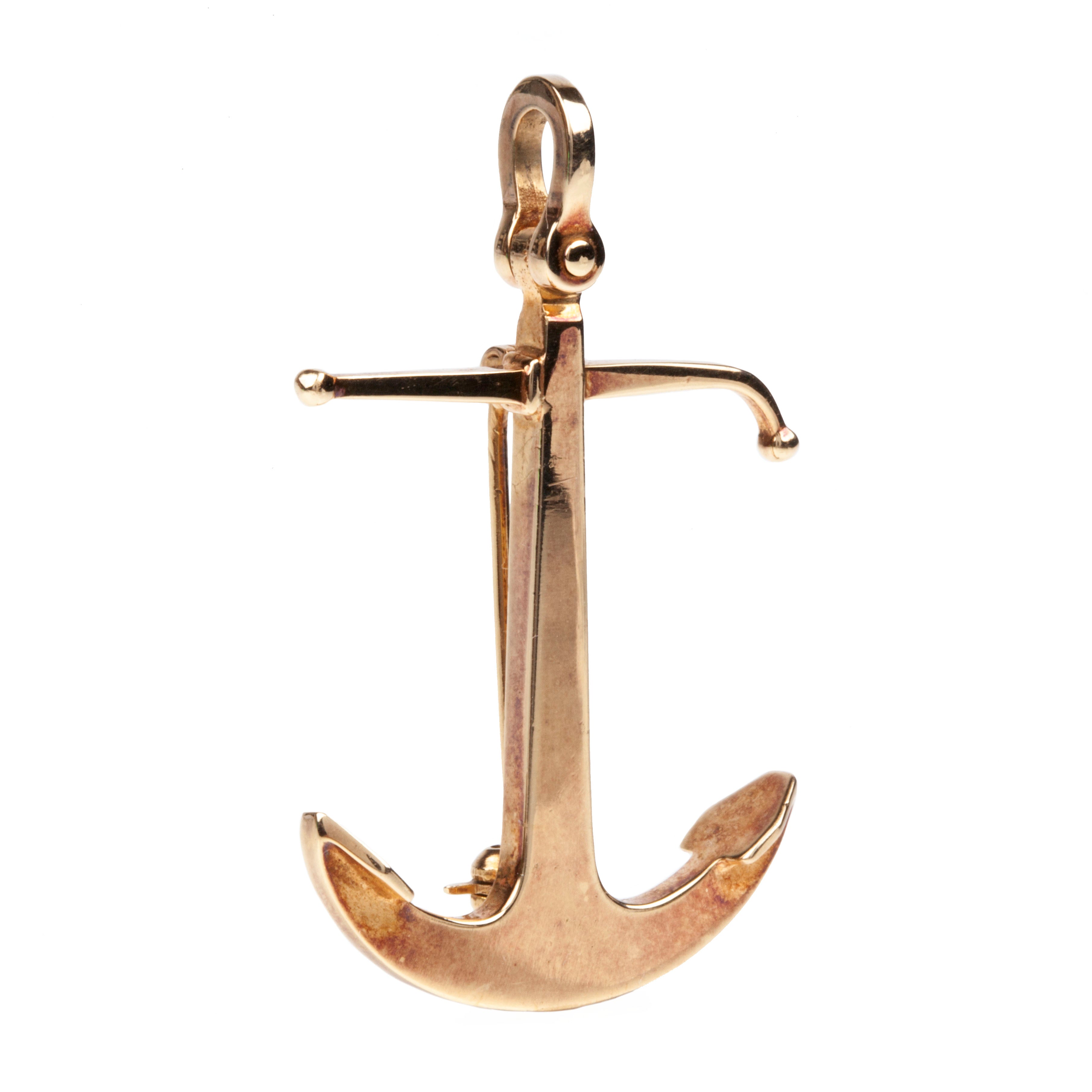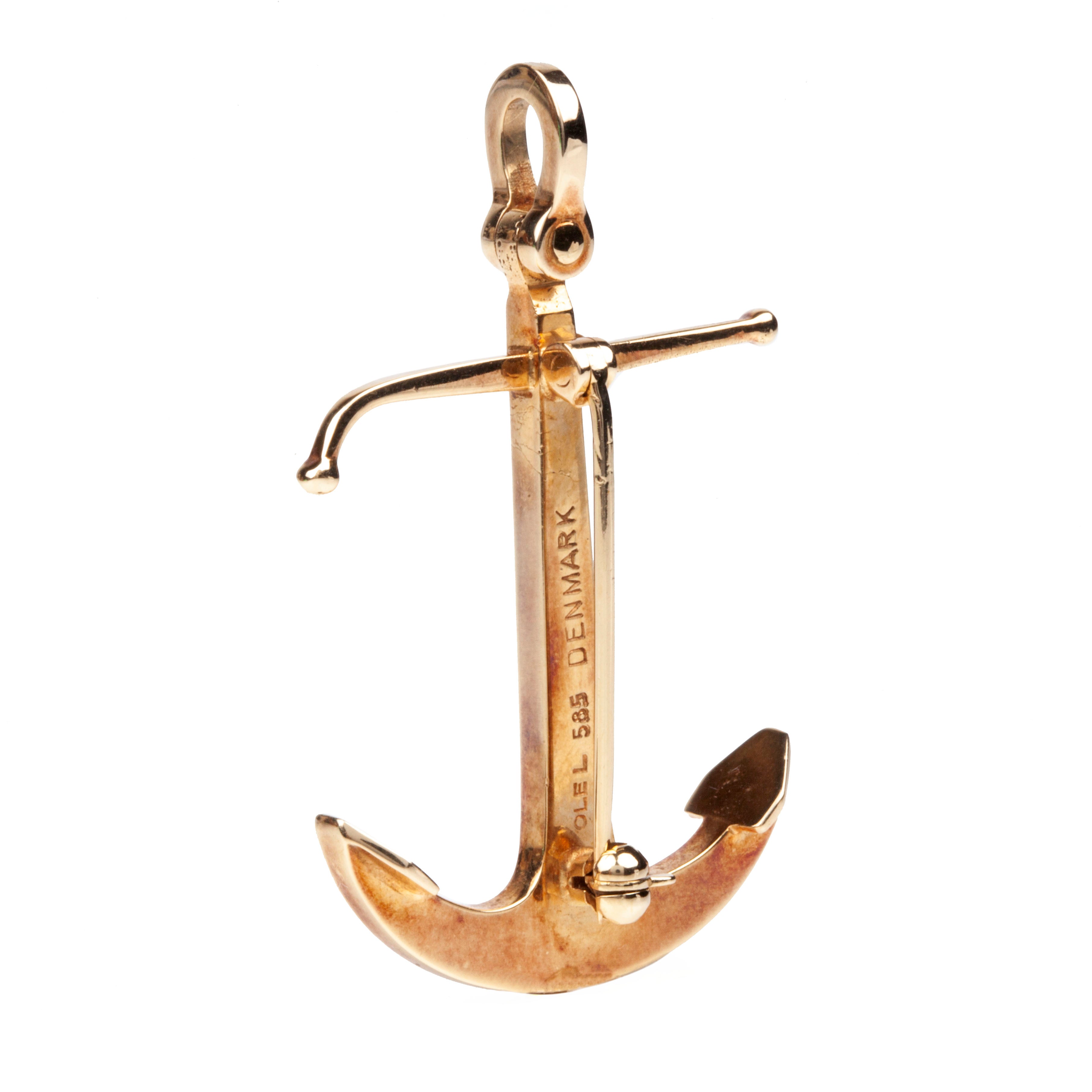 Late 19th Century anchor pendant and brooch, 14k gold. The Anchor, because of the great importance in navigation, was regarded in ancient times as a symbol of safety. It is often seen in 19th century jewelry symbolic of hope. Can be worn as a brooch or as a pendant. Hallmarks for Denmark.