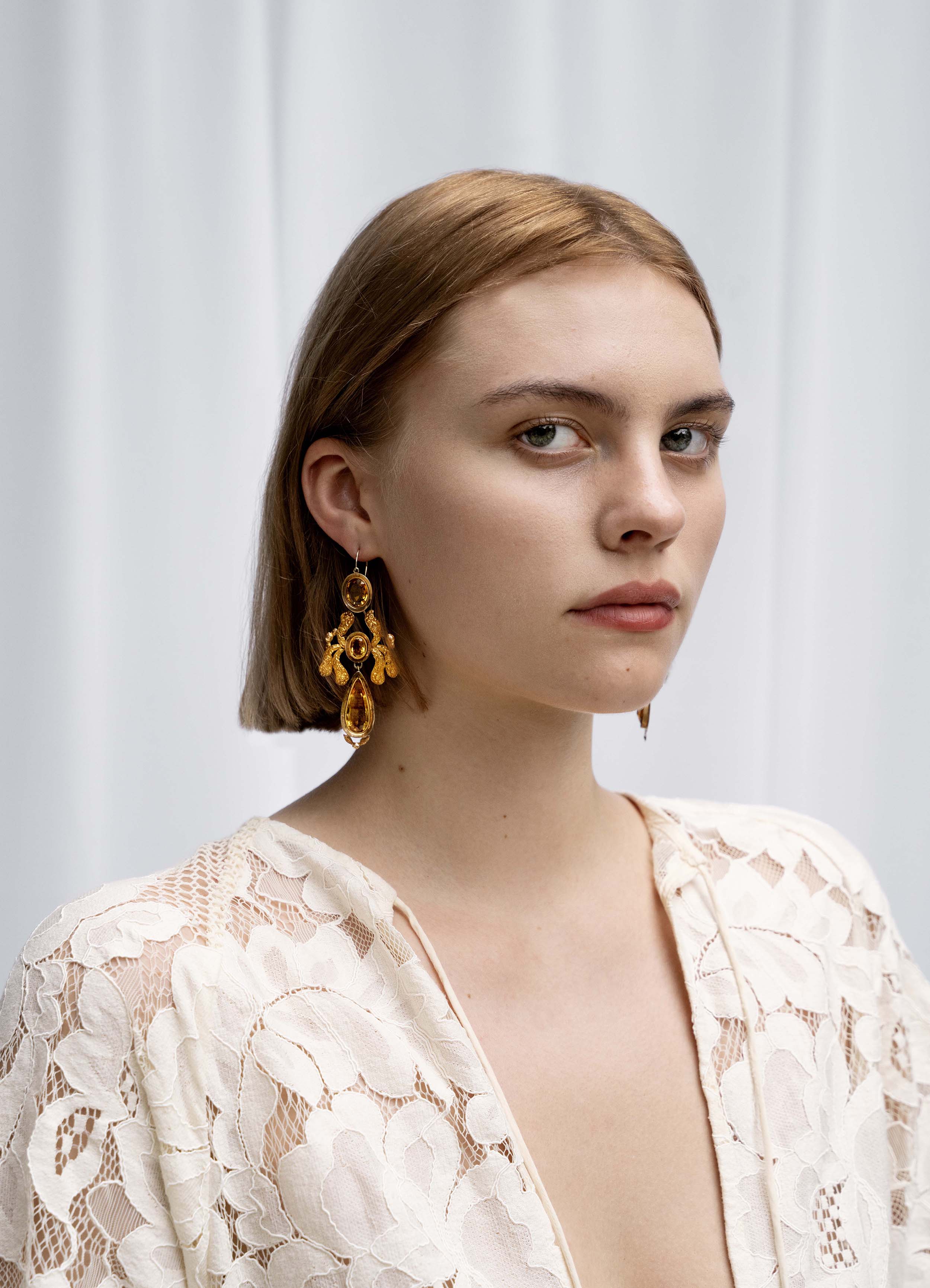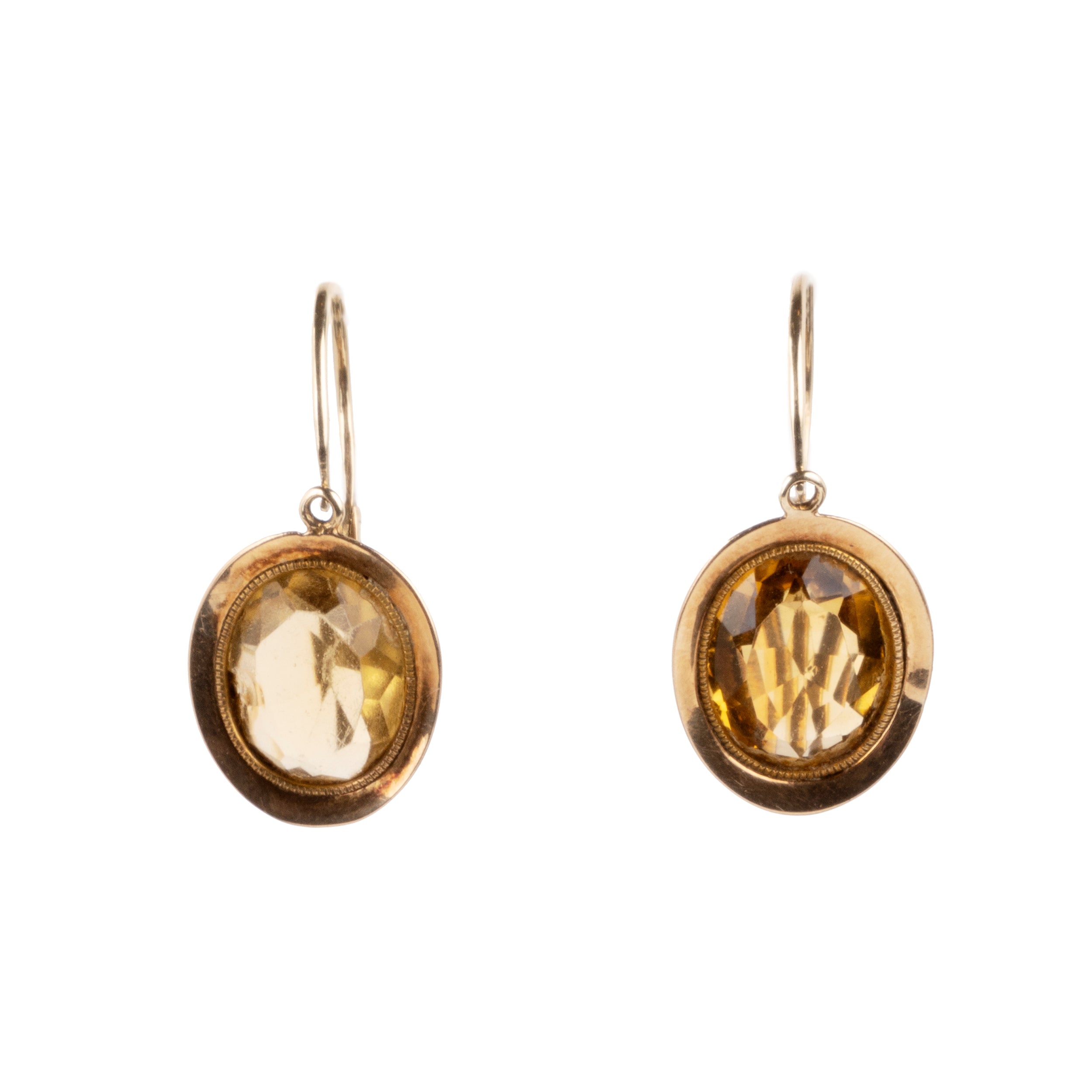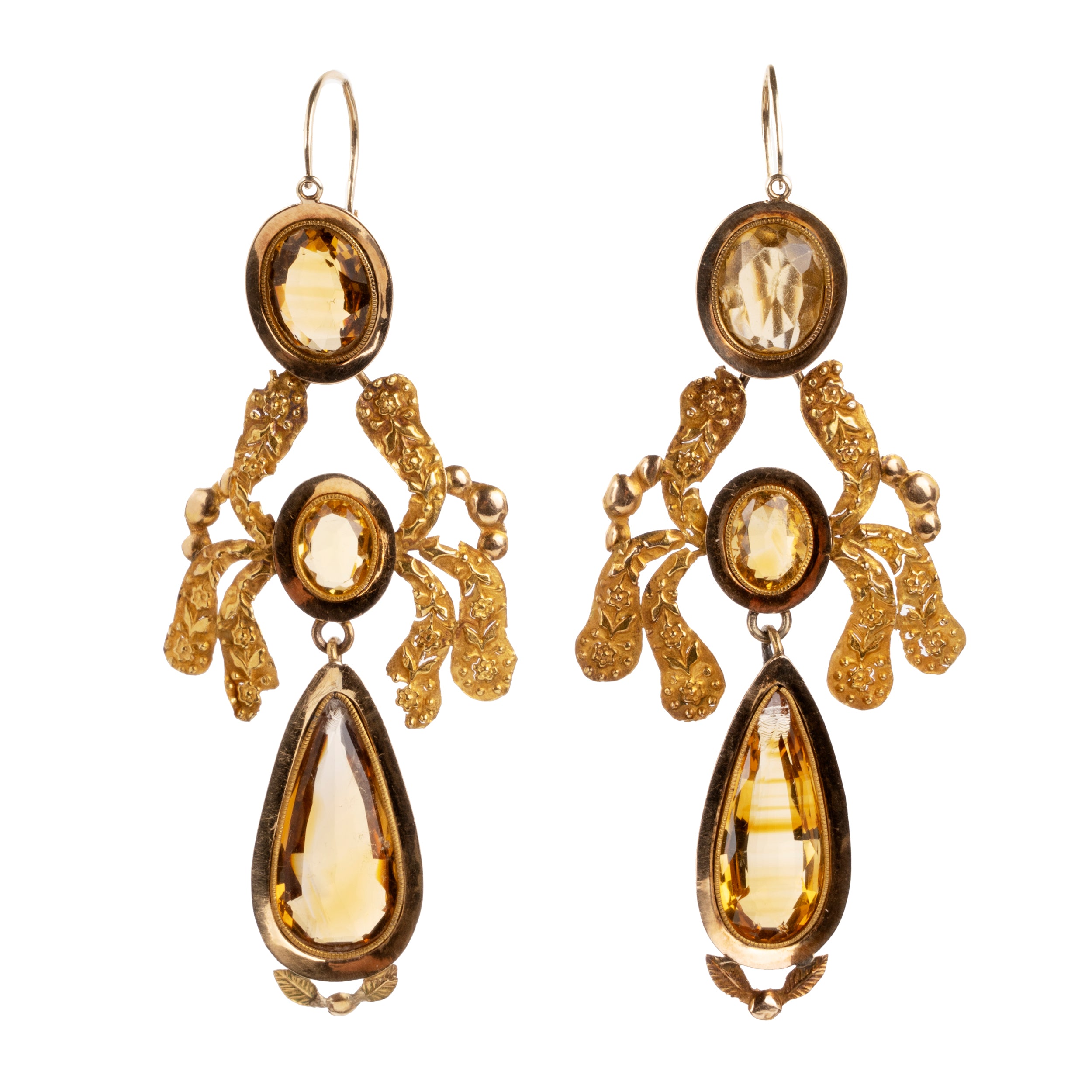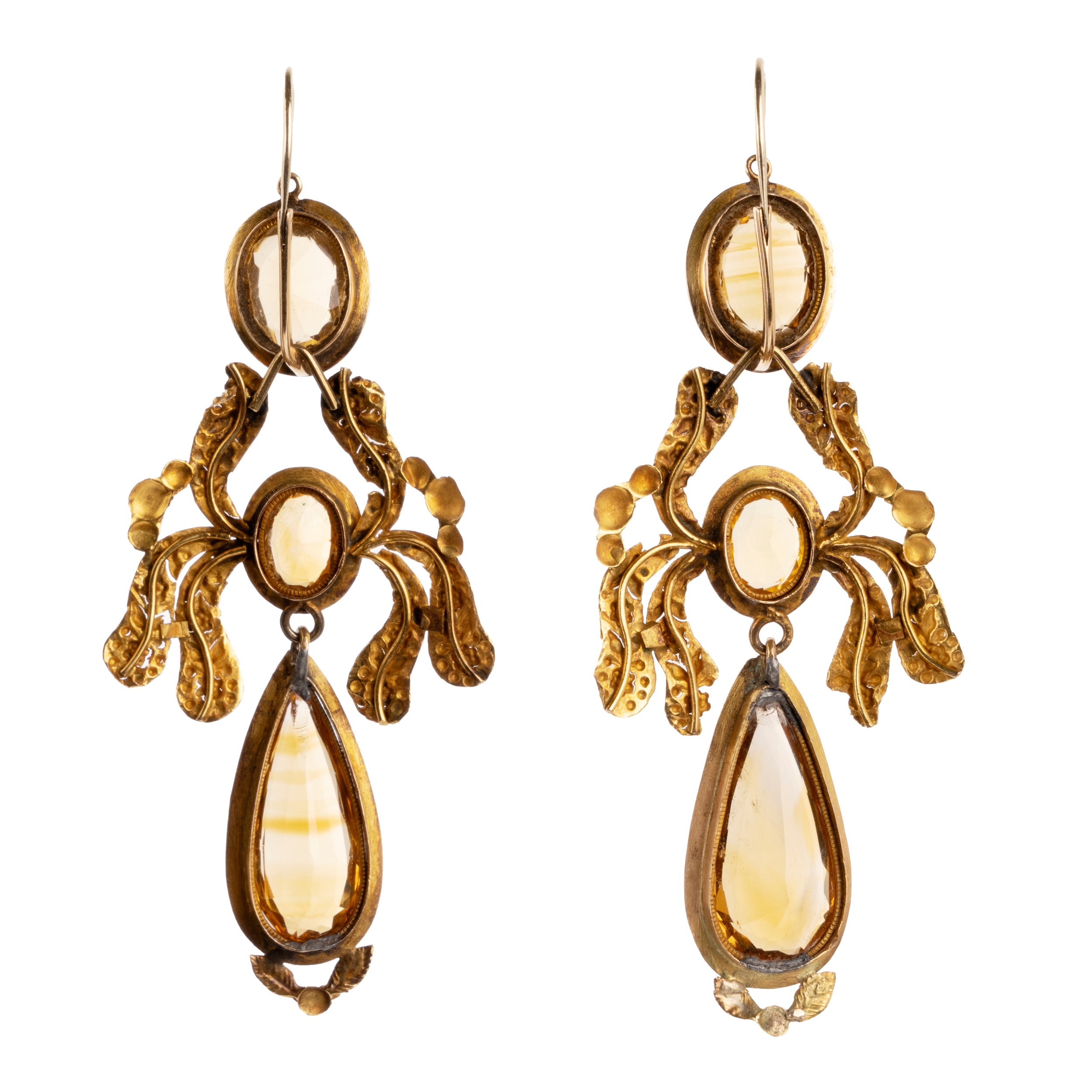 Delicate repoussé bows surround large citrine stones—an unusual pair of earrings in an abstract variation of a pendeloque shape. The elaborate drops can be removed, allowing the tops to be worn in reduced form. European in Origin. Circa 1830.